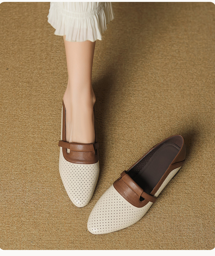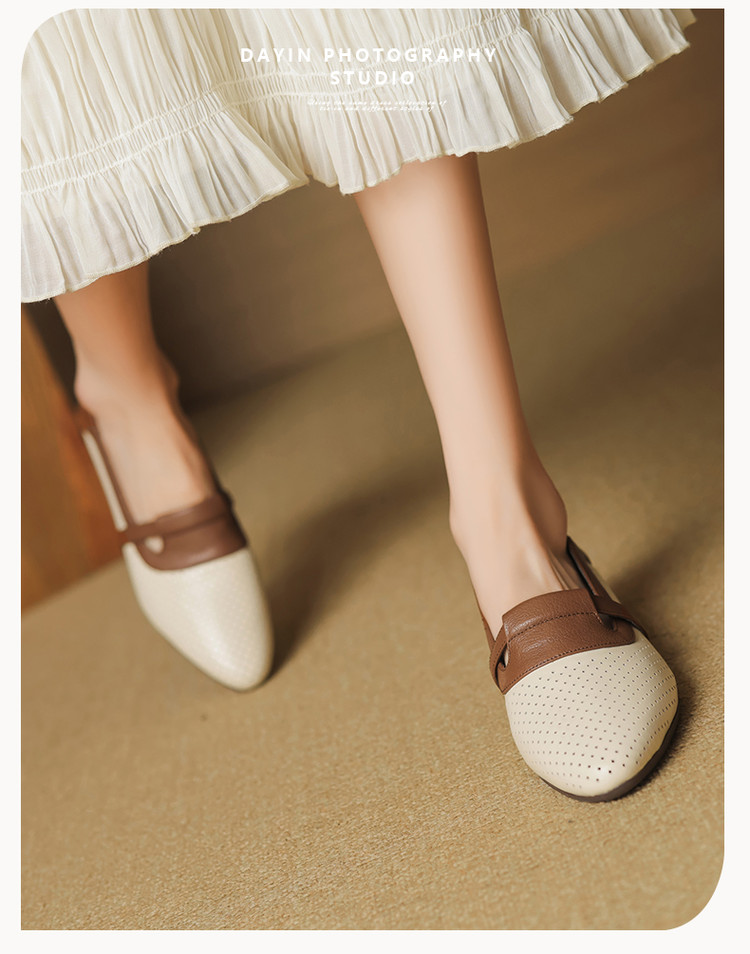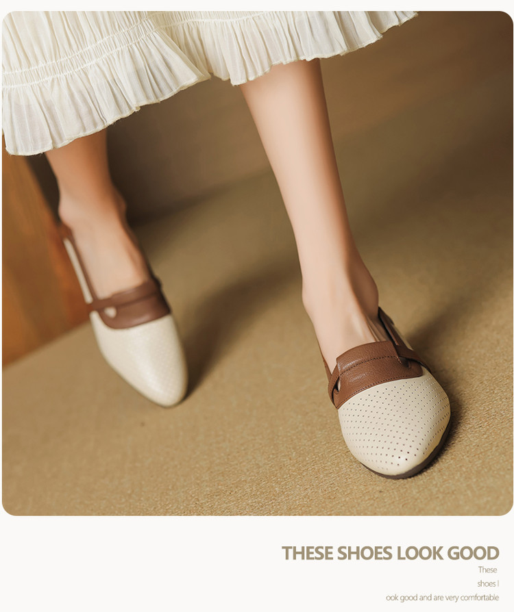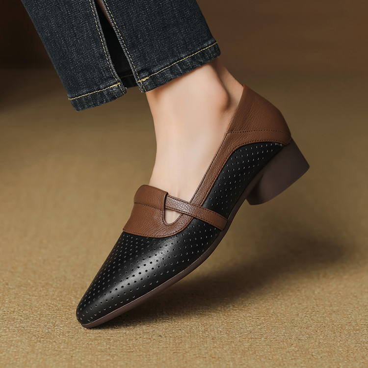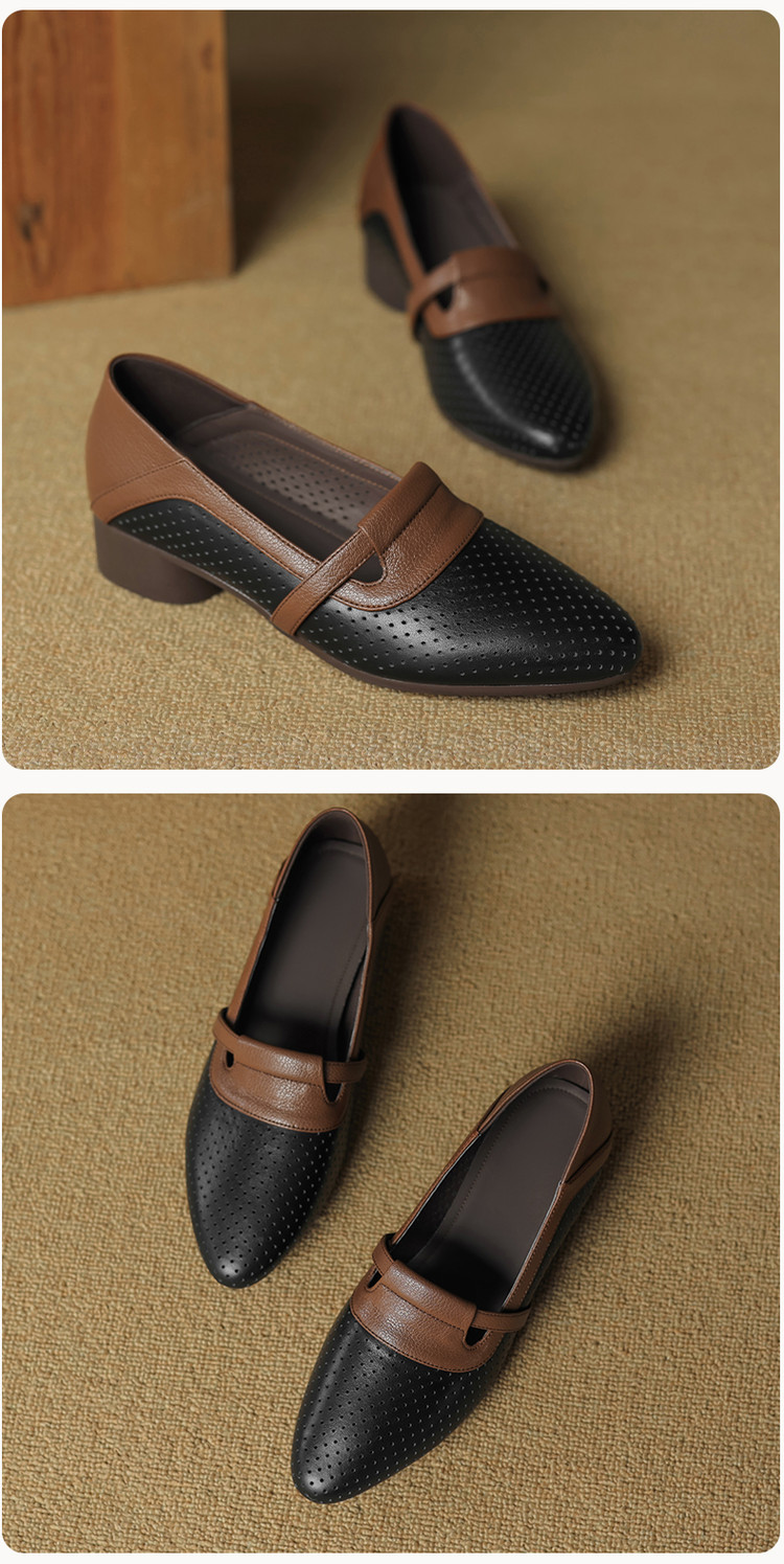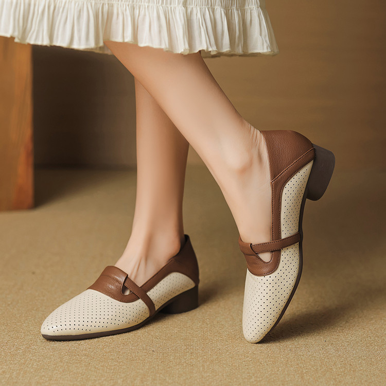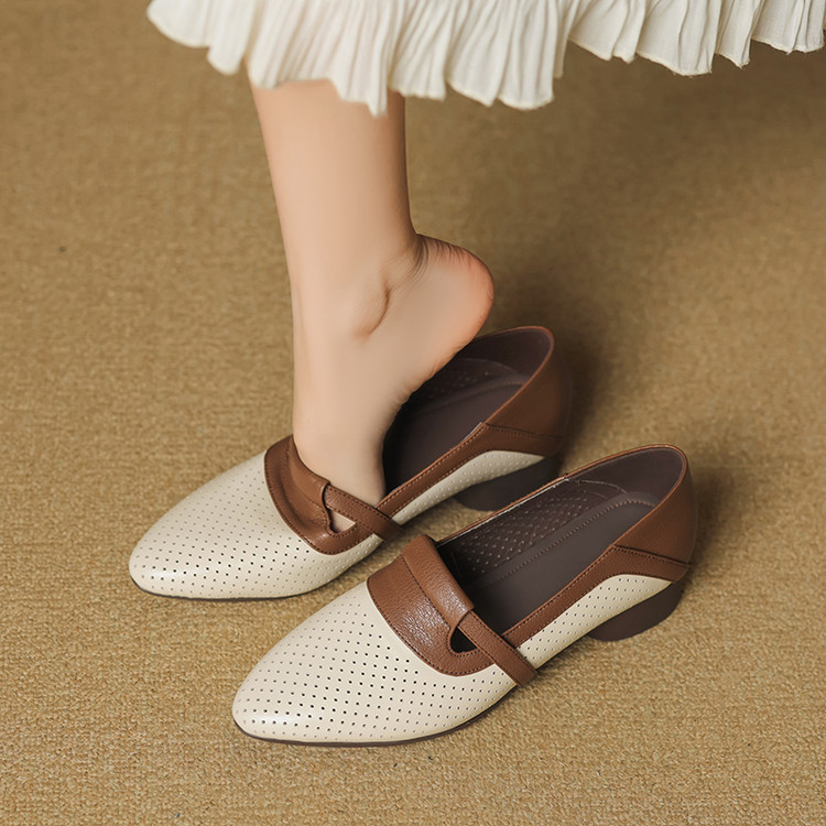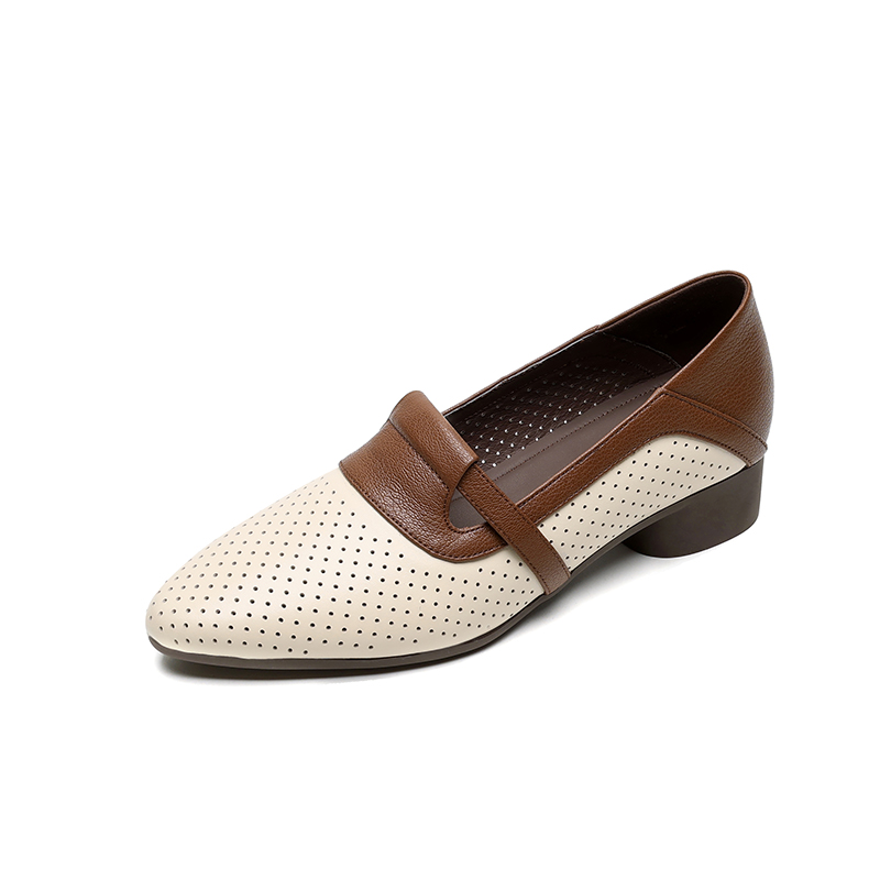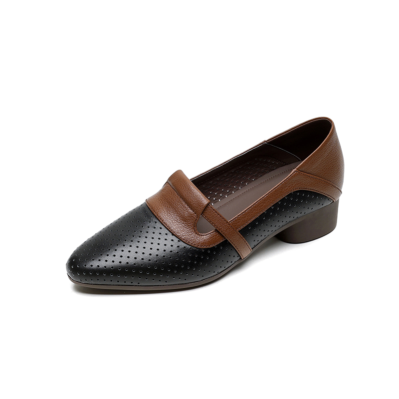 【预售5天】法式拼色软皮低跟单鞋女新款春季圆头中口洞洞鞋一脚蹬小皮鞋YCJX&H-7395