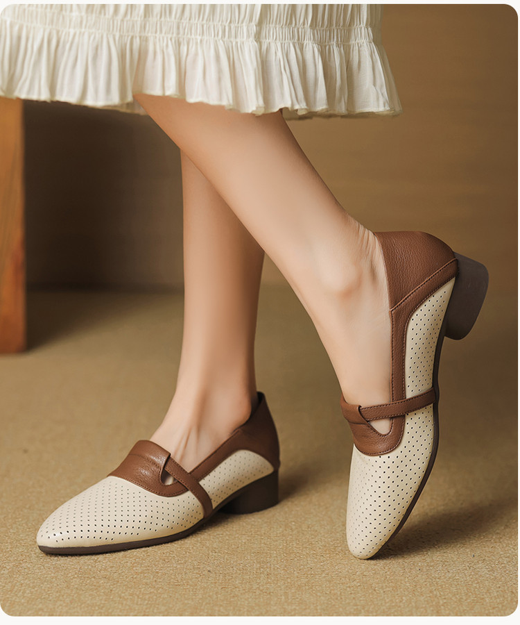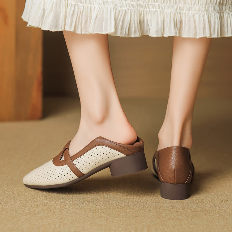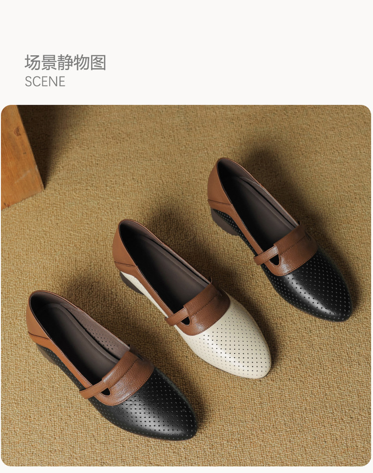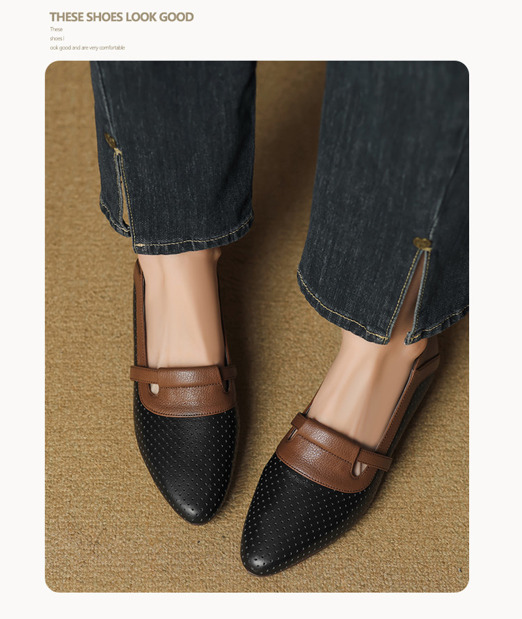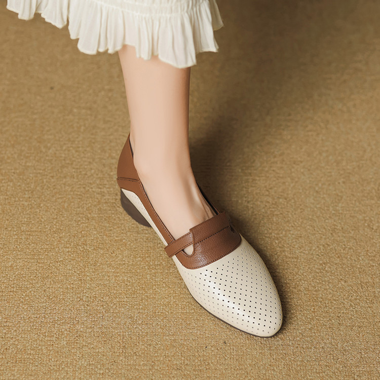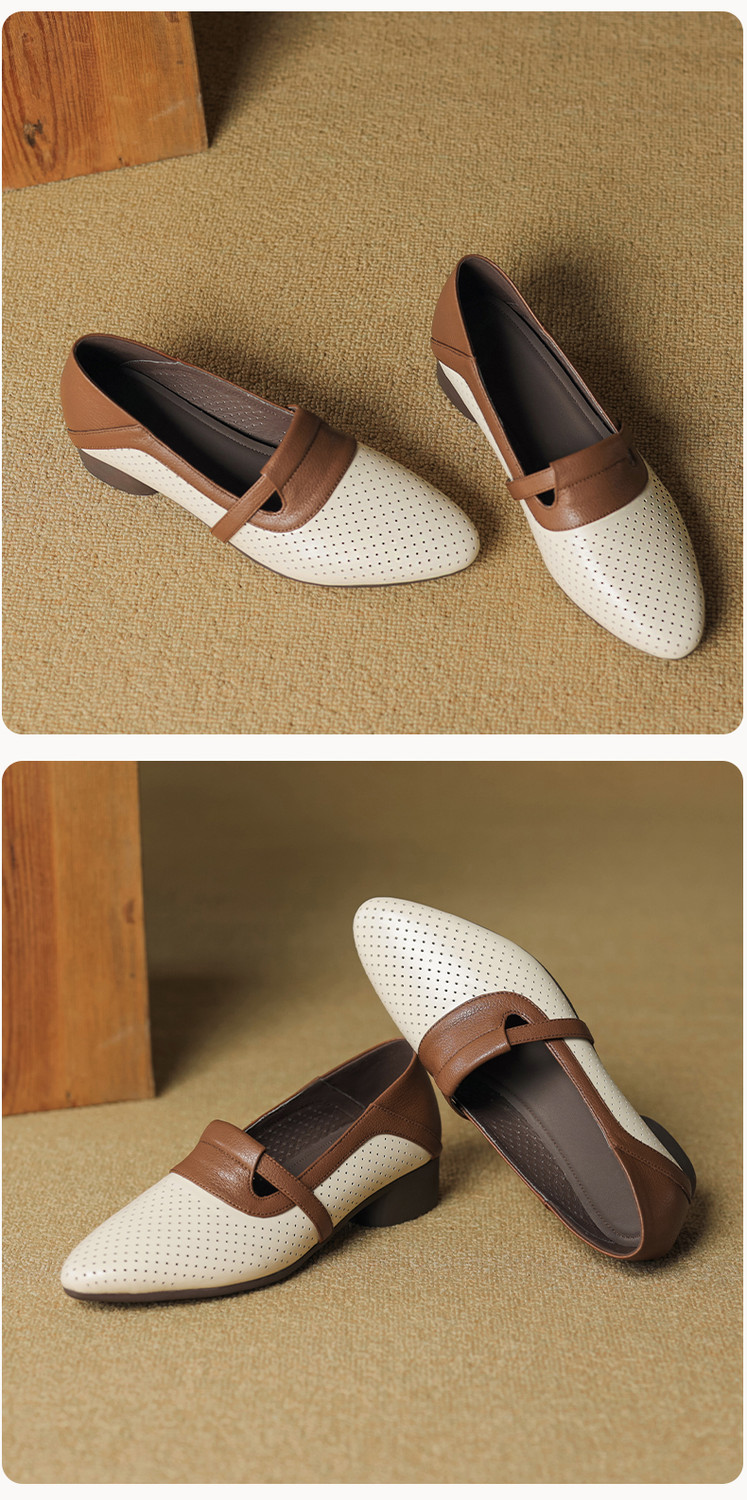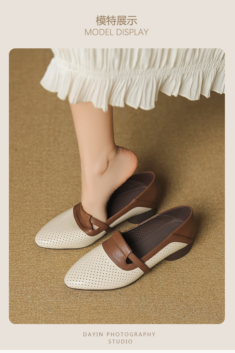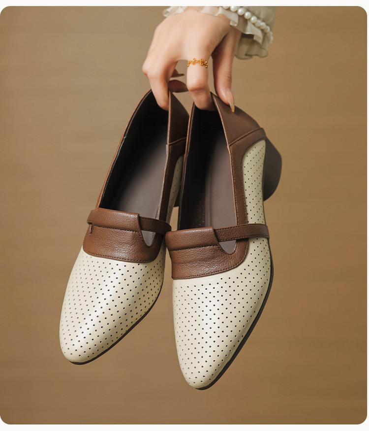 【预售5天】法式拼色软皮低跟单鞋女新款春季圆头中口洞洞鞋一脚蹬小皮鞋YCJX&H-7395