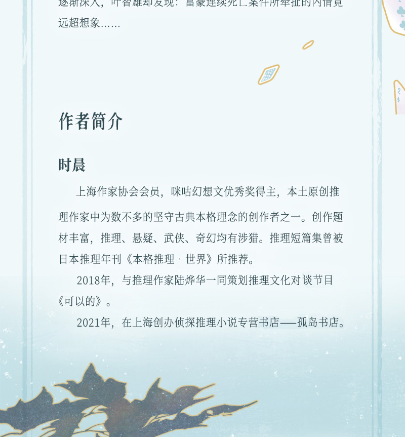 时晨,上海作家协会会员,咪咕幻想文优秀奖得主,本土原创推理作家中为数不多的坚守古典本格理念的创作者之一。创作题材丰富,推理、悬疑、武侠、奇幻均有涉猎。推理短篇集曾被日本权威推理年刊《本格推理•世界》所推荐。