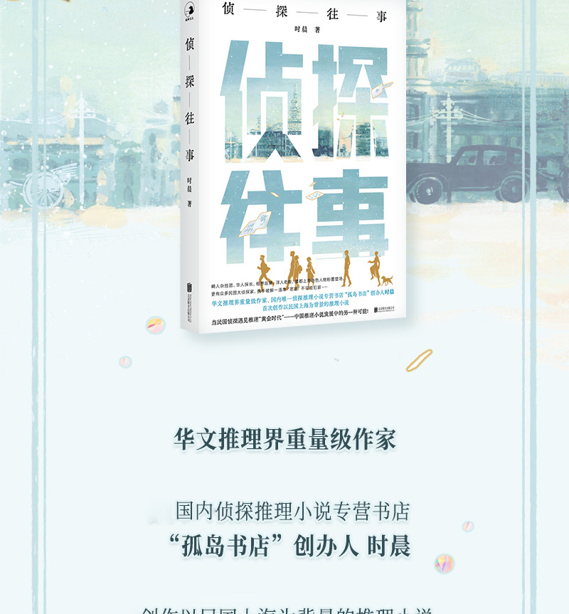 ★上海作家时晨首次尝试创作民国风侦探小说。《侦探往事》以20世纪30年代初的上海滩为舞台,以一连串可疑的富豪“自杀”案为开端,引出了这座“魔幻之都”中形形色色的人物和团体:租界巡捕、洋人老板、畸人杂技团……当然,更有以民国侦探小说中的名侦探为原型的众多大侦探家!