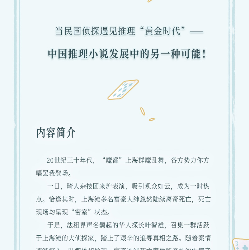 于是,法租界声名鹊起的华人探长叶智雄,召集一群活跃于上海滩的大侦探家,踏上了艰辛的追寻真相之路。随着案情逐渐深入,叶智雄却发现:富豪连续死亡案件所牵扯的内情竟远超想象……