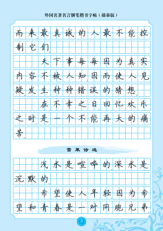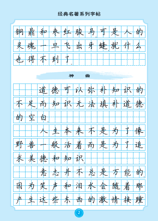 本字帖由书法家辛文彬书写,选取外国名著名言中脍炙人口的内容集结成册,内容精湛。范字书写规范,结构匀称,通俗易练。本书封面特设二维码,配以名师写字教学视频,让读者轻松练好字的同时,又能巩固阅读成果,汲取名著精华,感受经典的永恒魅力。