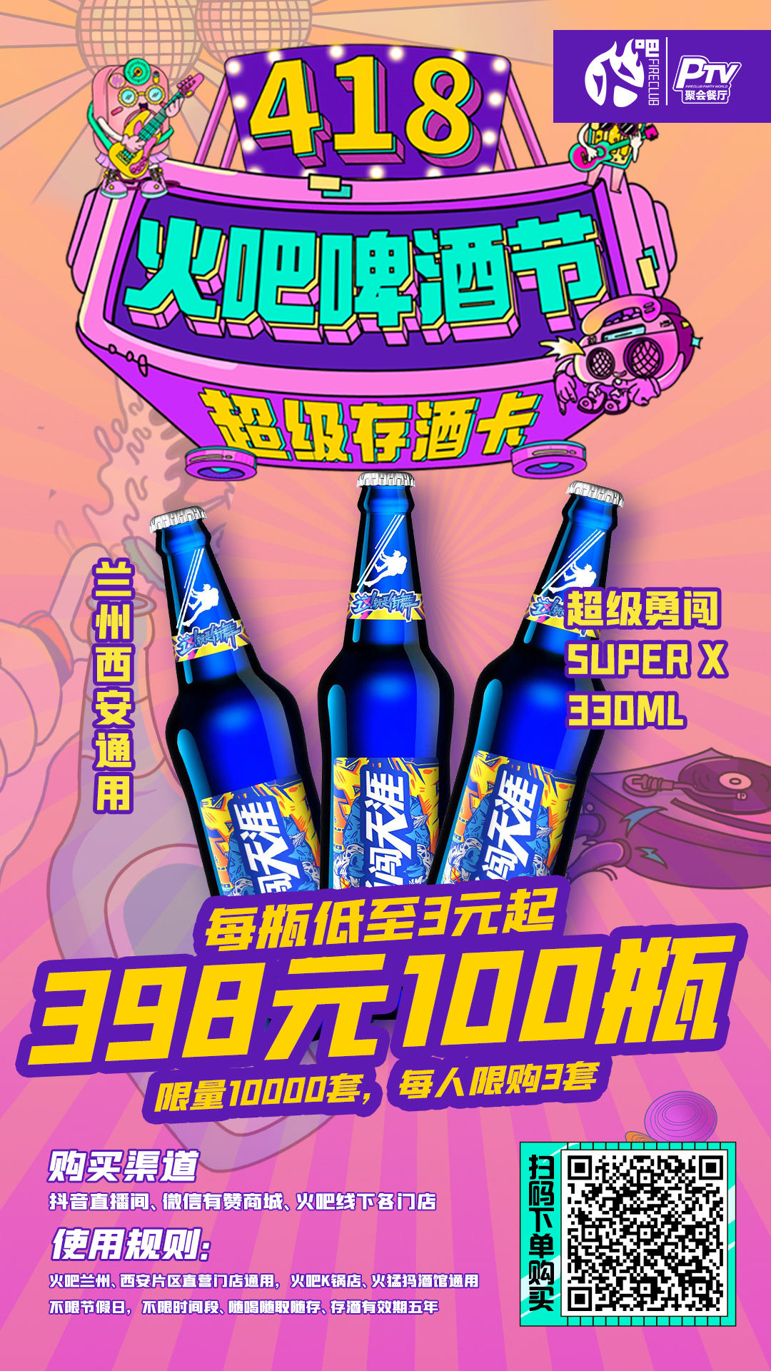 兰州西安通用-4月18日火吧啤酒节—超值存酒卡来了—398元100瓶雪花超勇啤酒