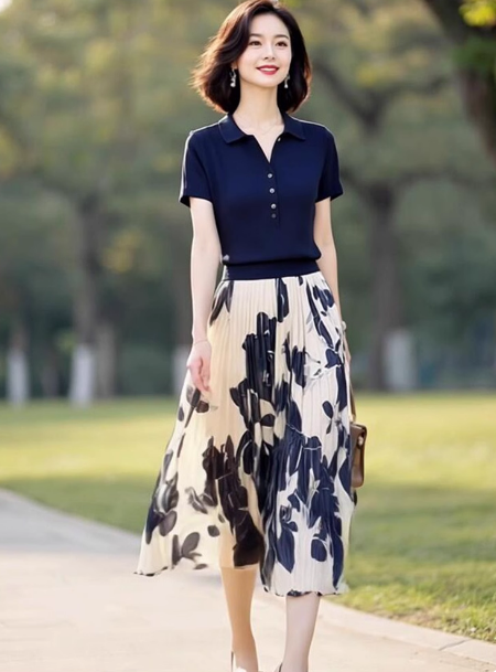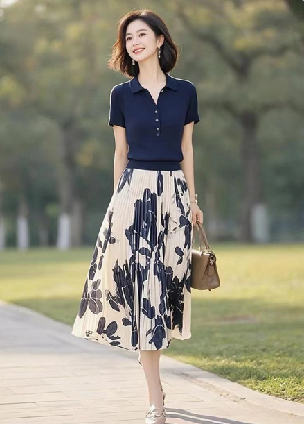 (预售8天)优雅气质冰丝翻领针织衫+时尚印花压褶半身裙套装LJX-847