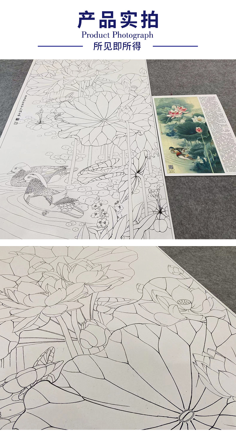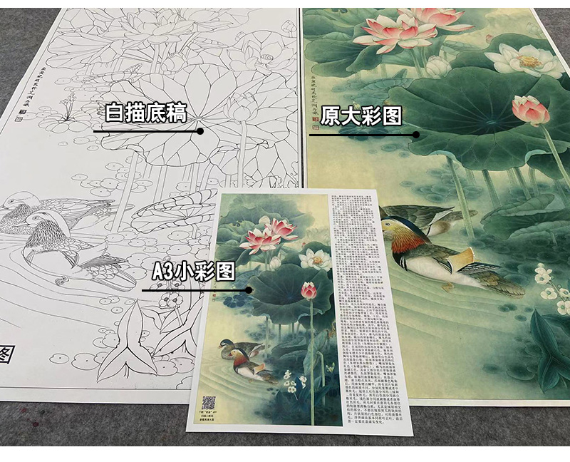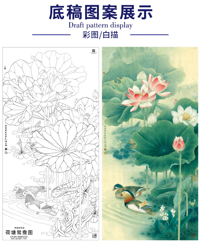 【有步骤、大彩图】李晓明工笔画白描底稿《荷塘鸳鸯图》荷花临摹勾线花鸟线稿KA15