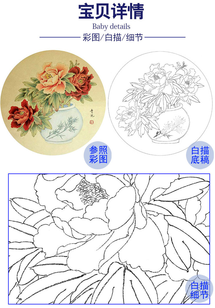 戴青池工笔花鸟白描底稿-牡丹小品-多种白描尺寸可选-DQ16