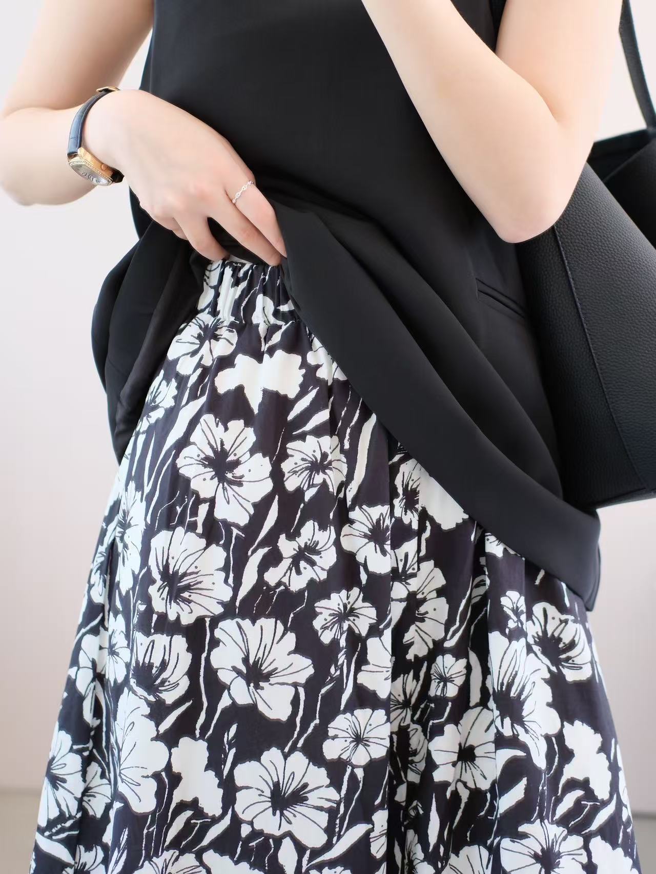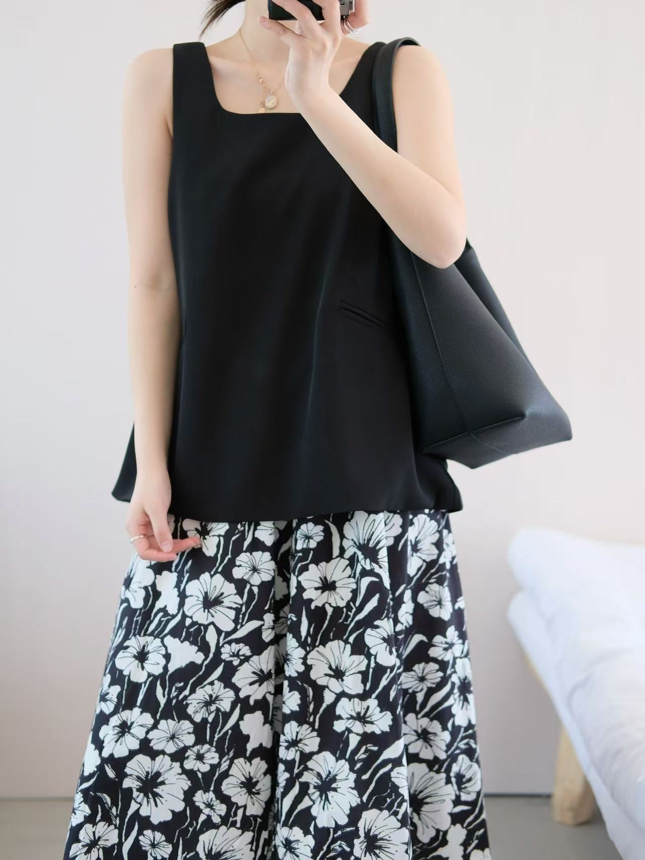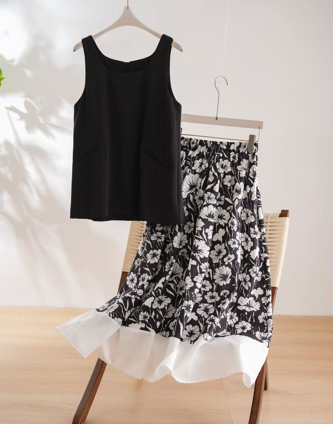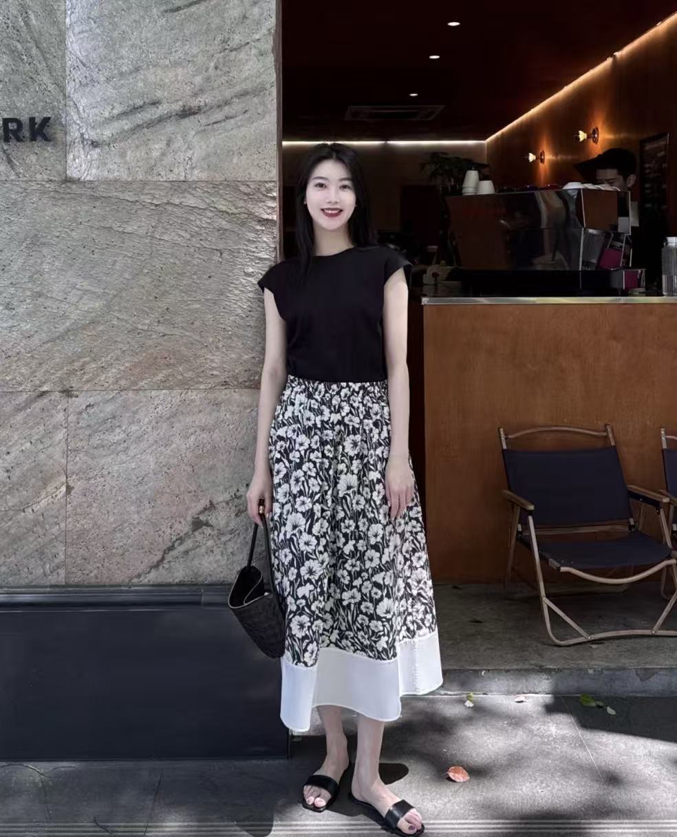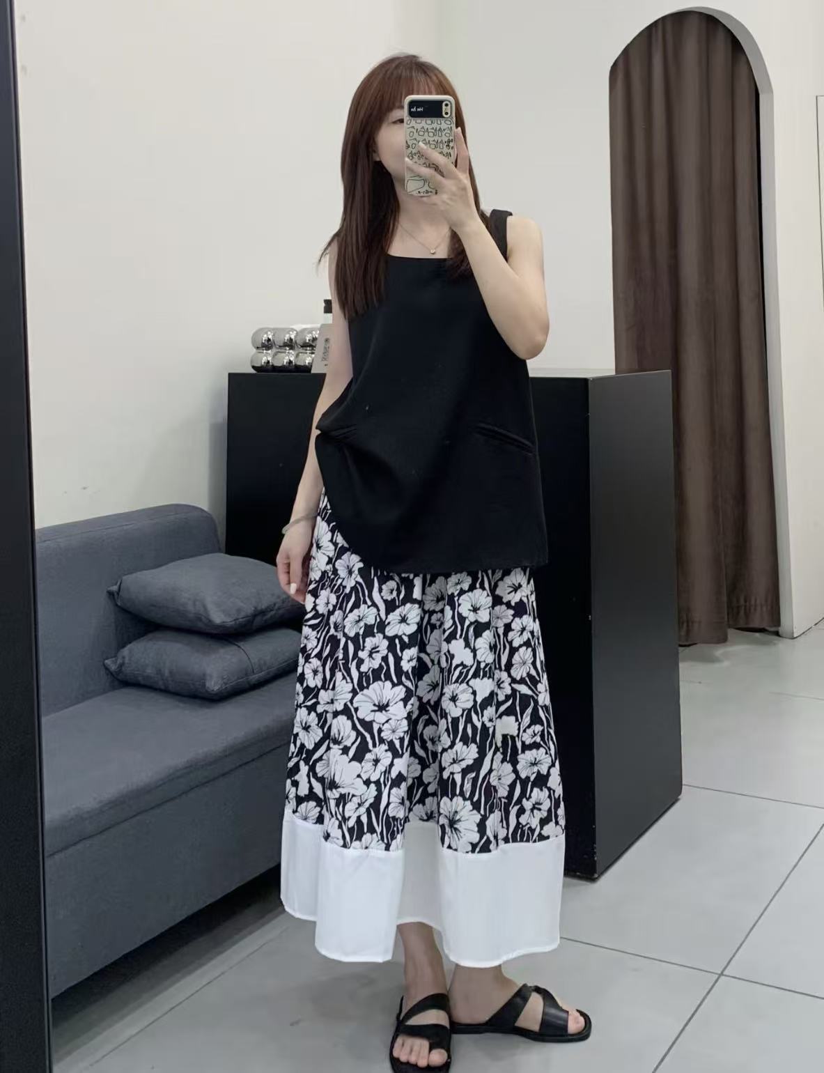 3-5天发【法式印花套装裙】 360度伞状印花半身裙➕黑色大u领背心上衣 面料爽滑有垂感,穿着舒适清凉!
