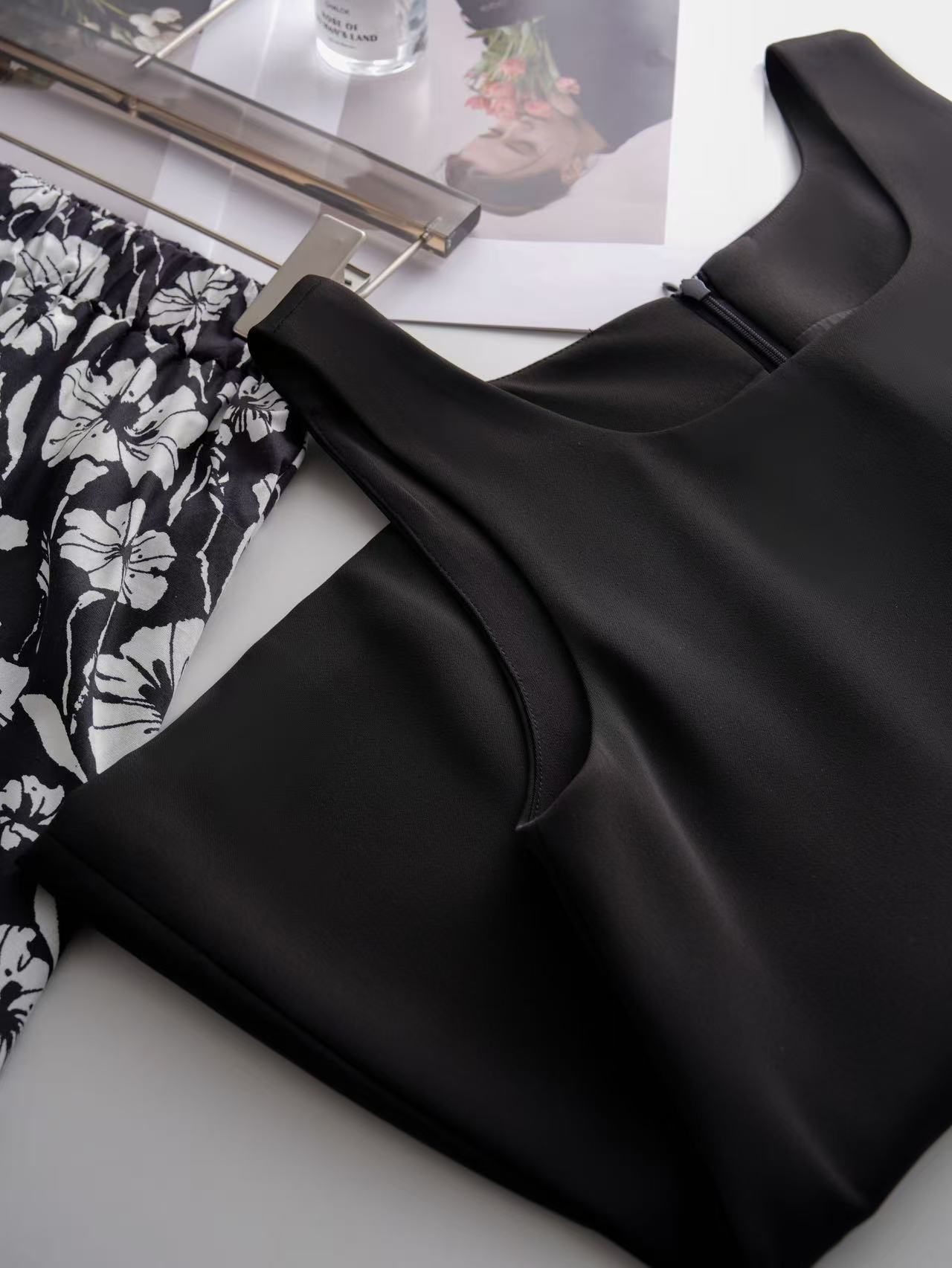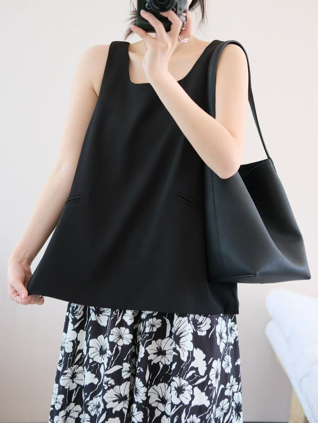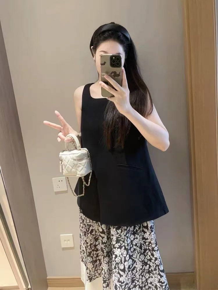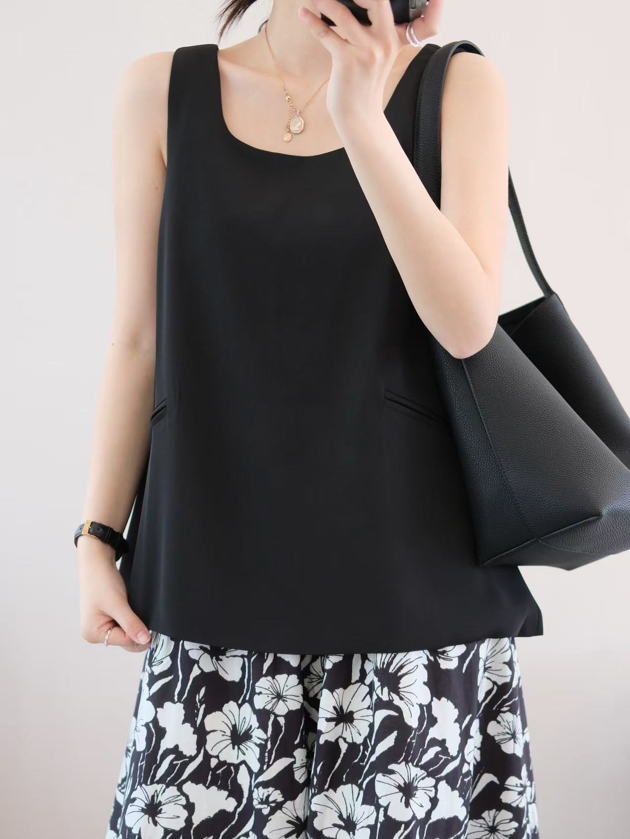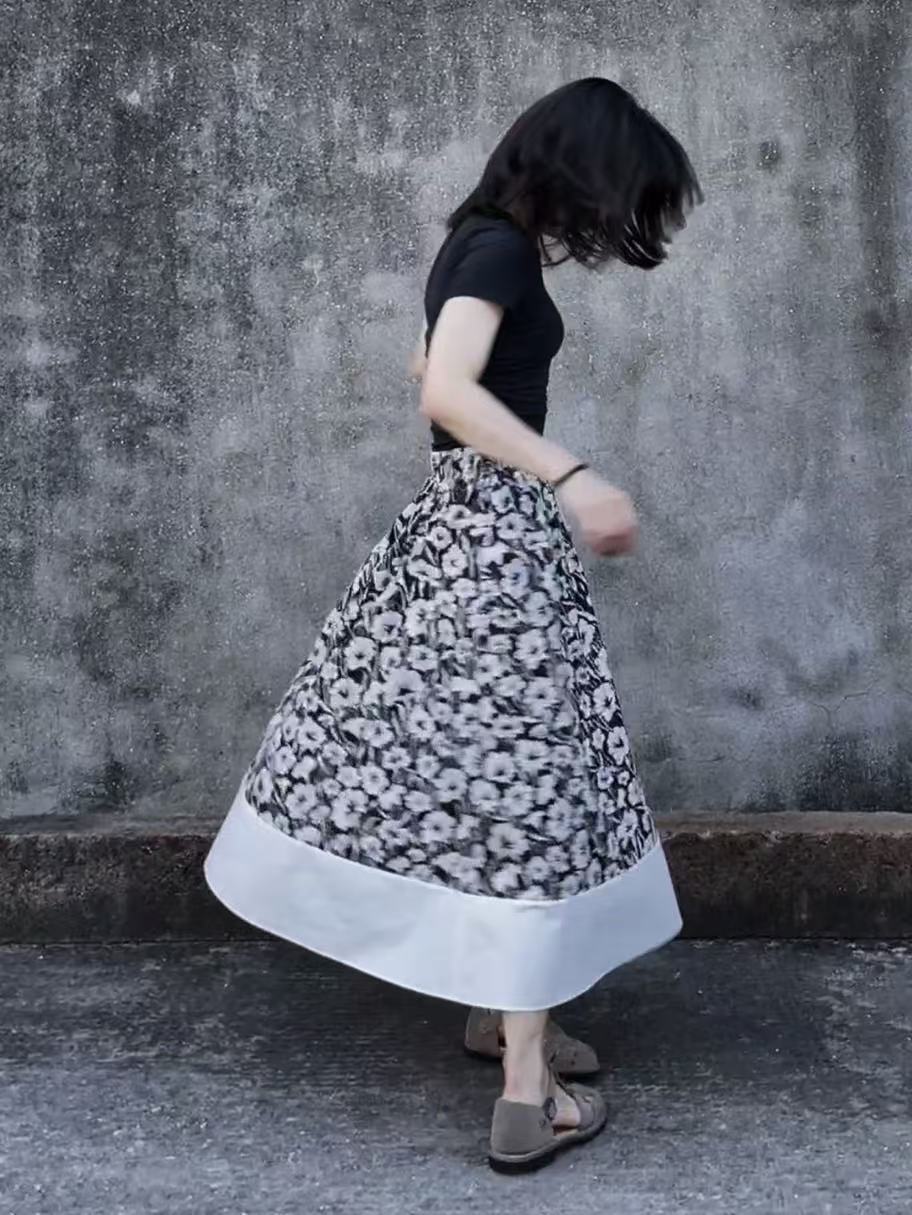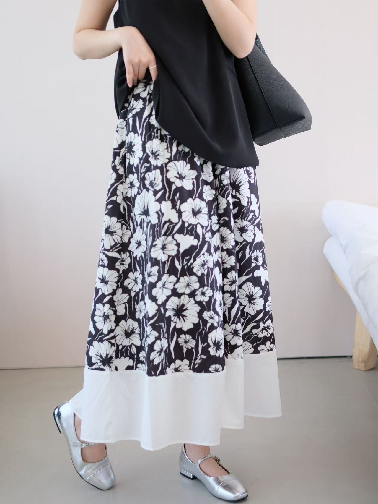 3-5天发【法式印花套装裙】 360度伞状印花半身裙➕黑色大u领背心上衣 面料爽滑有垂感,穿着舒适清凉!