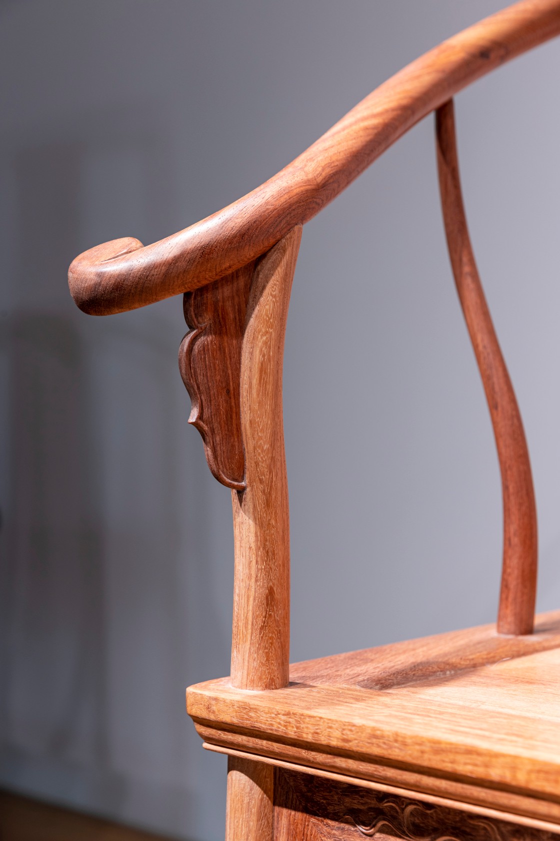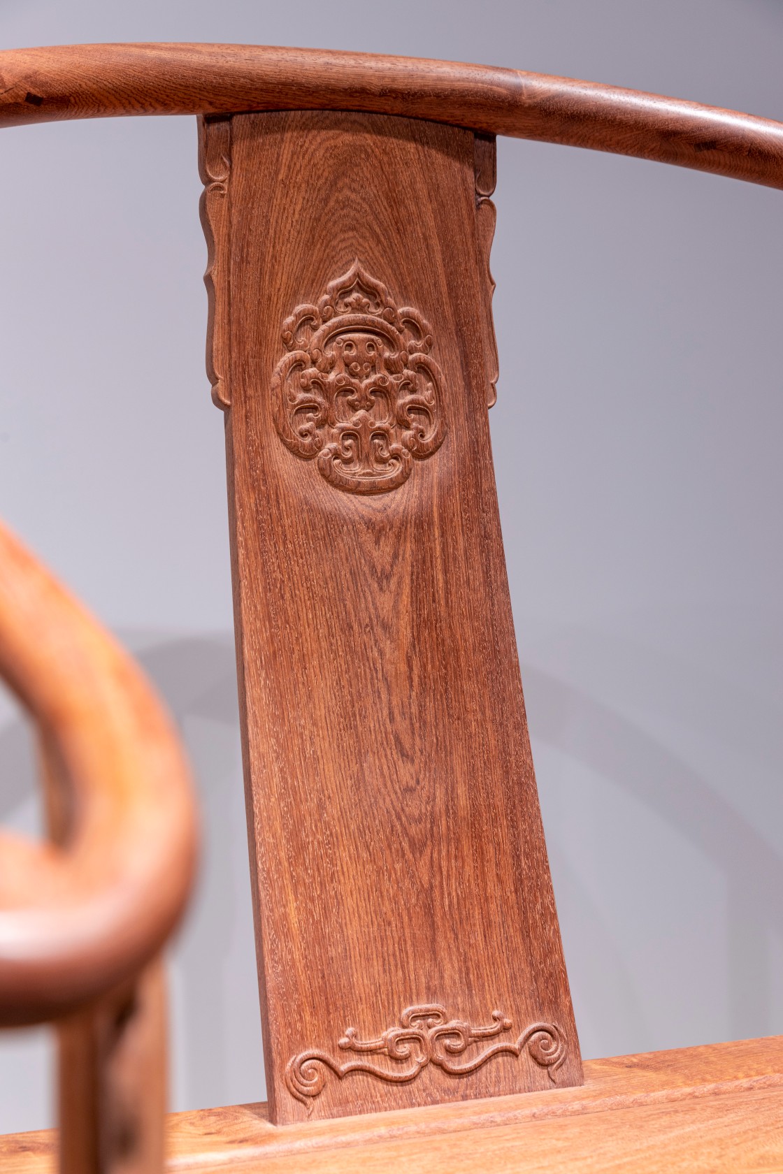 此款圈椅扶手收尾弯头见方,成圆钮形,靠背独板,上部减地刻团花卷叶塔刹纹,下部起阳线刻卷草纹亮脚,前后腿一木连做,鹅脖三弯,与扶手间嵌入小角牙,联帮棍上细下粗,柔美考究。座面攒边打槽装独板面芯,边抹冰盘沿,座面下正面及两侧为壸门券口牙子,沿边起饱满阳线,正面牙板上浮雕缠枝莲纹,四足间装步步高赶枨,整体风格威严不凡,又舒展圆融。