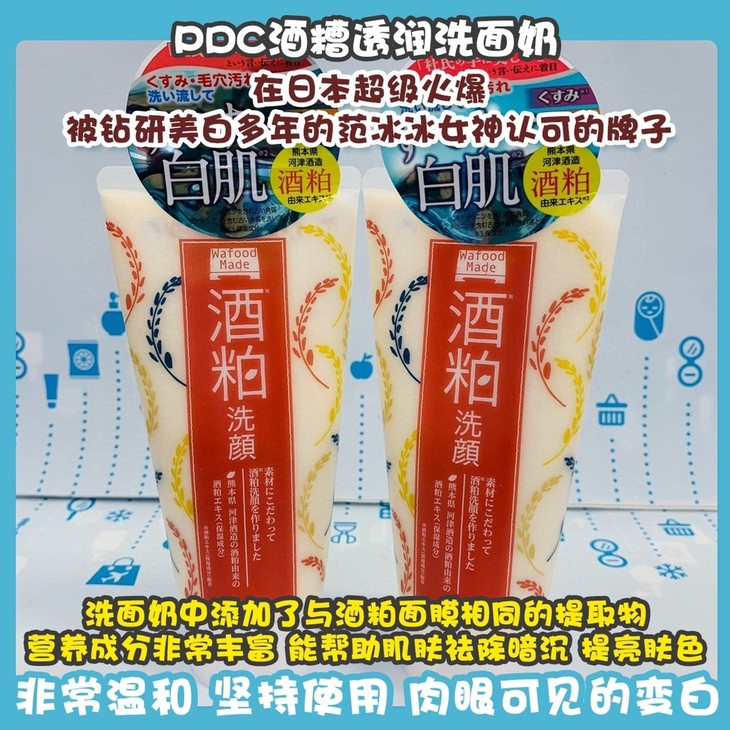 PDC酒糟透润洗面奶👍在日本超级火爆🔥,被钻研美白多年的范冰冰女神认可的牌子✔!洗面奶中添加了与酒粕面膜相同的提取物💧,营养成分非常丰富。能帮助肌肤祛除暗沉,提亮肤色✨。脸上有新生痘印、斑点,都可以得到很好的改善💆。保湿效果也很nice💦,氨基酸质地,绵密的泡沫☁,上脸清爽又舒适,非常温和~坚持使用,肉眼可见的变白!