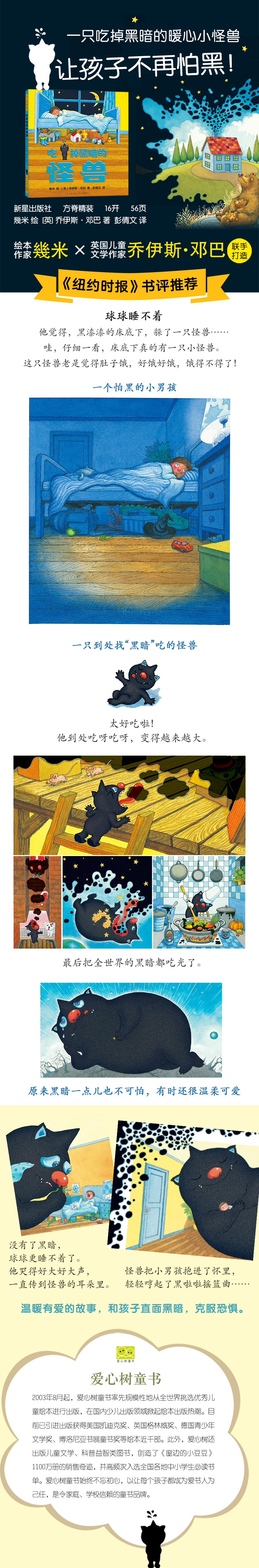 很多孩子都怕黑,这个充满想象力的故事让黑暗具体可感:黑暗是美味的引得怪兽吃光光,黑暗是流动的可以让怪兽变大变小,黑暗是不可替代的没有它世界将乱成一团……颠覆常规的奇妙想象让孩子看到黑暗的重要性,鼓励孩子接纳黑暗,和黑暗默契相处。