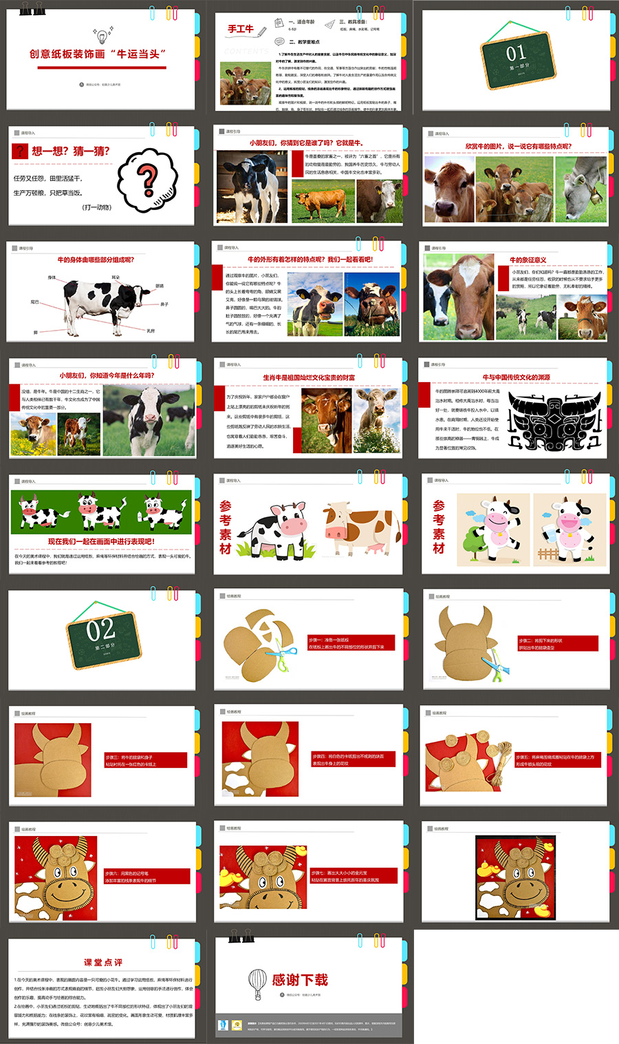 1.了解牛在生活生产中对人的重要贡献,以及牛在中华民族传统文化中的象征意义,加深对牛的了解,激发创作的兴趣。