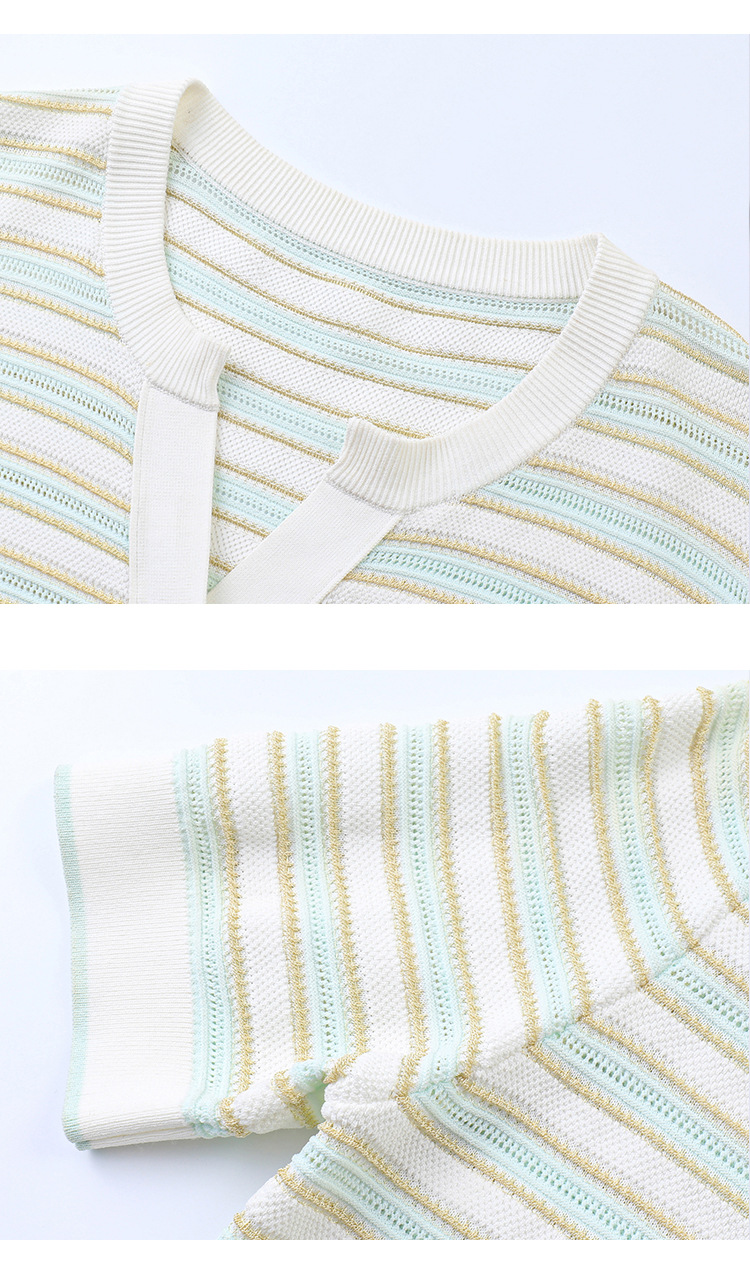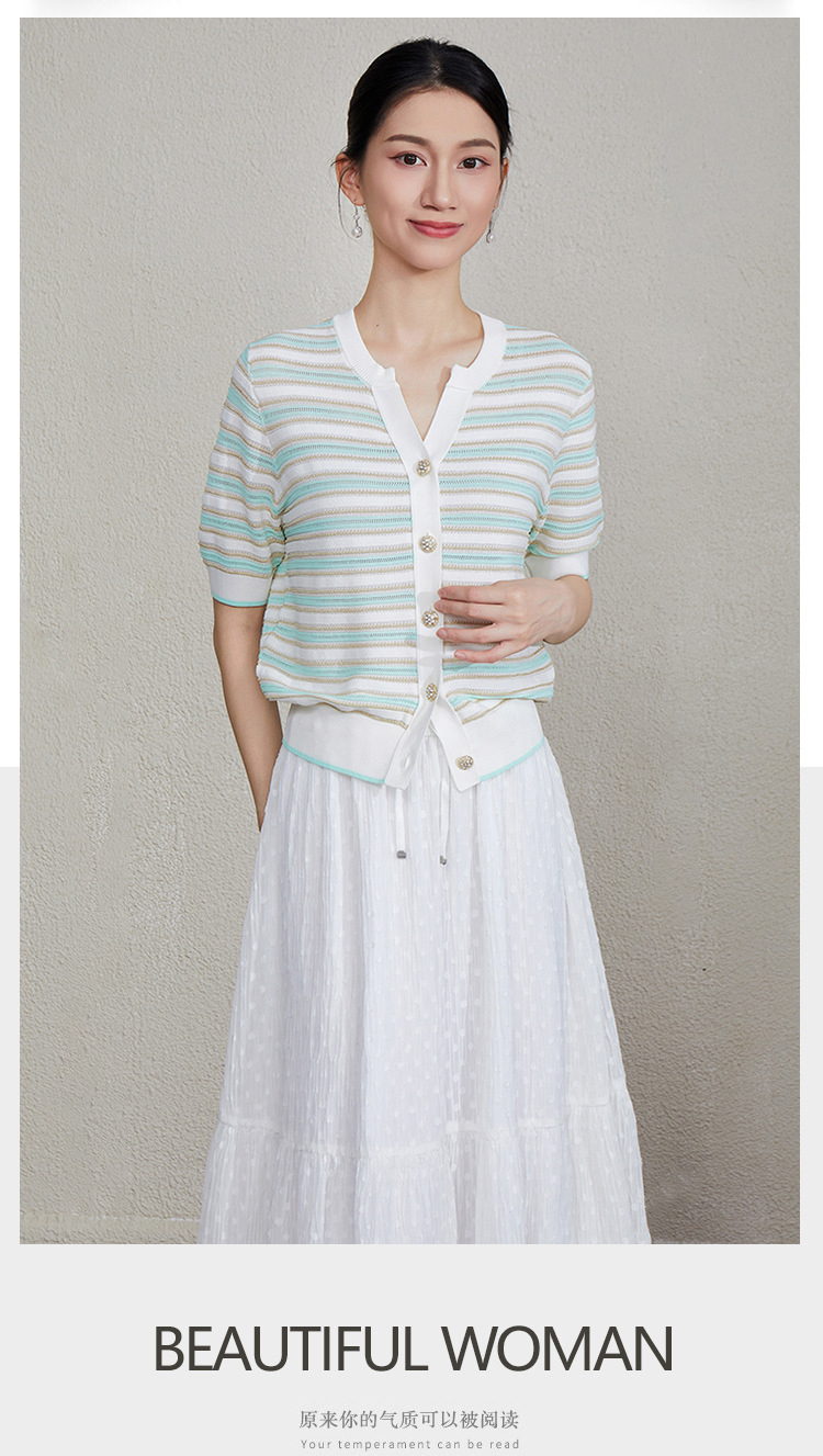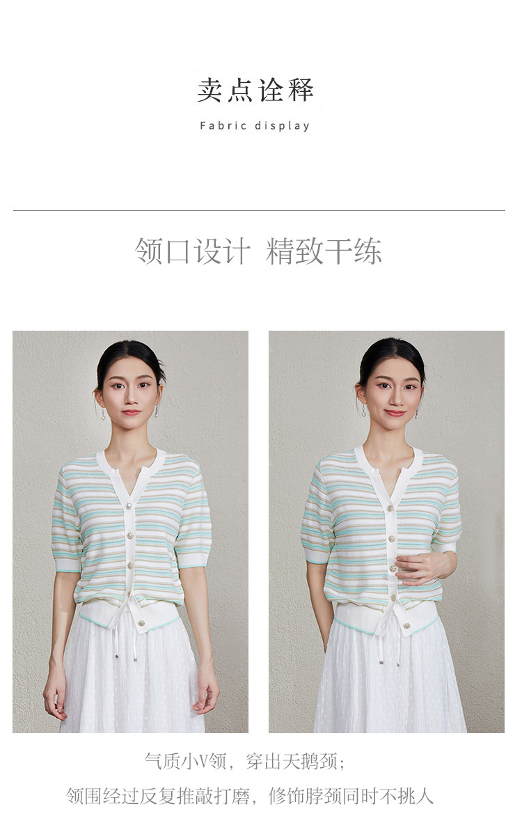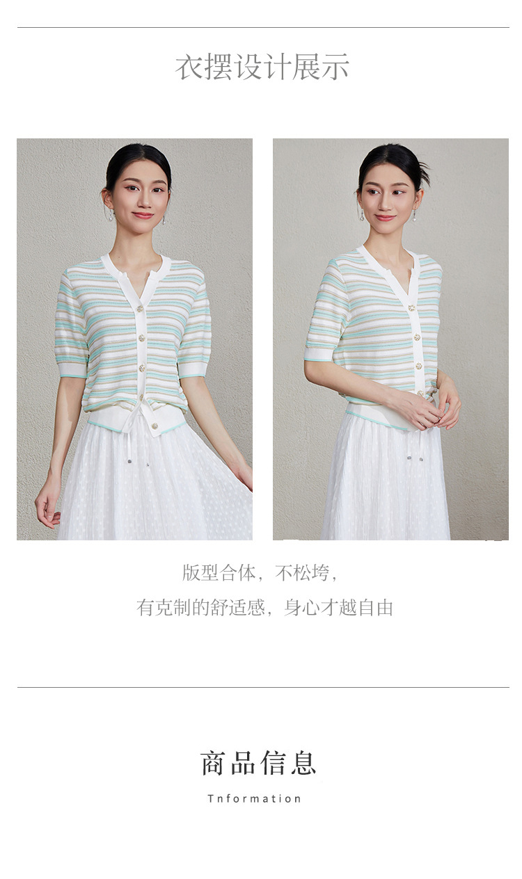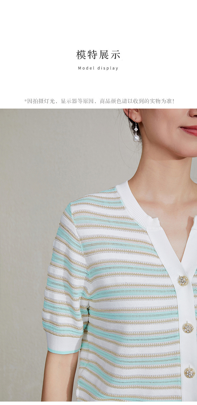 「自」全新升级【铂金会员275/天猫369/差价94】(80940)洛诗琳夏季新款V领撞色通勤百搭气质条纹镂空针织开衫女