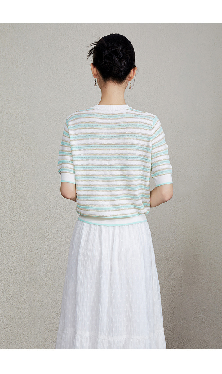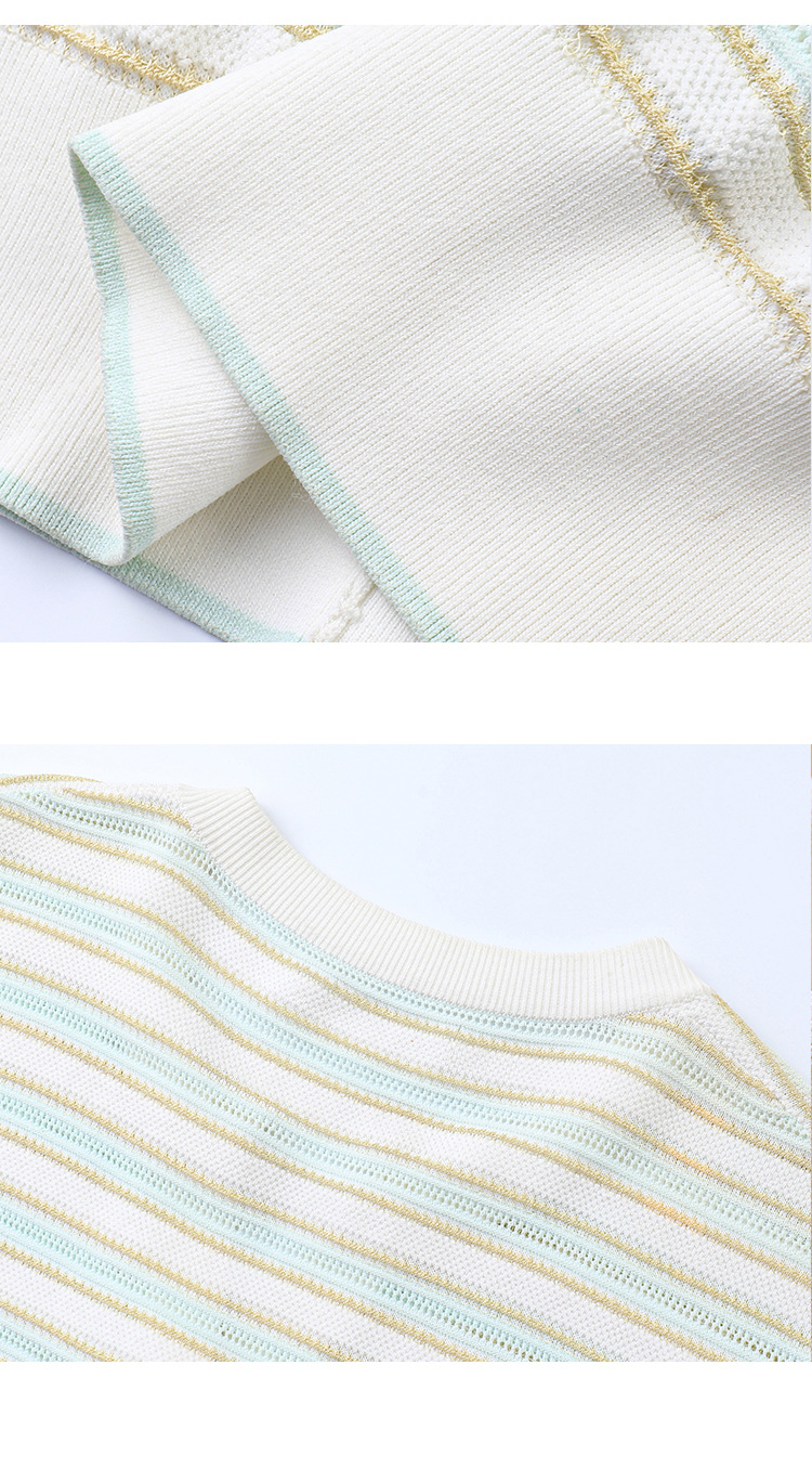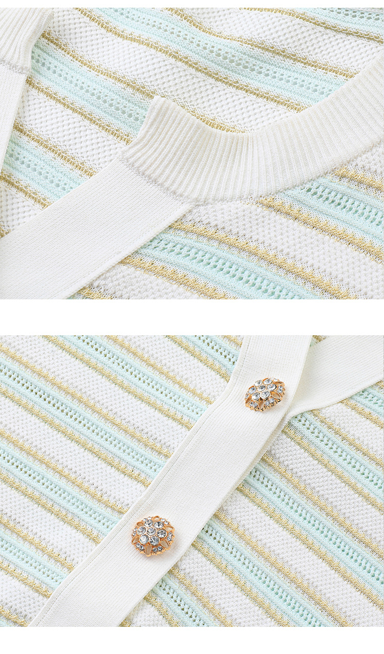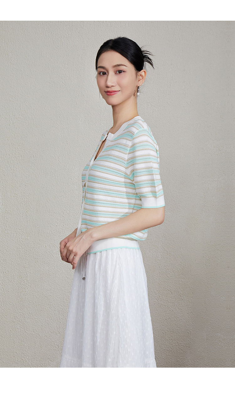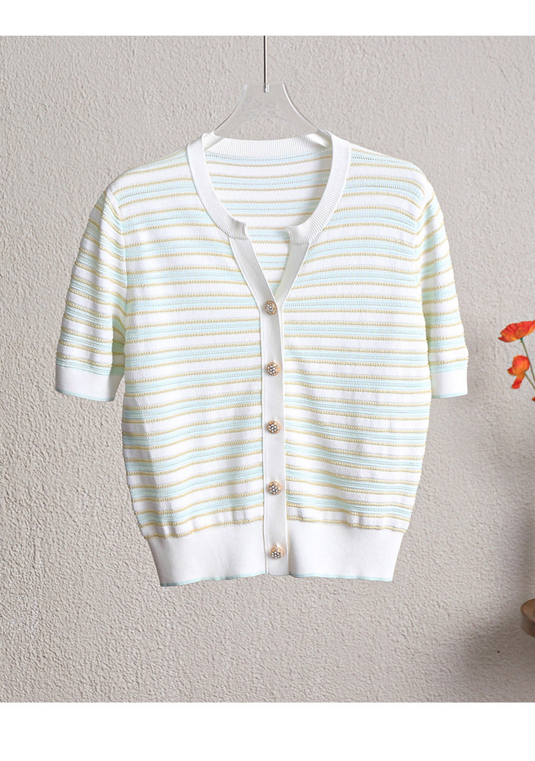 「自」全新升级【铂金会员275/天猫369/差价94】(80940)洛诗琳夏季新款V领撞色通勤百搭气质条纹镂空针织开衫女