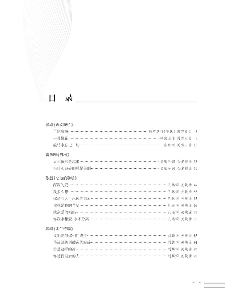 《中国歌剧百年——精选唱段集萃》以年代为编辑原则分为九册,涵盖了20世纪20年代至2018年创作的117部歌剧,366首唱段。乐谱均以五线谱记谱,并全部配有钢琴伴奏谱;曲谱后有作品简介,包含剧情介绍、音乐本体分析和演唱技术提示等内容,使演唱者可以更加直接地了解作品的年代归属与时代特性,从而对音乐本身有了更深层次的理解。
