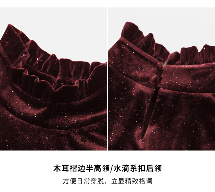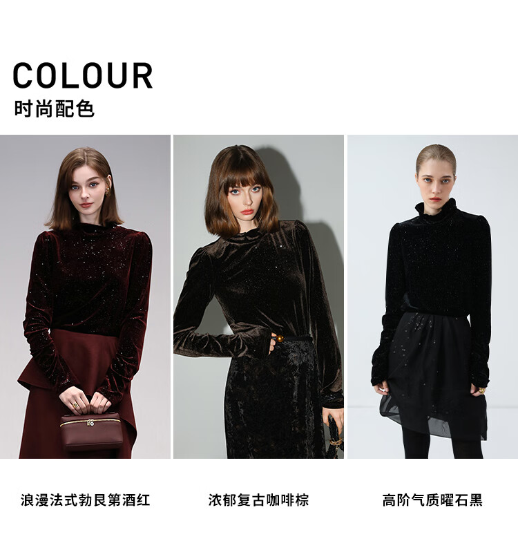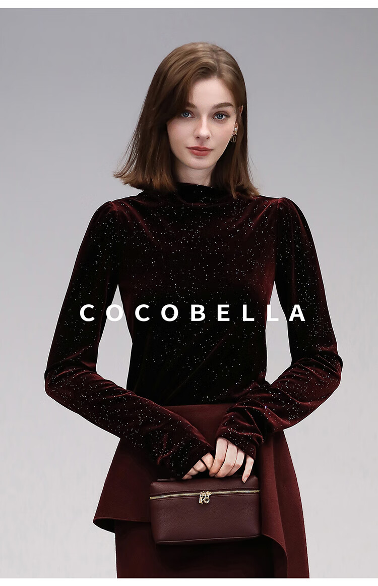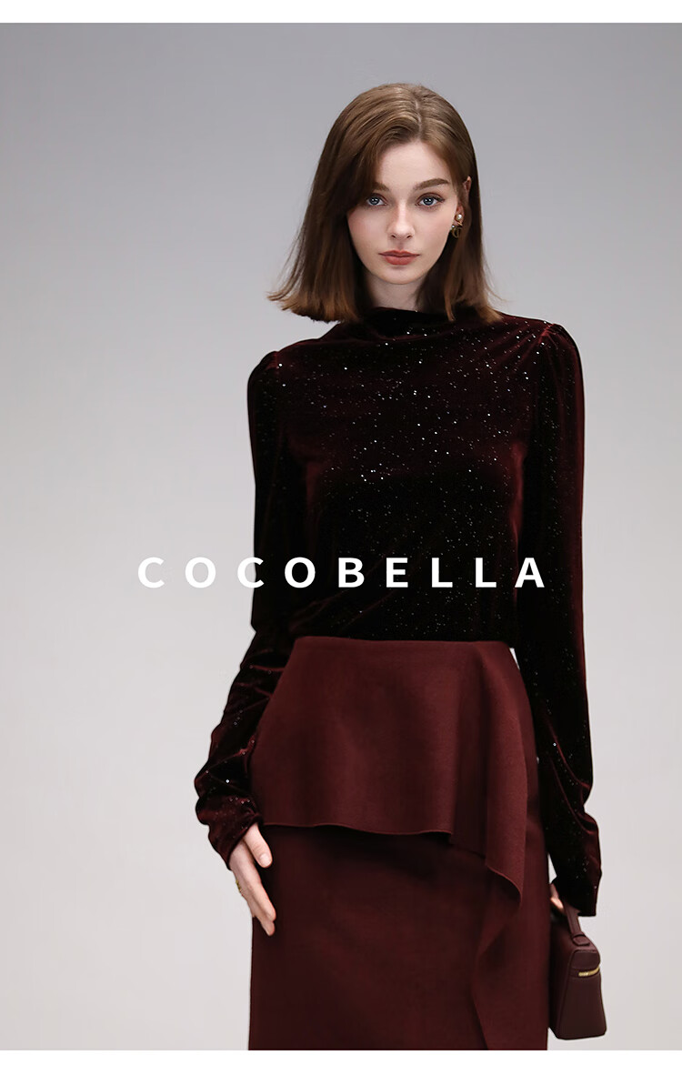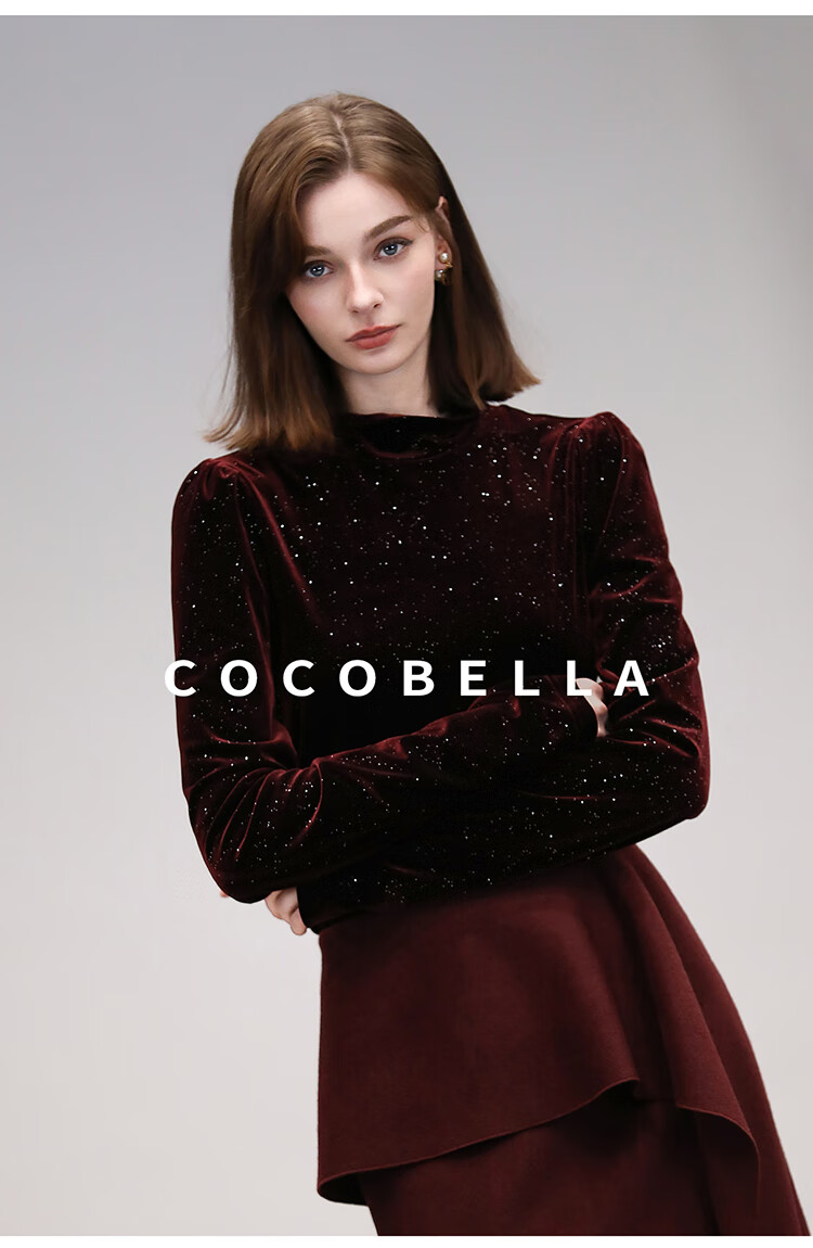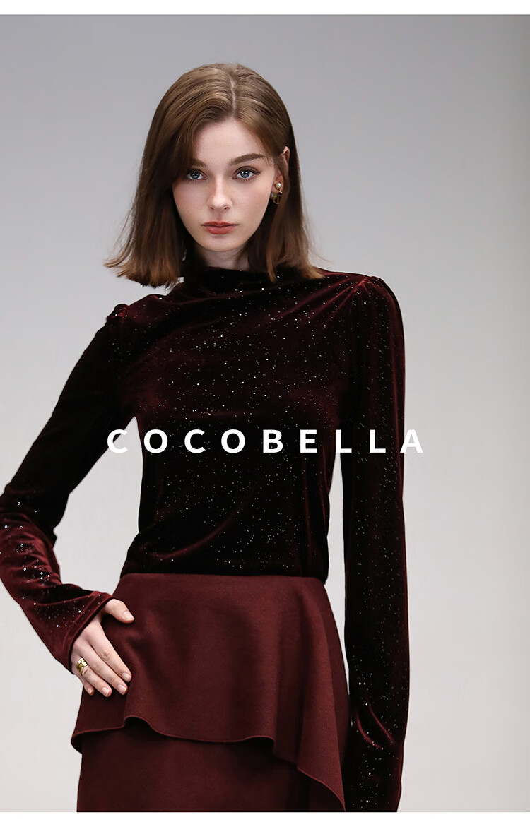 COCOBELLA优雅木耳边半高领亮片丝绒衬衫长袖打底衫TS7066-3