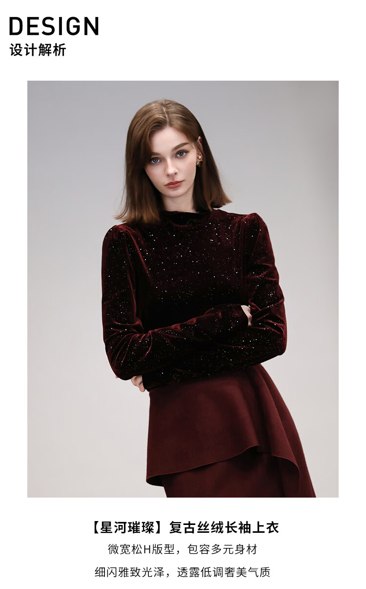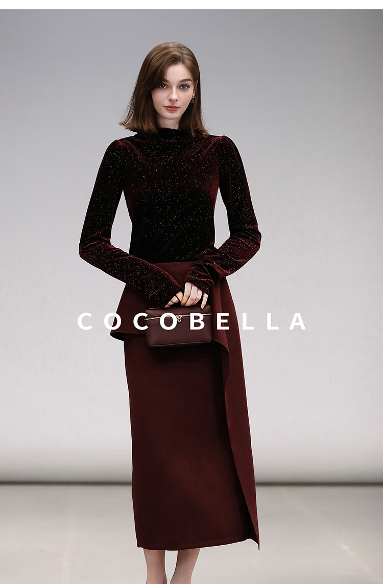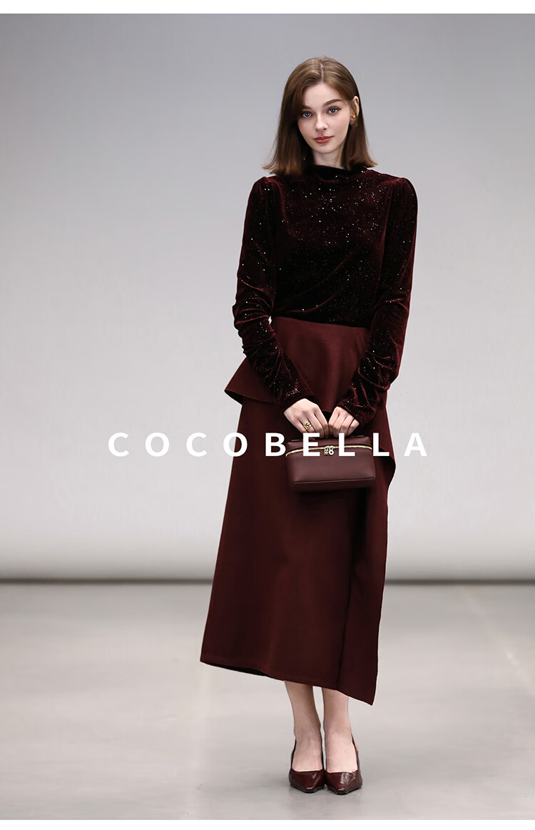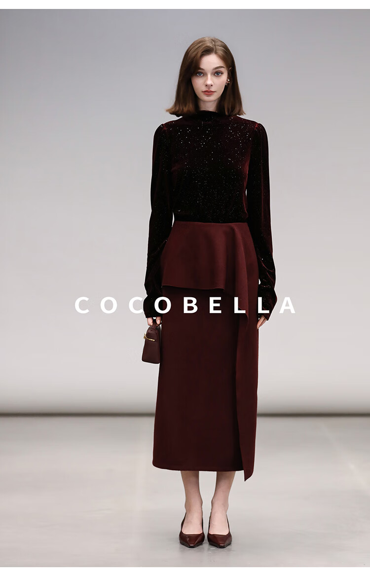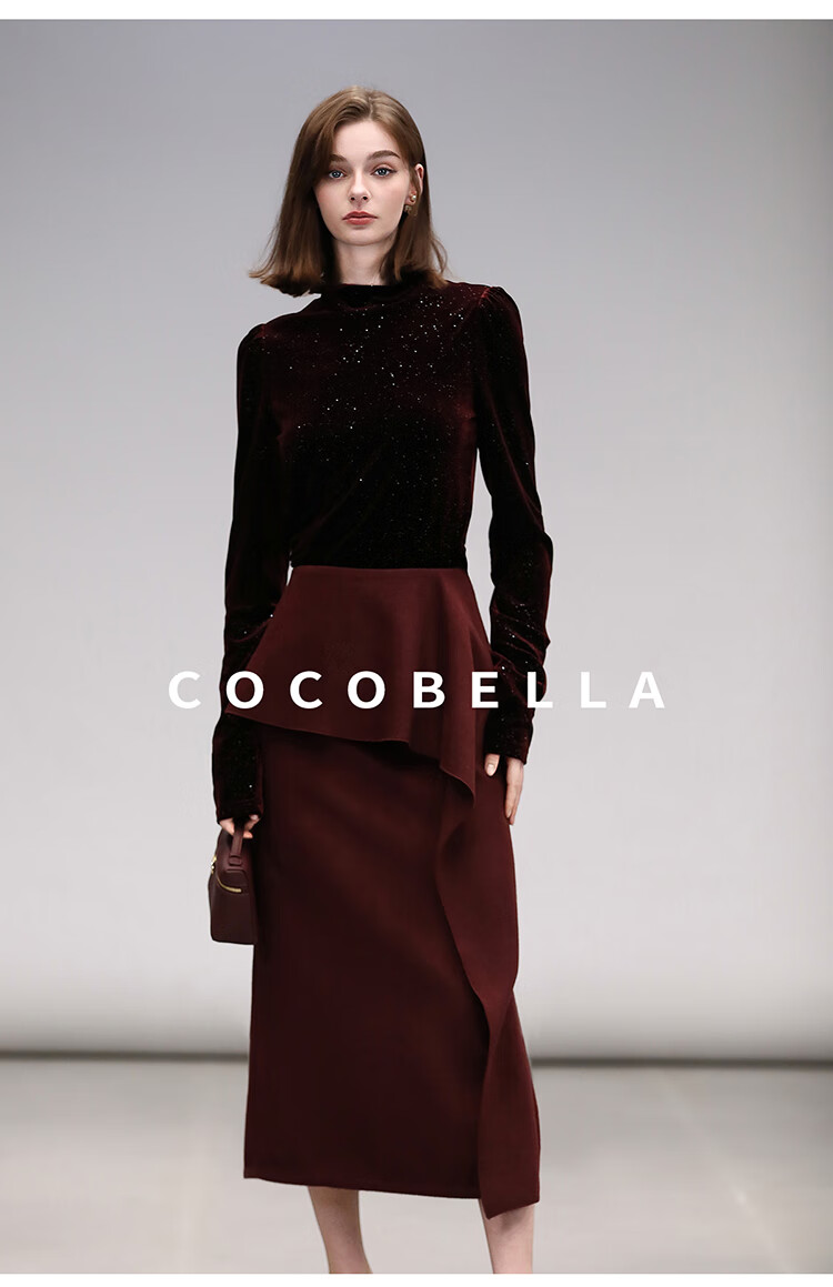 COCOBELLA优雅木耳边半高领亮片丝绒衬衫长袖打底衫TS7066-3