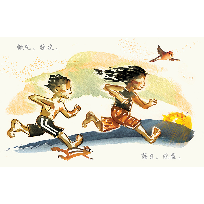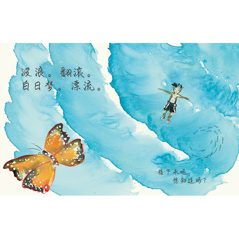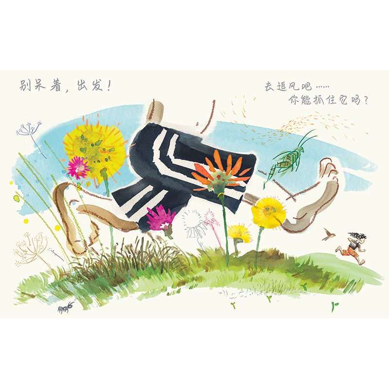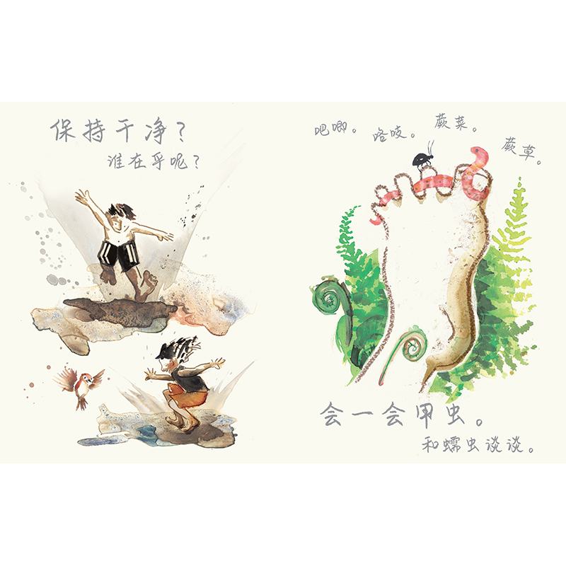 “嘿,说你呢。天多蓝啊!”女孩喊道。她从一个男孩的窗前跑过,他正在屋内玩电子设备。男孩打开门,跟着她跑出去。他光着脚丫奔向一个无拘无束的自然世界:逐风奔跑、和兔子赛跑、踩泥坑、会一会甲虫、感受沙子的滚烫和海水的清凉、漂浮在海面上做白日梦……无论是阳光明媚,还是雷雨突至,快乐的心情不曾远去。