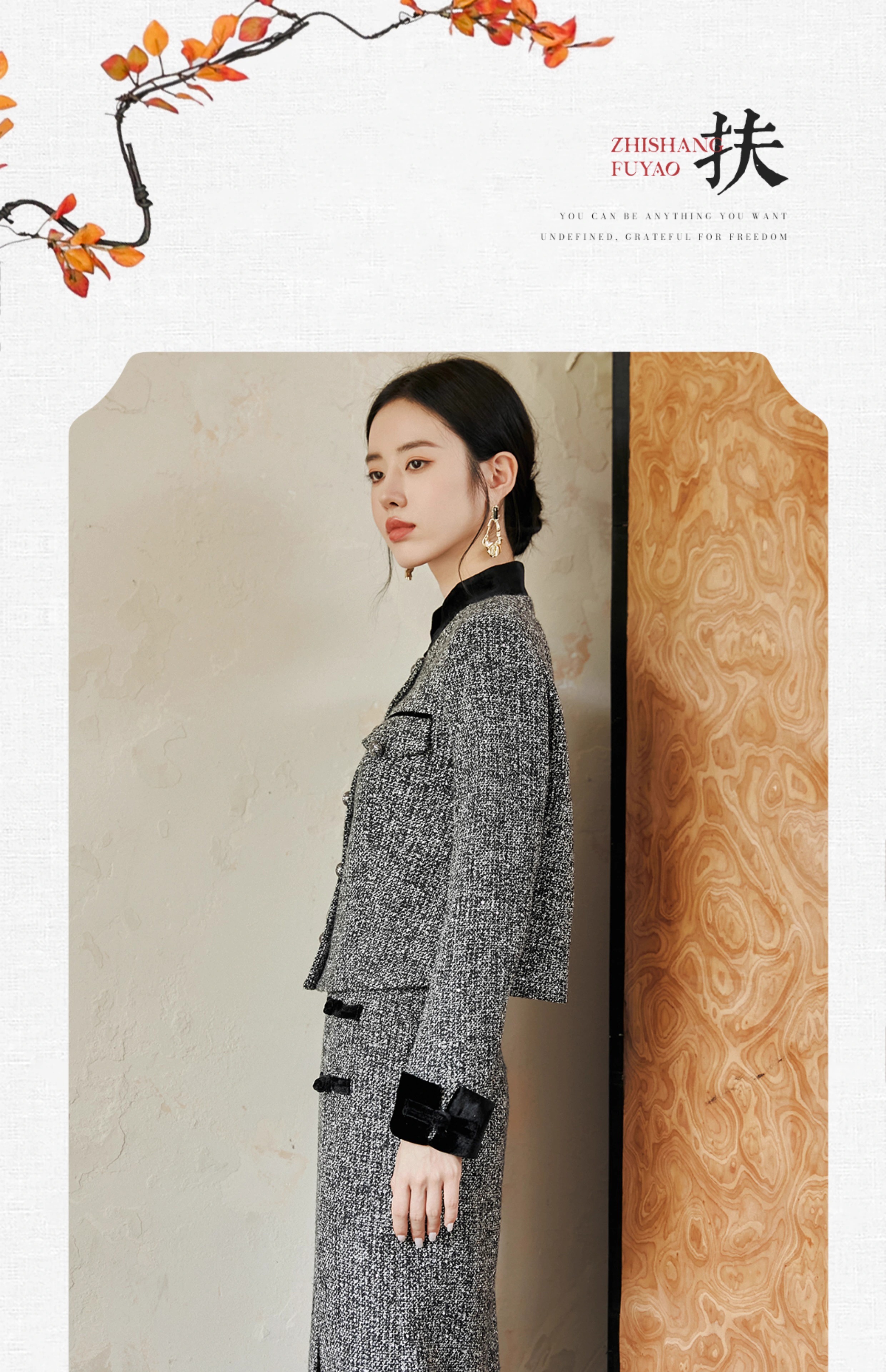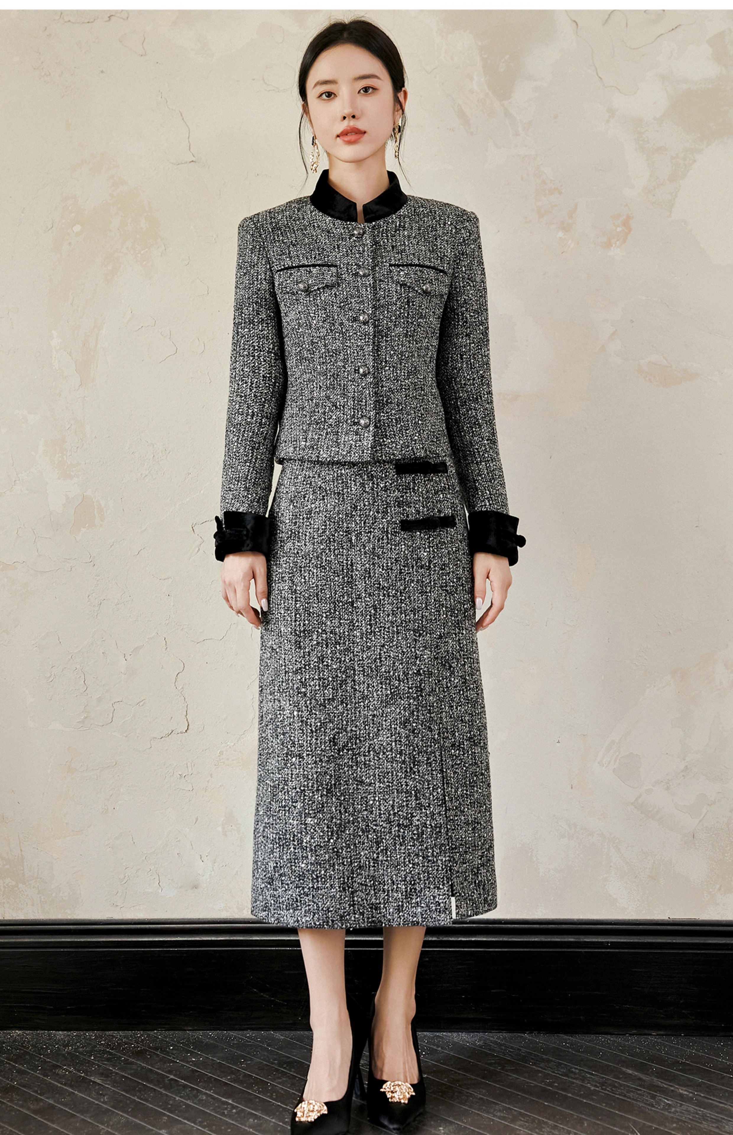 IWY/扶摇系列 奢贵羊毛短外套秋冬新款粗花呢收腰上衣半裙小香风套装FYCS561