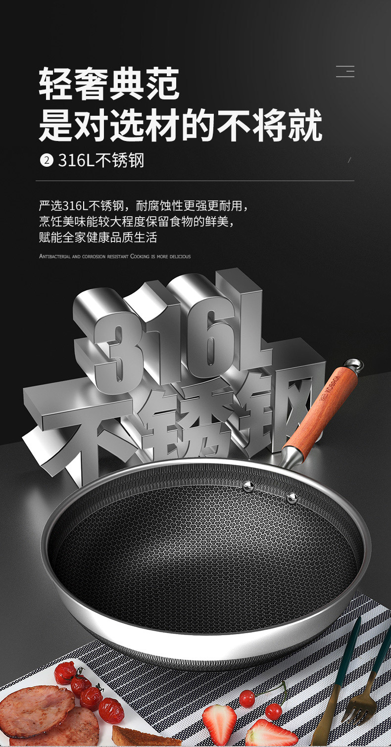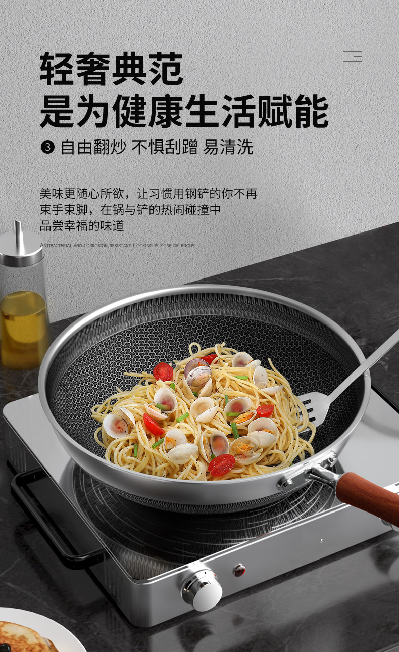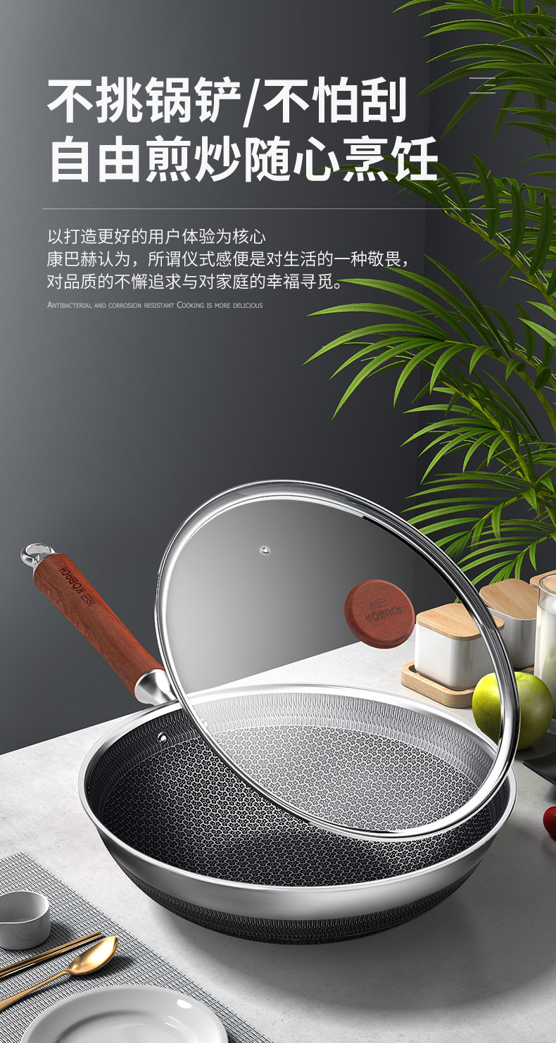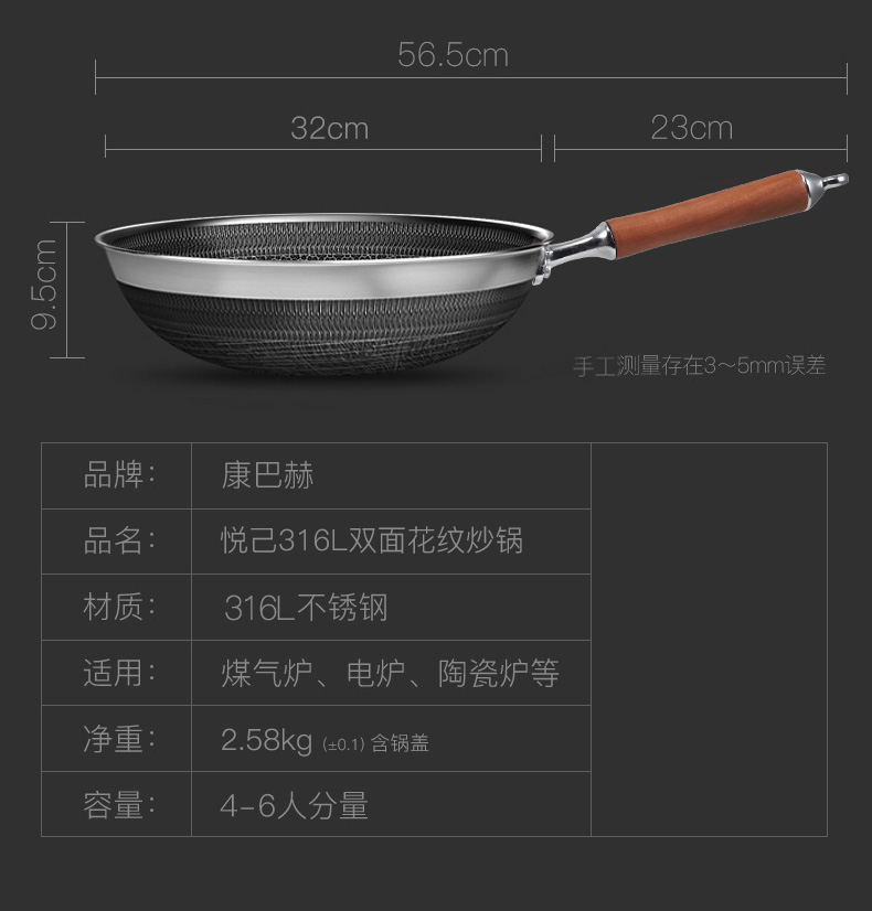 品牌:康巴赫 品名:悦己316L双面花纹炒锅 材质:316L不锈钢 适用:煤气炉、电炉、陶瓷炉等 净重:2.58KG(含锅盖) 容量:4-6人份量
