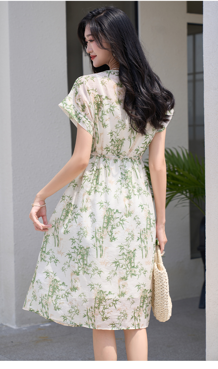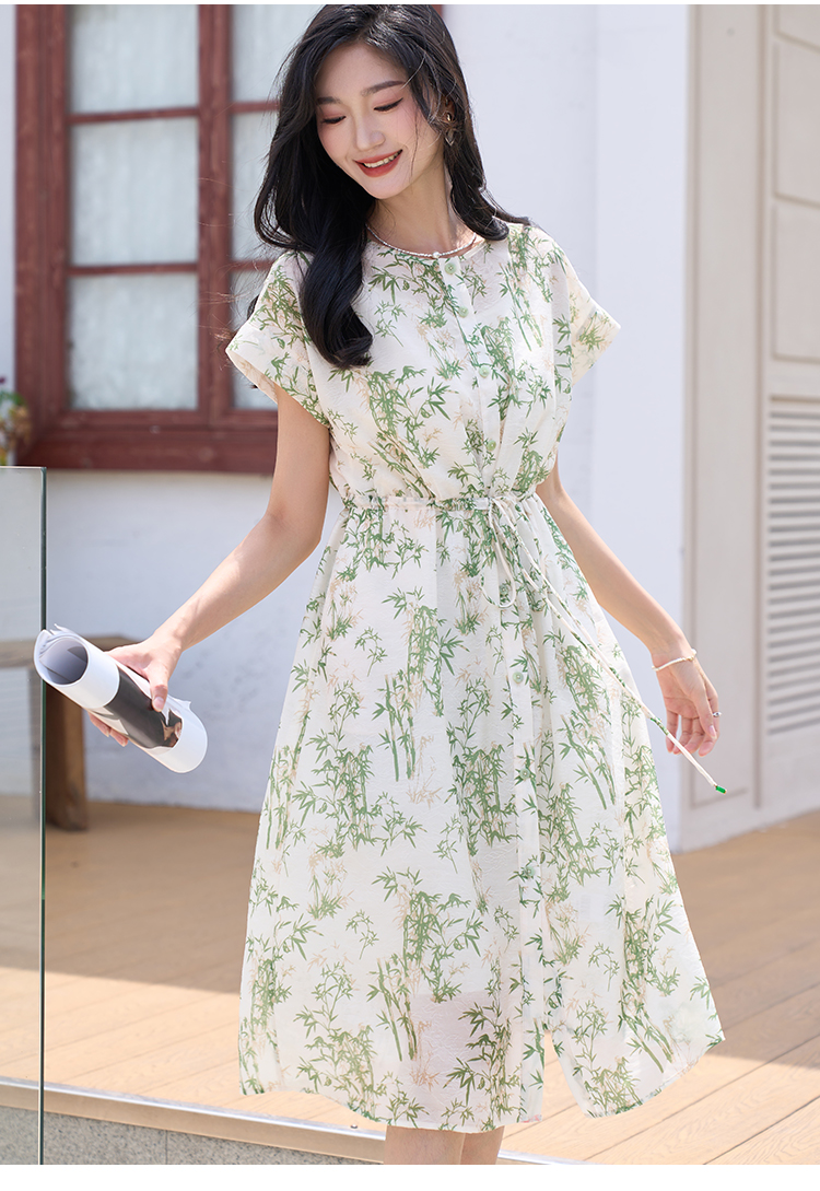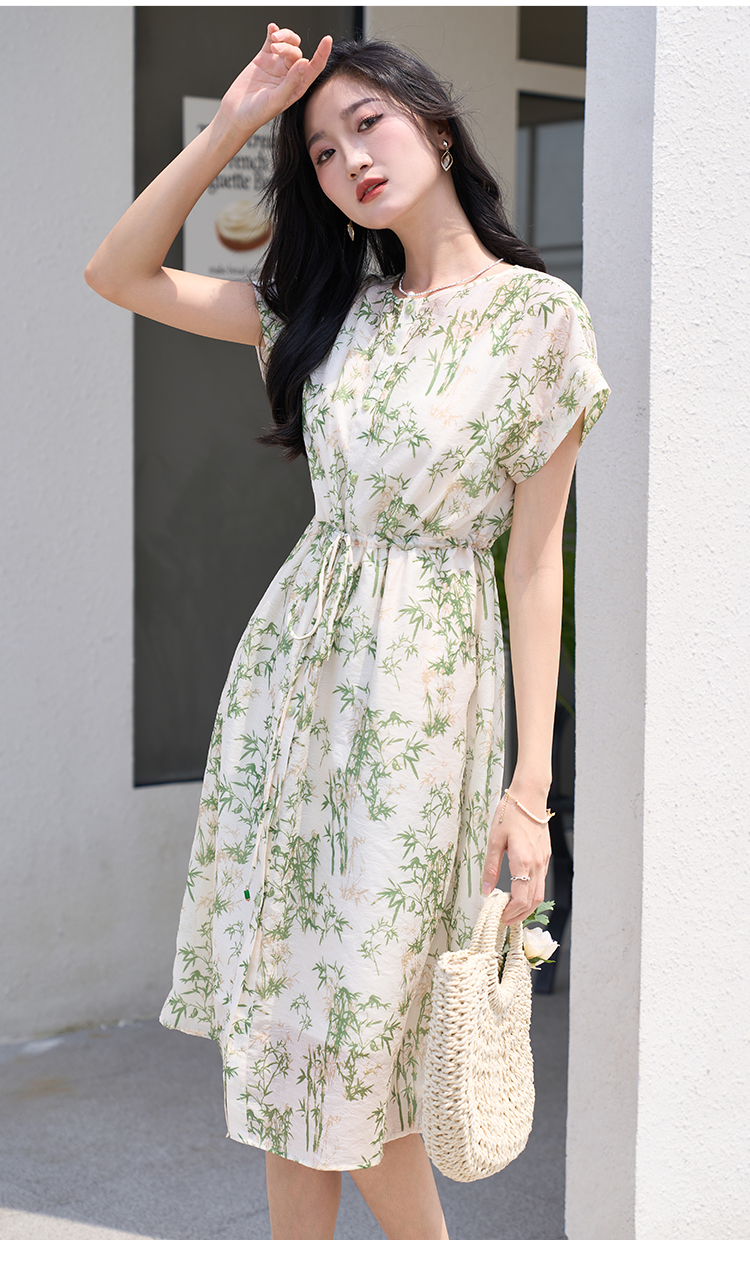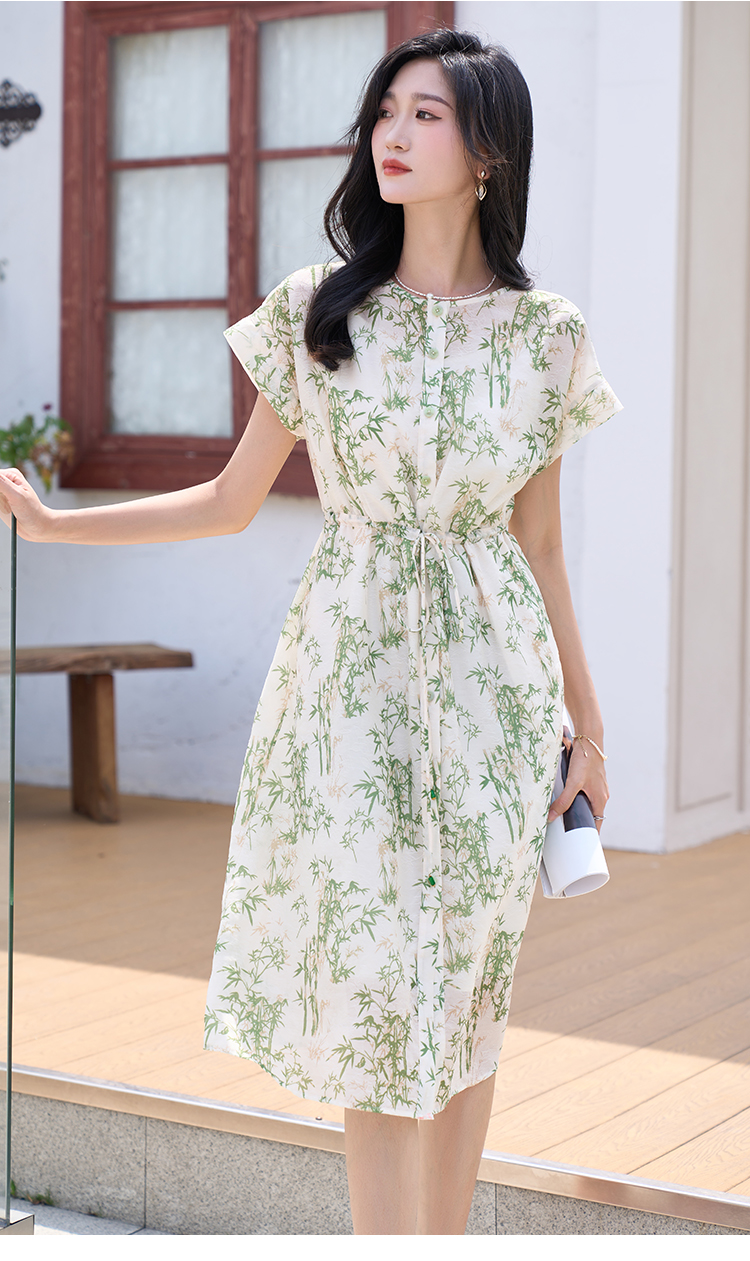 米思阳2025夏季新品清爽新中式印花裙宽松抽绳设计连衣裙2485