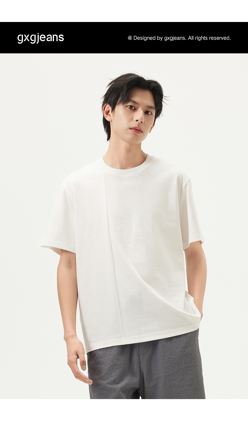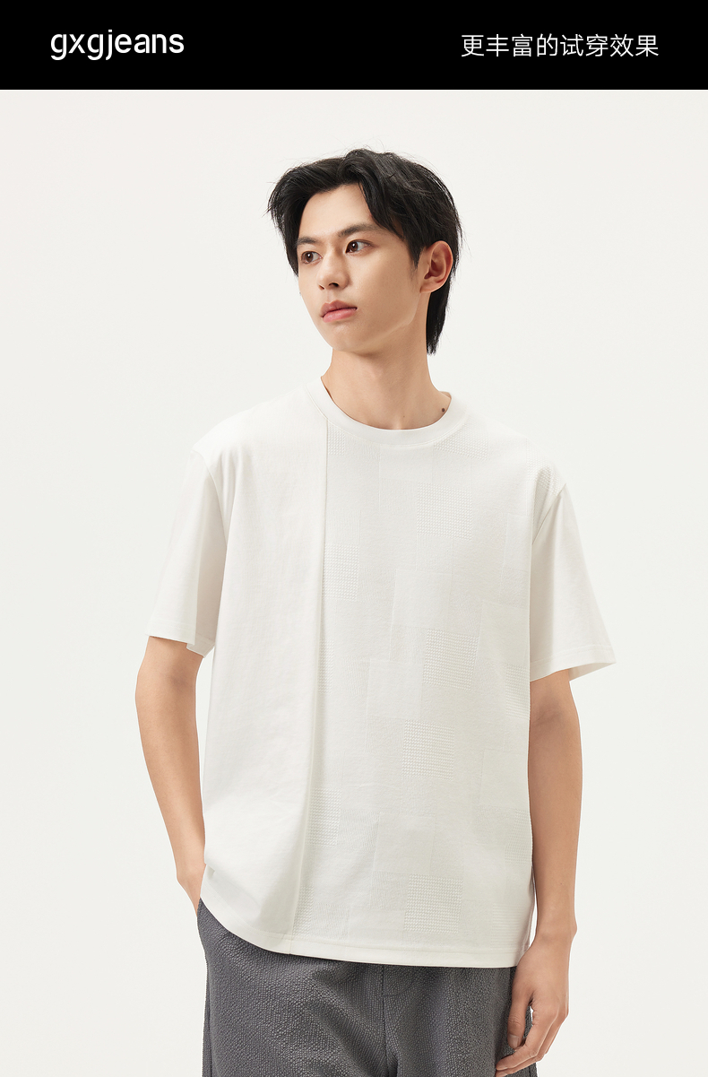 gxg.jeans男装 白色拼接肌理简约休闲圆领短袖T恤男士 25夏热卖