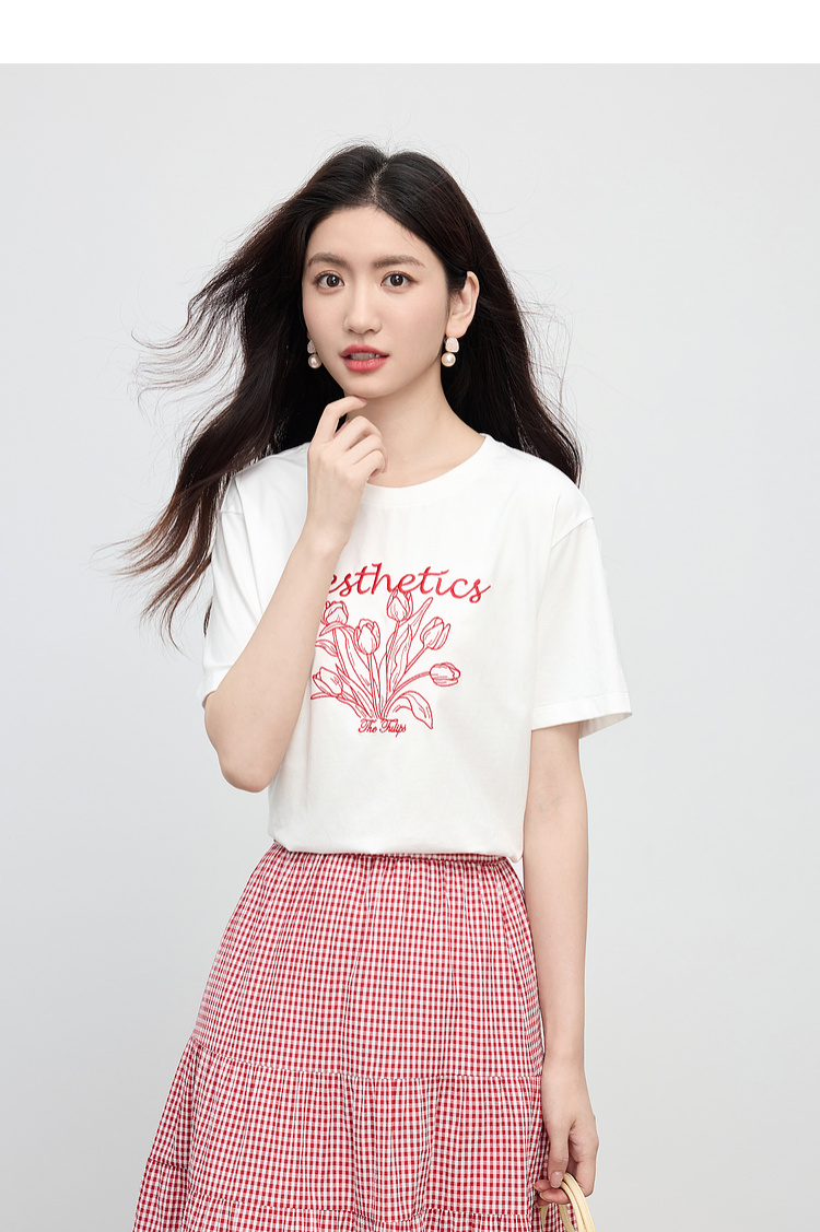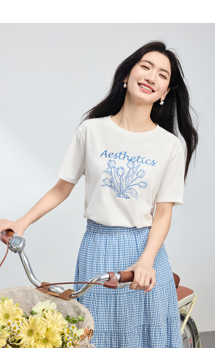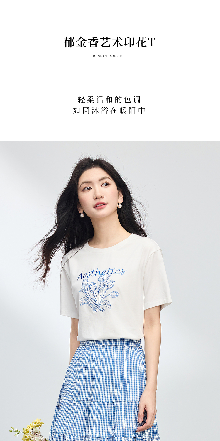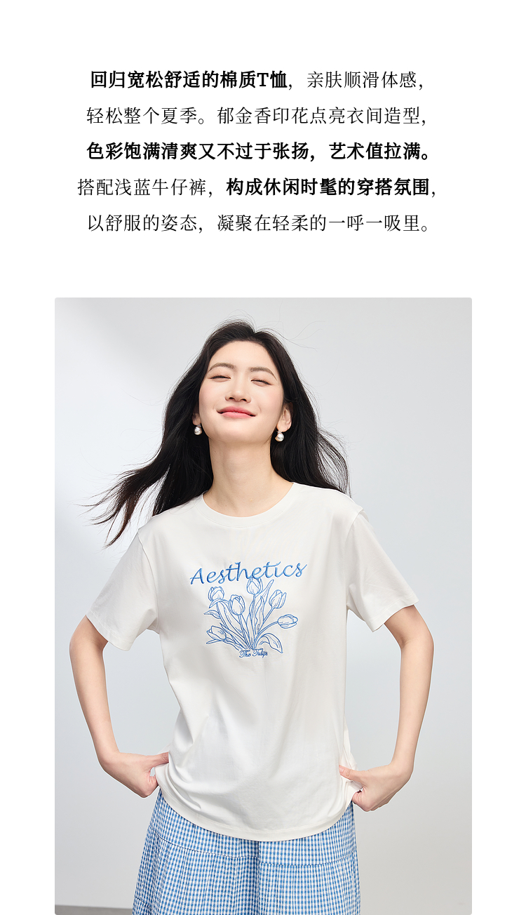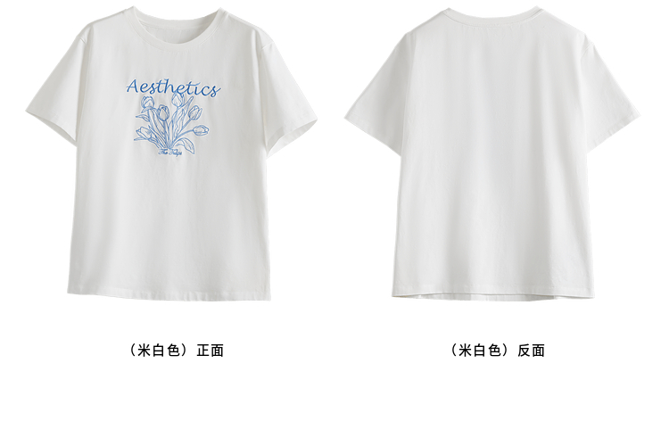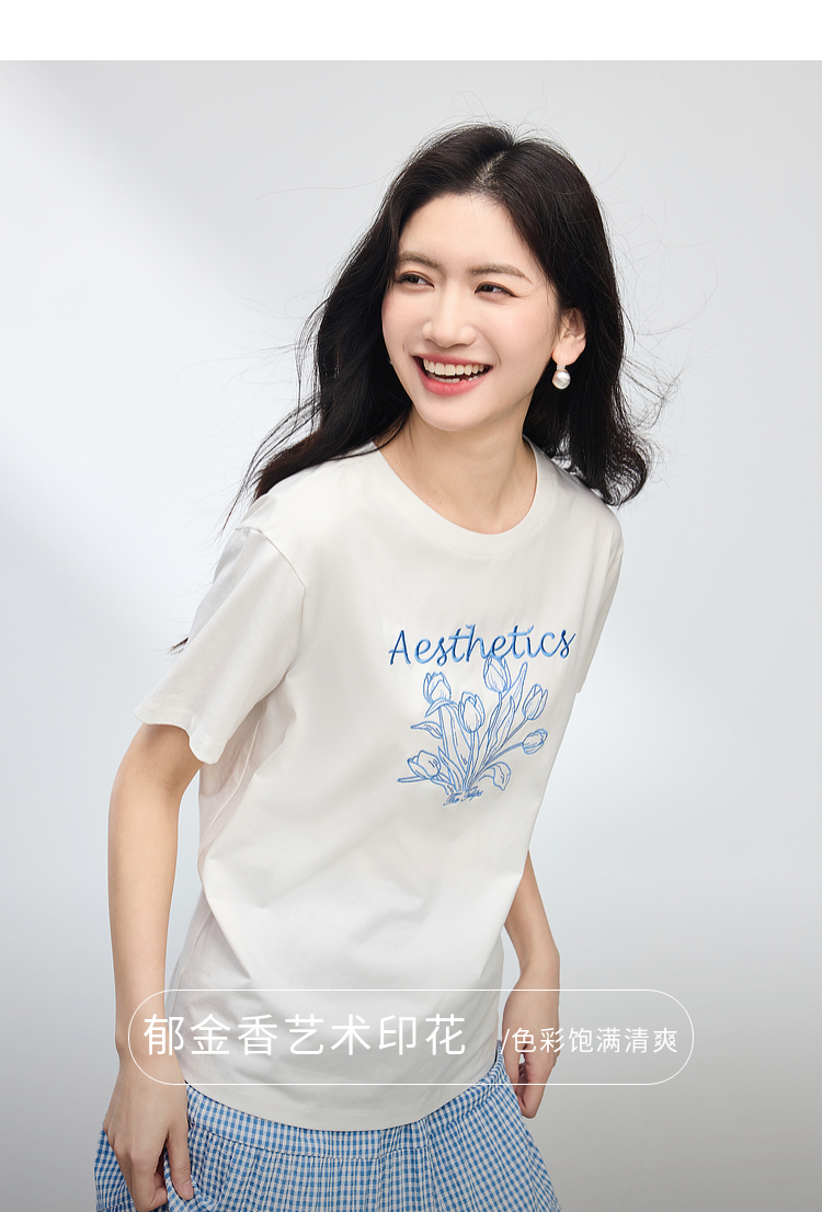 【夏季新品】熙世界艺术风郁金香印花T恤短袖女2025夏季新款正肩圆领白色上衣