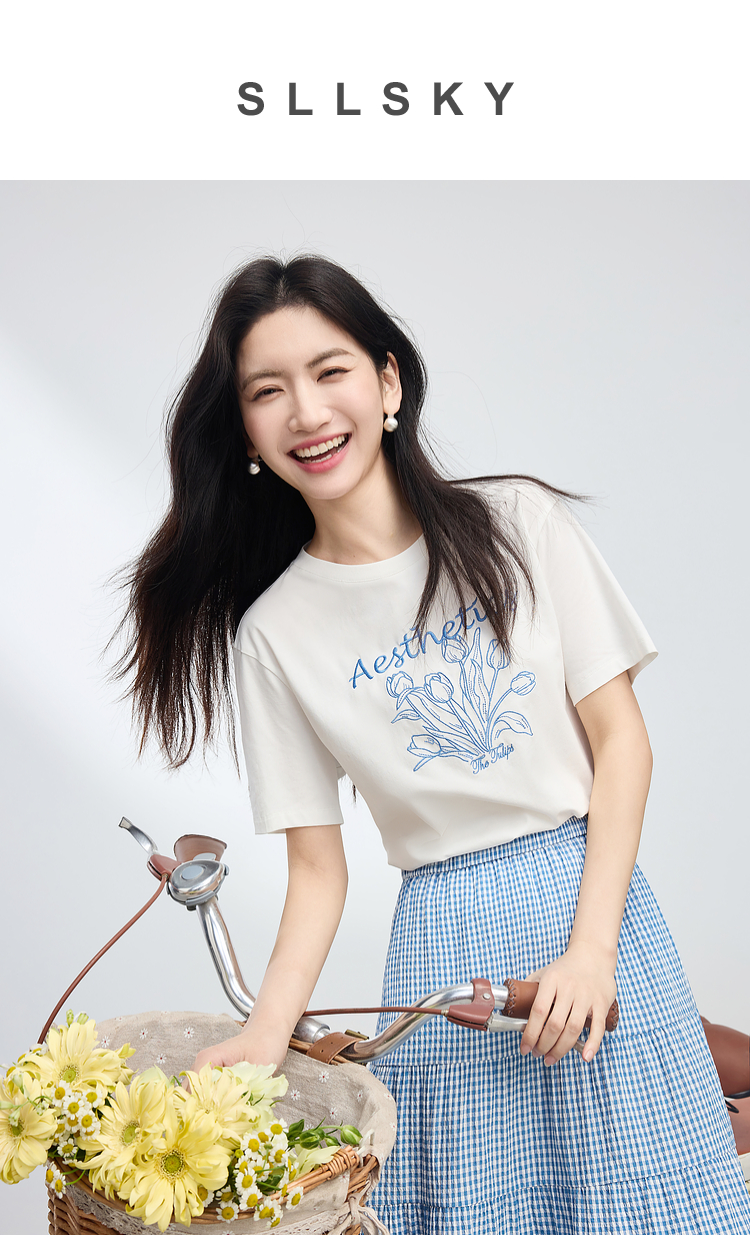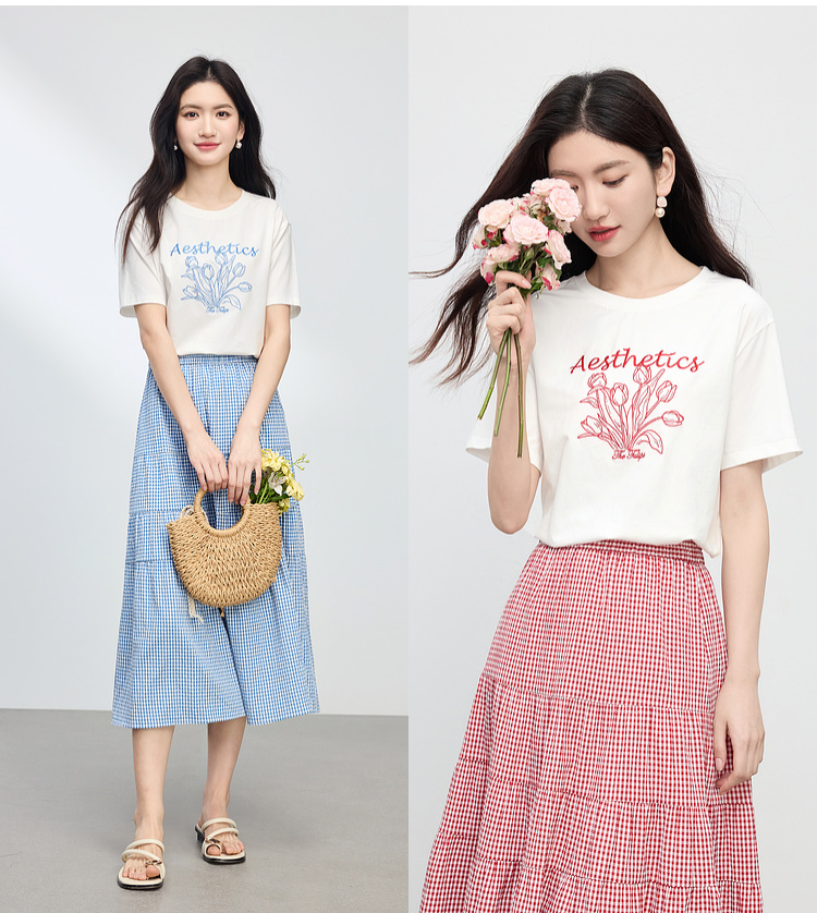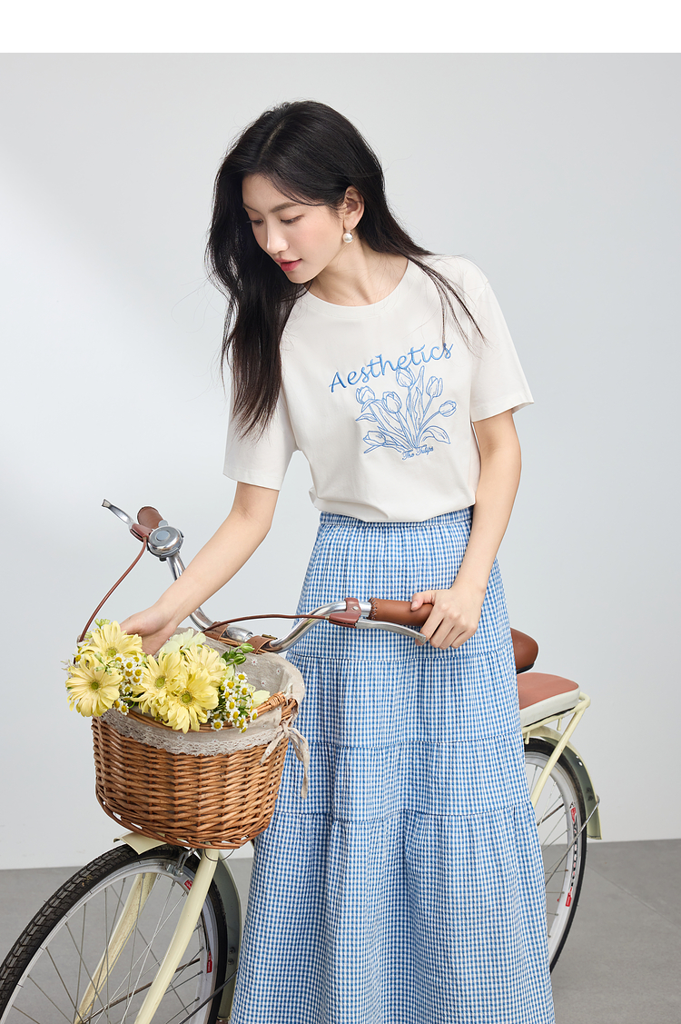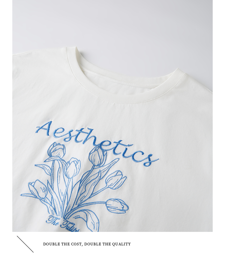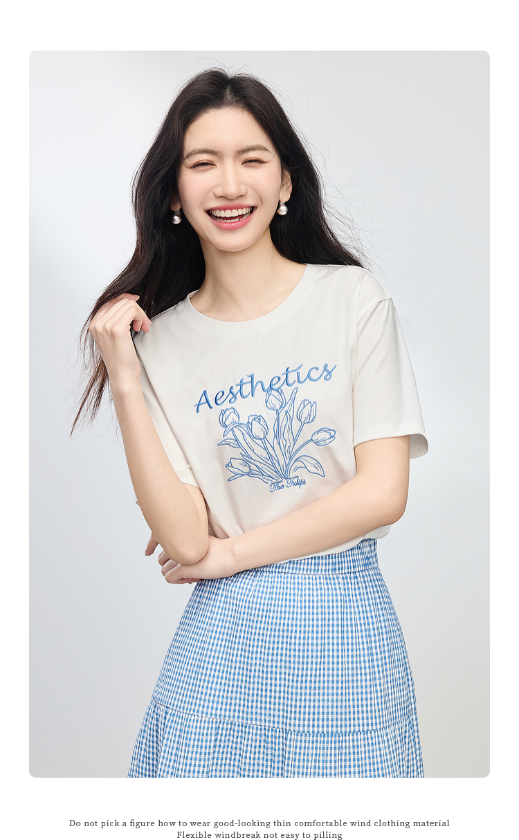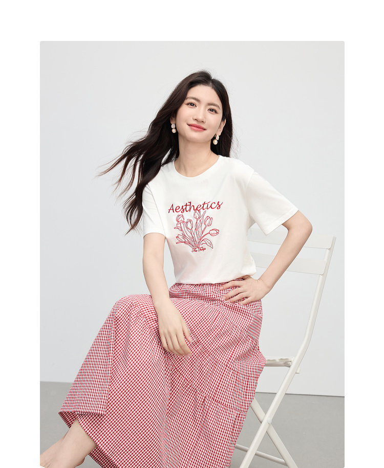 【夏季新品】熙世界艺术风郁金香印花T恤短袖女2025夏季新款正肩圆领白色上衣