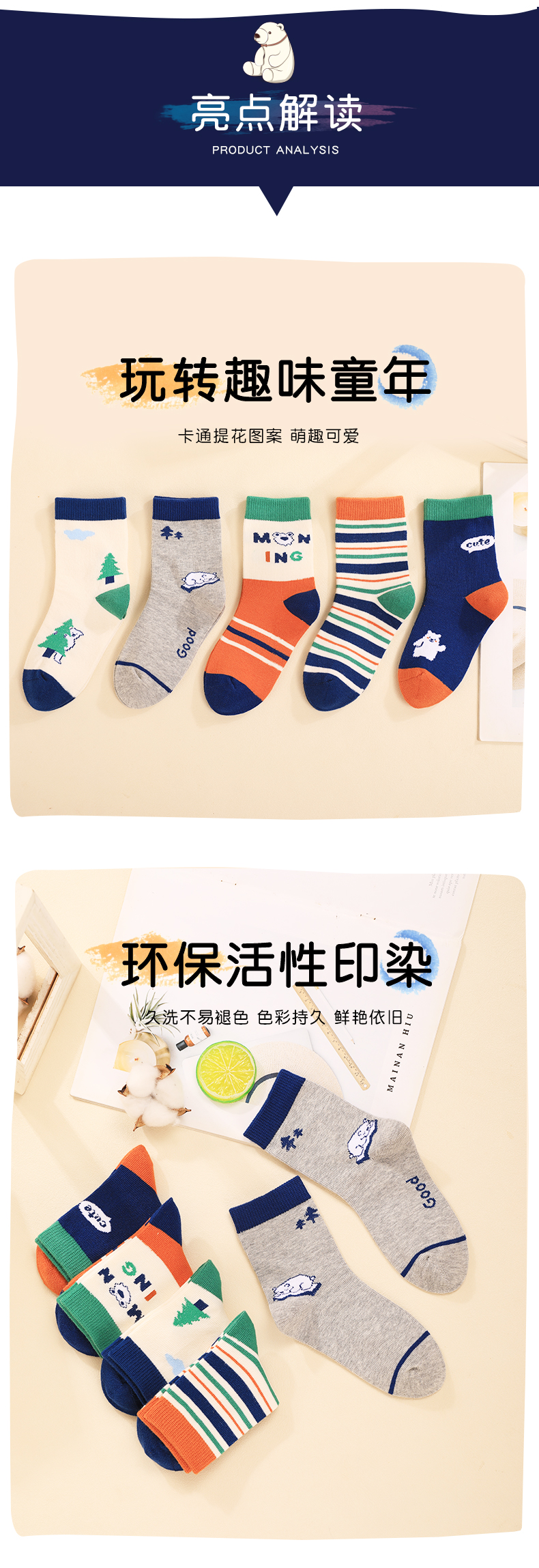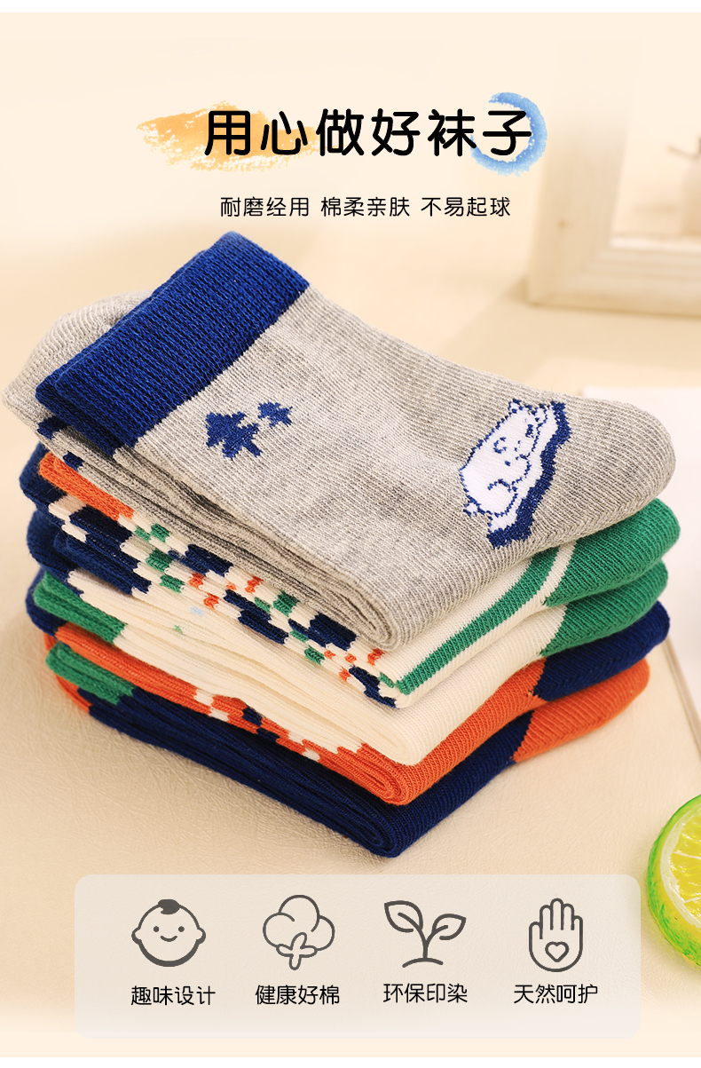 洁丽雅5双装童袜中筒袜子儿童袜新疆棉可爱印花亲肤柔软袜子韩系