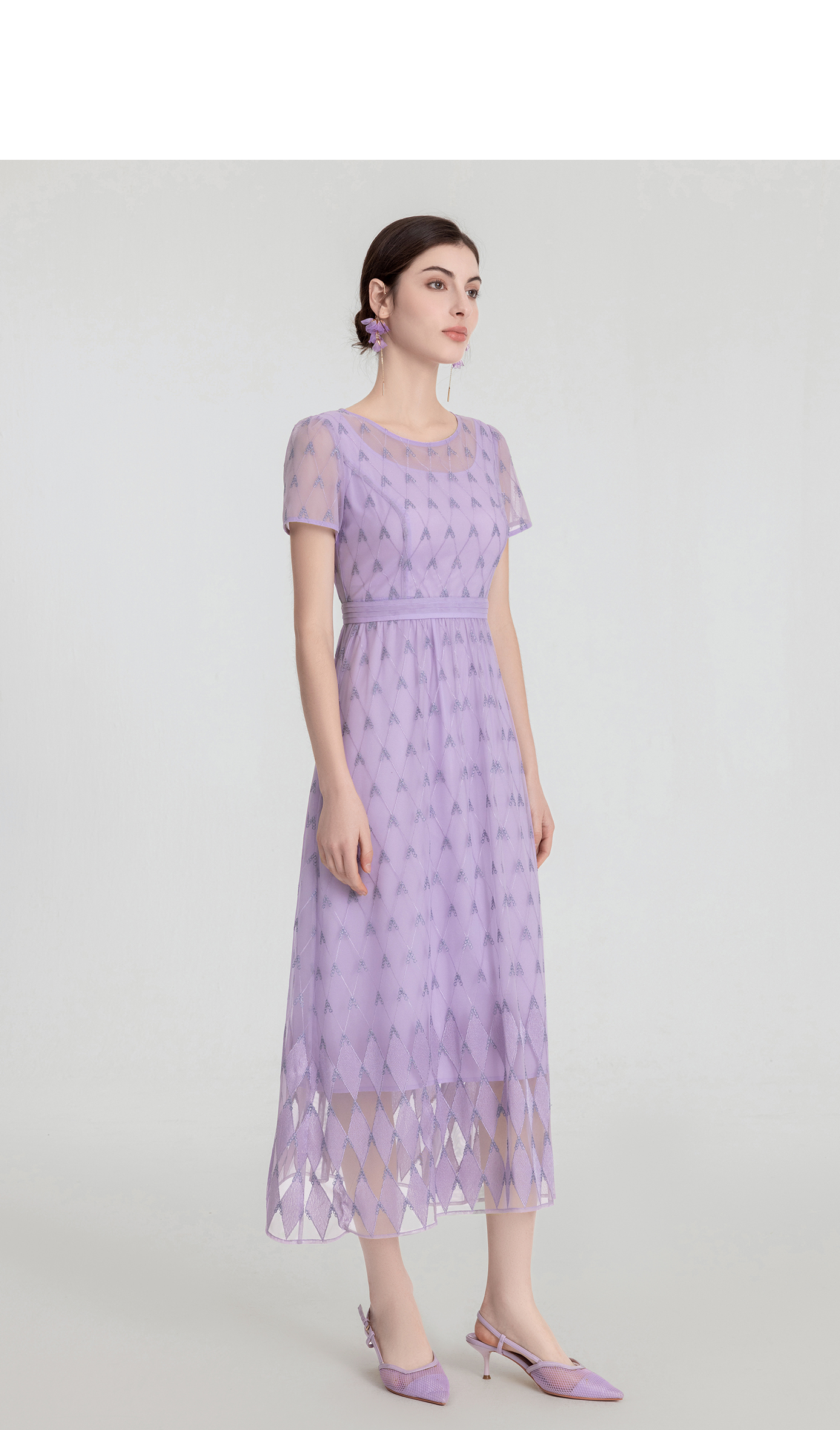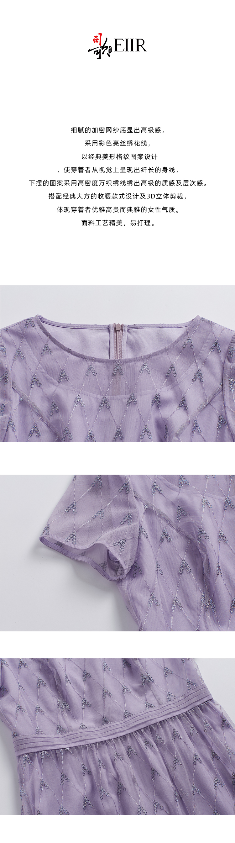 司歌刺绣连衣裙圆领网纱长袖弹力修身A881268
