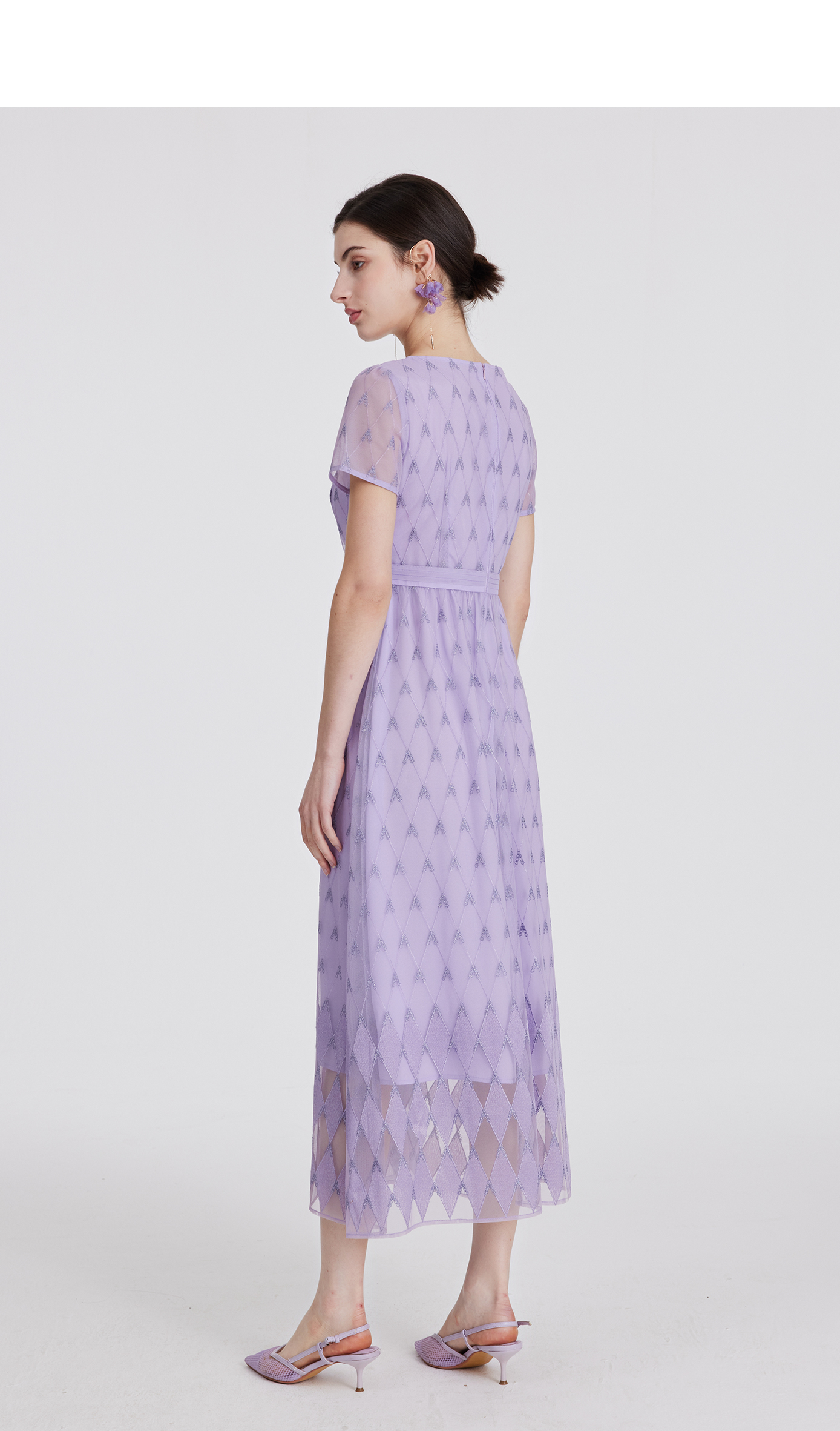司歌v领网纱刺绣短袖收腰连衣裙A891464M