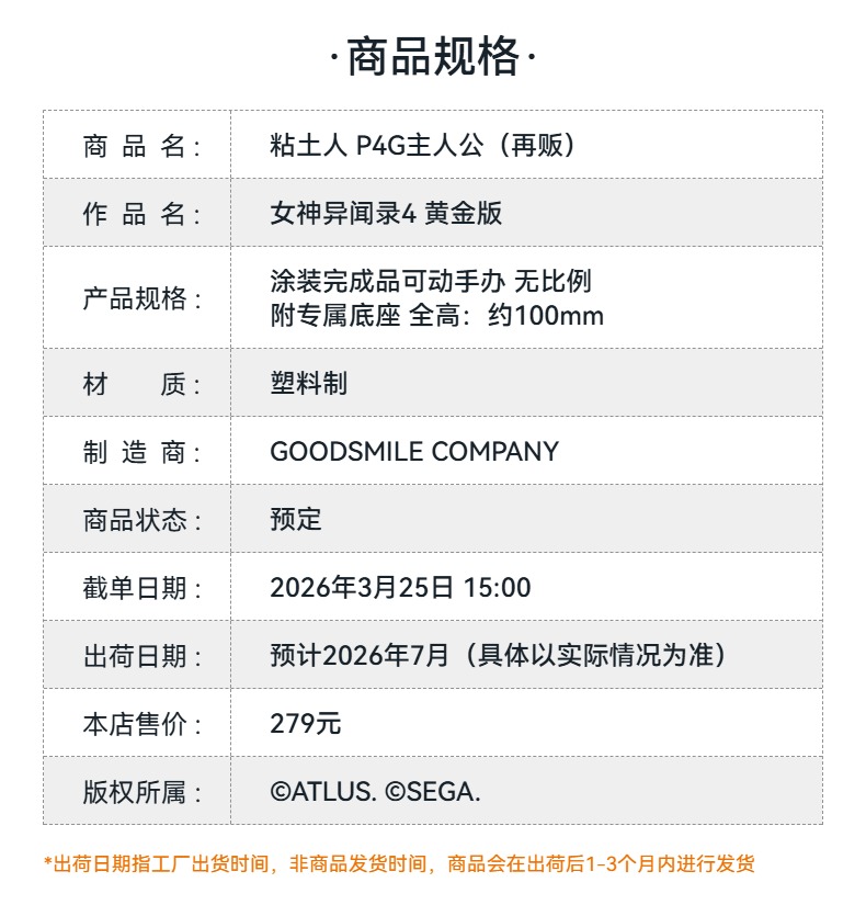 【GSC预售定金】粘土人 P4G主人公 女神异闻录4 黄金版 手办模玩