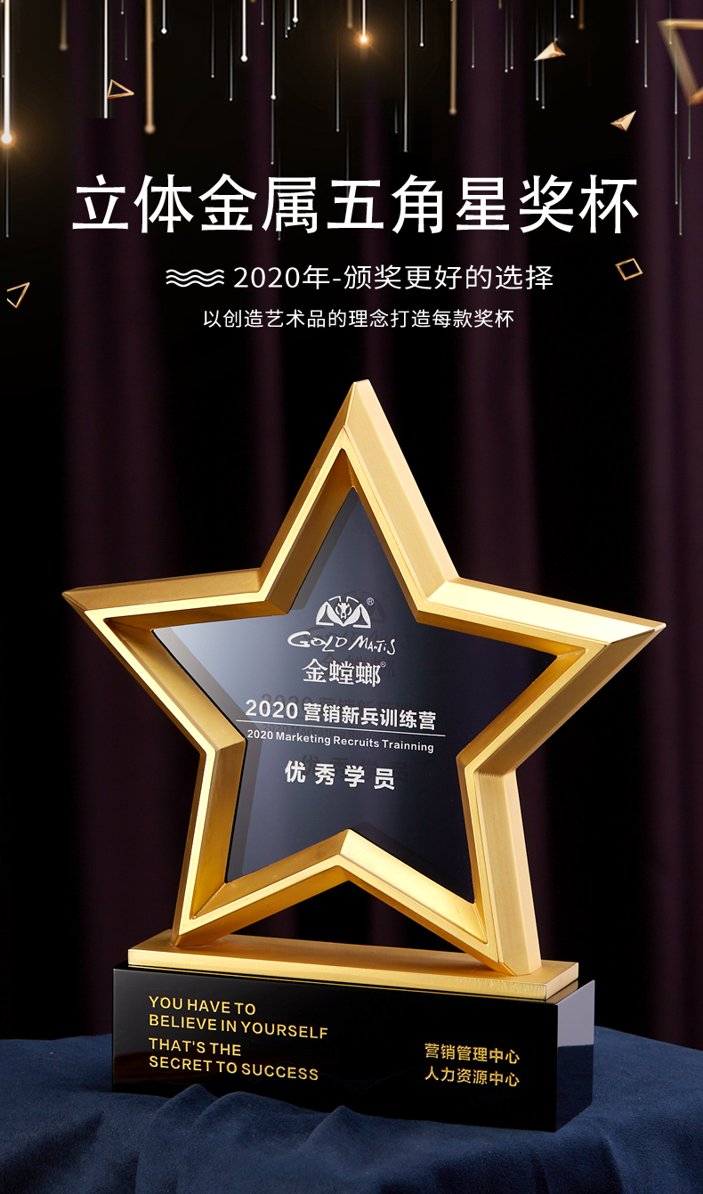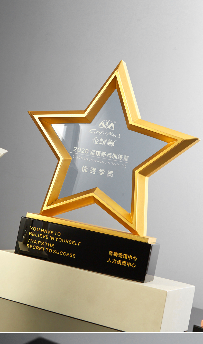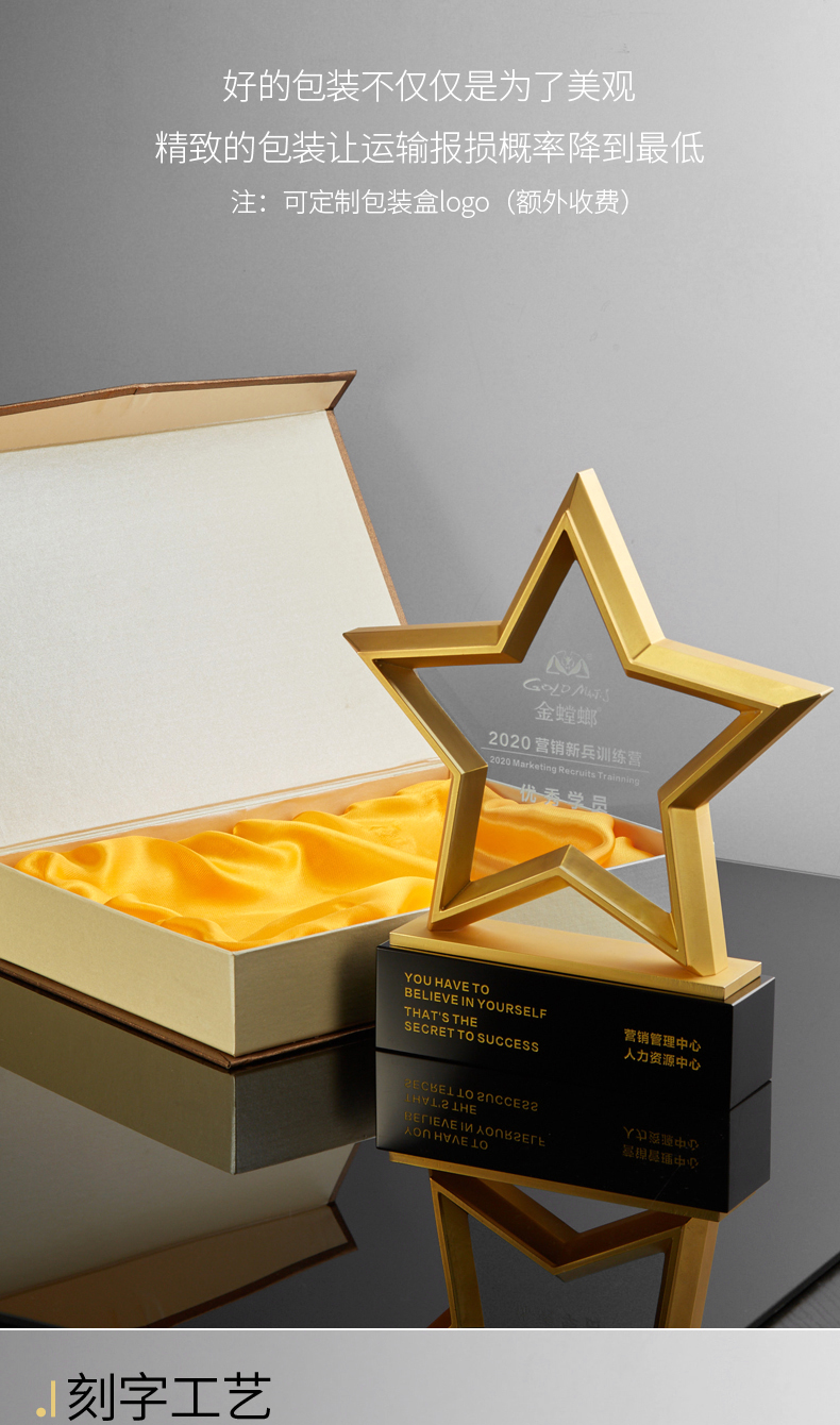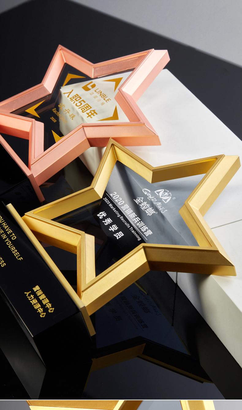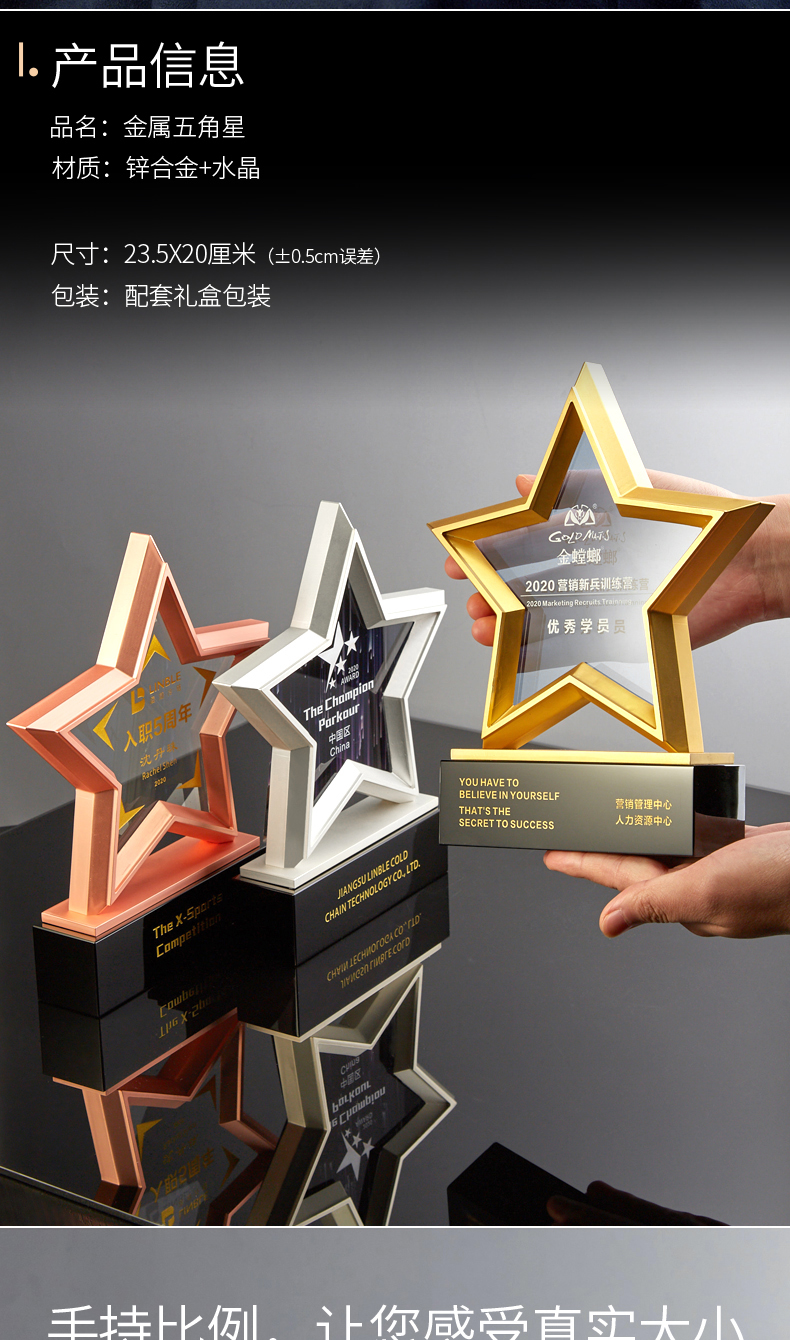 金属五角星水晶奖杯牌定制定做年会员工合作伙伴刻字2021年会颁奖