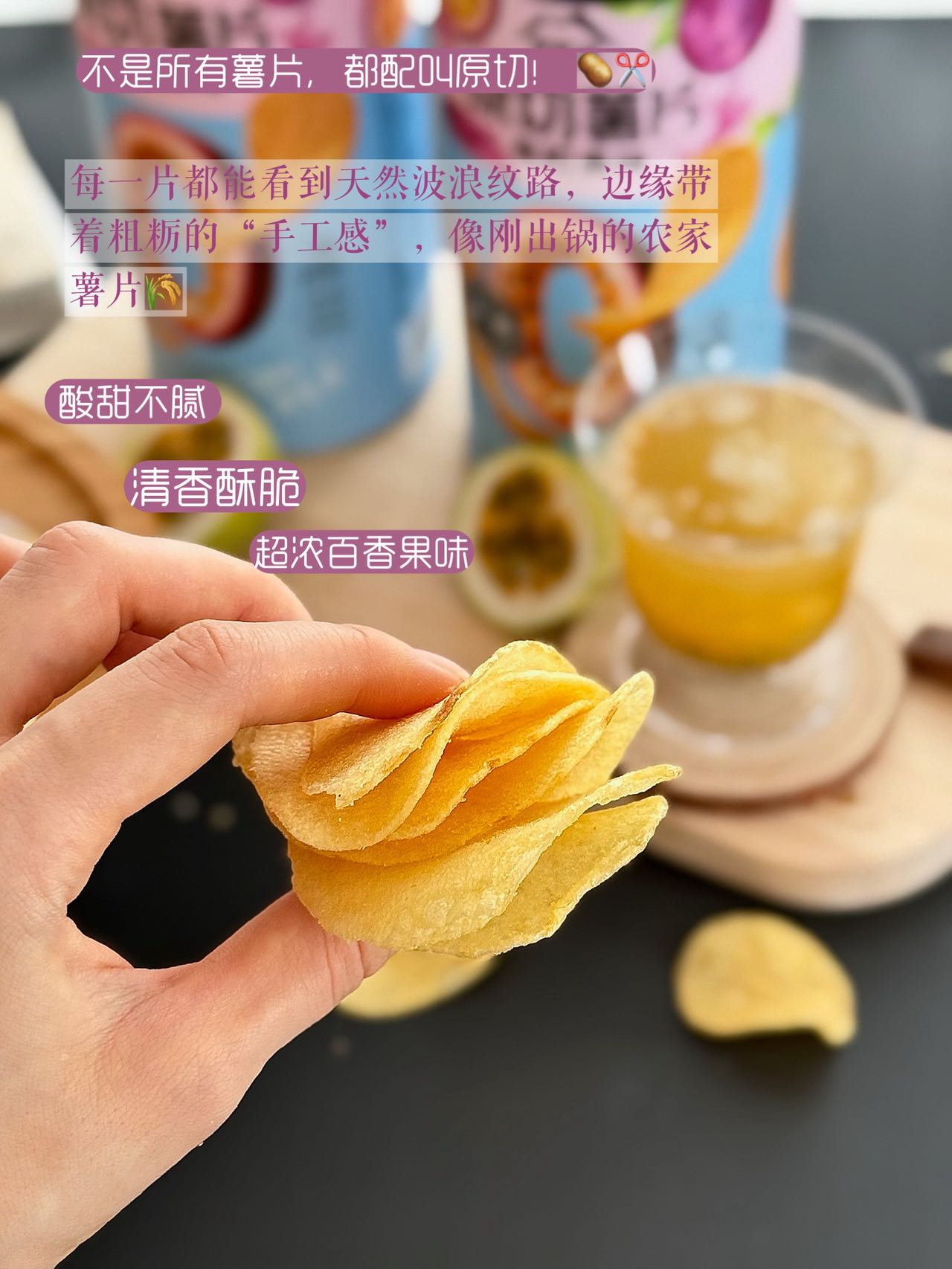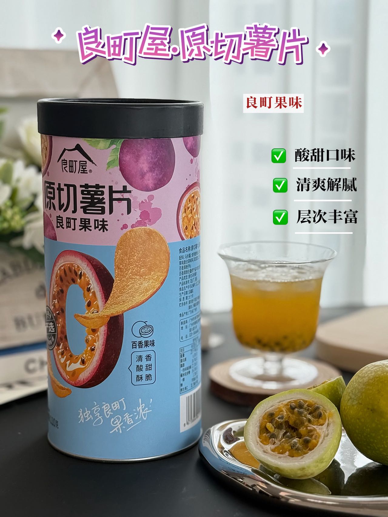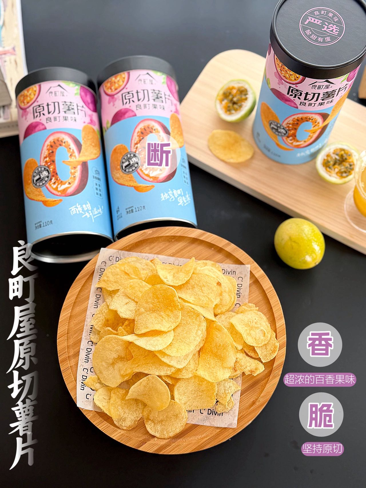没想到吧?薯片还能这么玩!良町屋百香果味原切薯片,酸甜果香+土豆原香,奇妙搭配,清新不腻!咔嚓一口,仿佛瞬间穿越热带果园~🌴