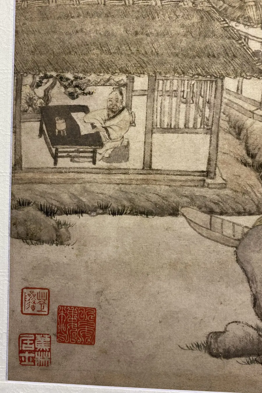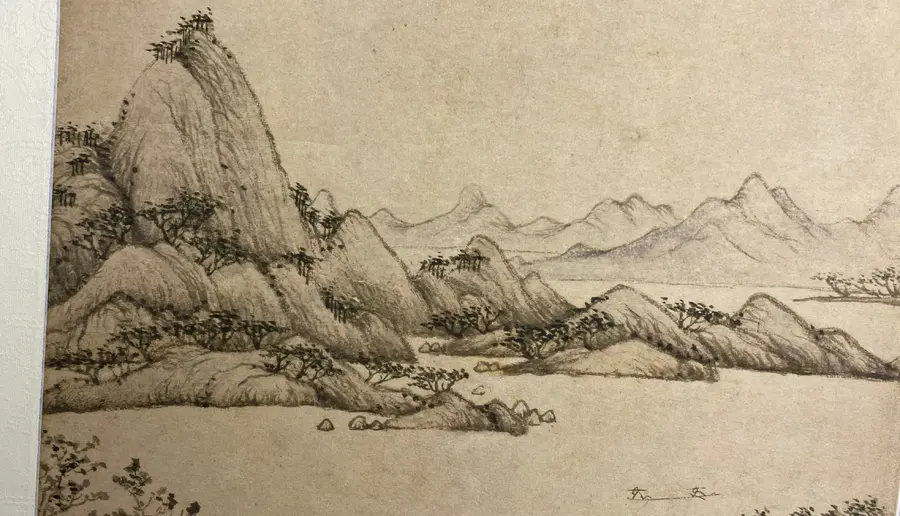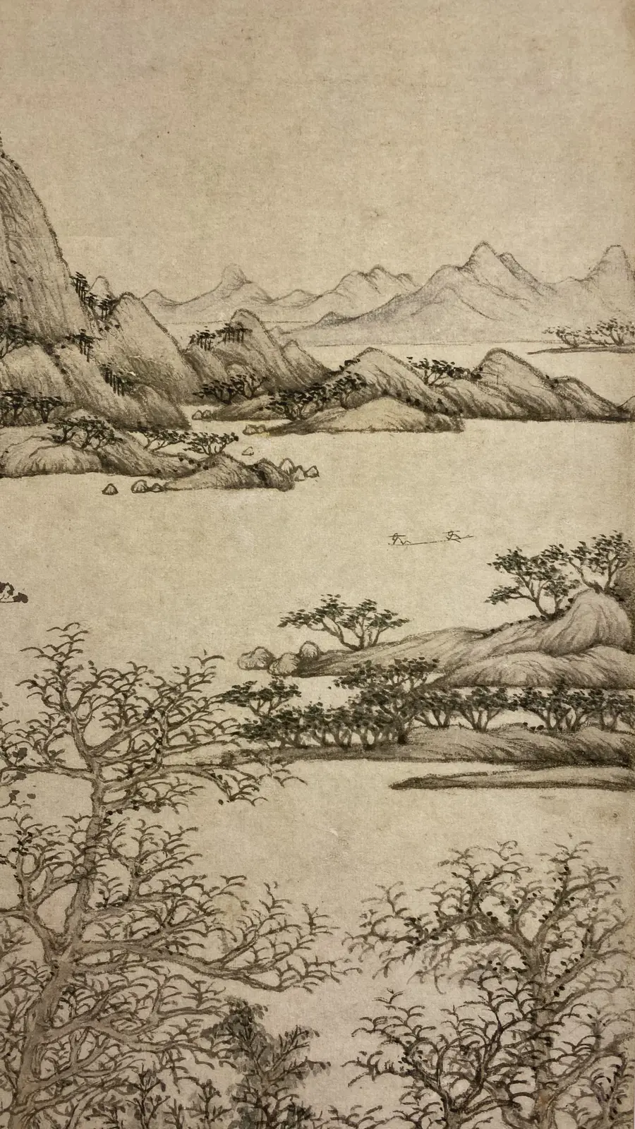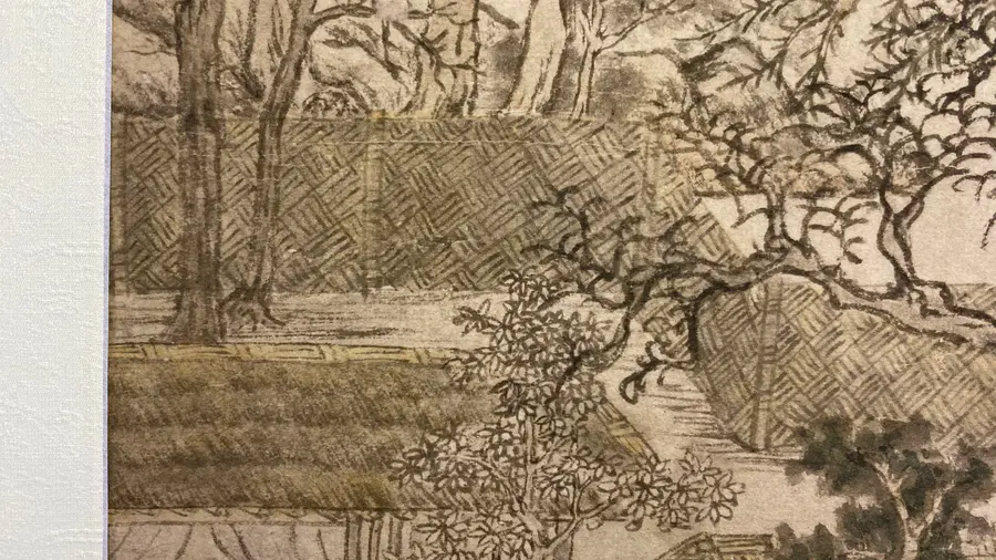图中绘秋天平远景色。近岸草堂、竹篱掩映于树丛之中,岸边系舟,主人与妻子在屋中各行其是。院后湖面空阔,水波不兴,仅露一段岸角丛树,远山一带,渐远渐淡,没入天际。构图、用笔均较简洁,表现出了江南水乡秋季明净寥落的景色特征。