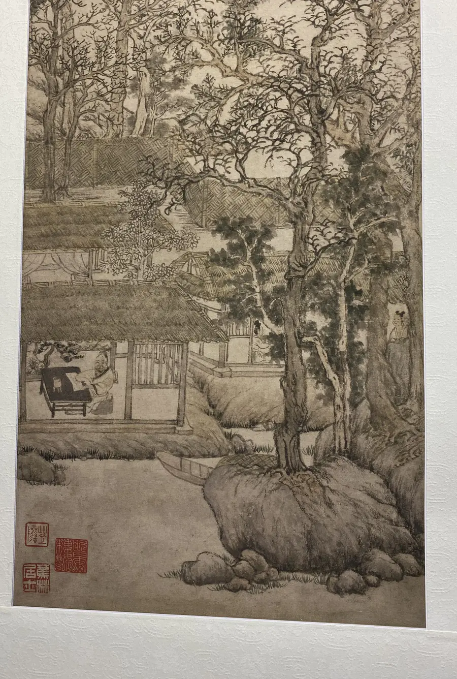 深秋茂密的林阴下有茅舍数座,一老翁坐室内案旁读书,旁屋内二仕女侍读。门前清溪潺潺,小船停泊。屋后平湖汀渚,一叶轻舟载客行于湖心,打破了画面的沉寂。远方群山烟林,意境清幽。全图笔墨工细秀逸,构图新颖,为王蒙山水画优秀之作。