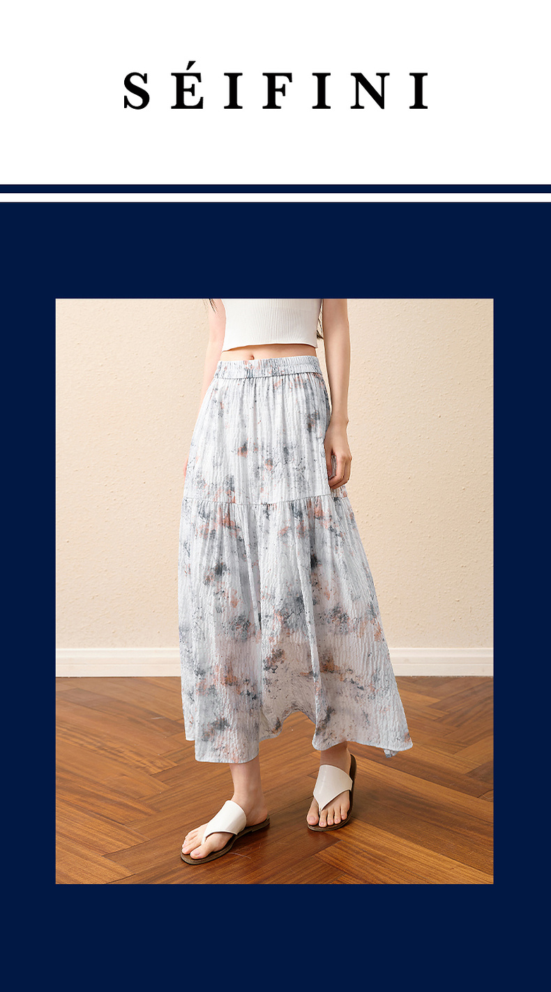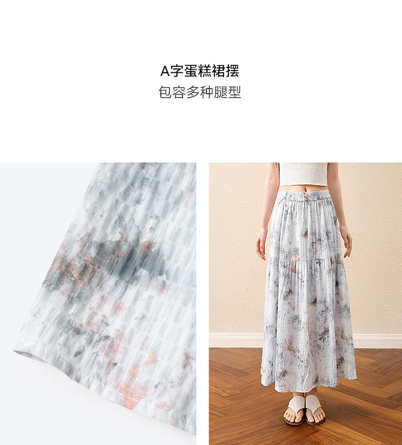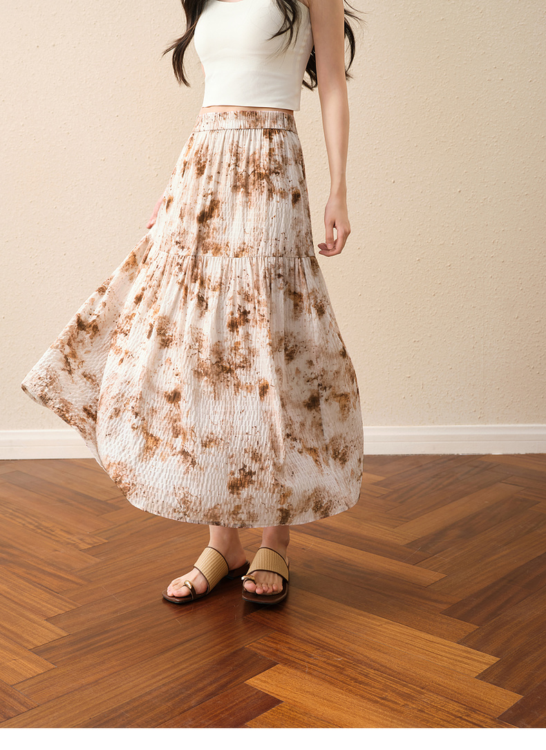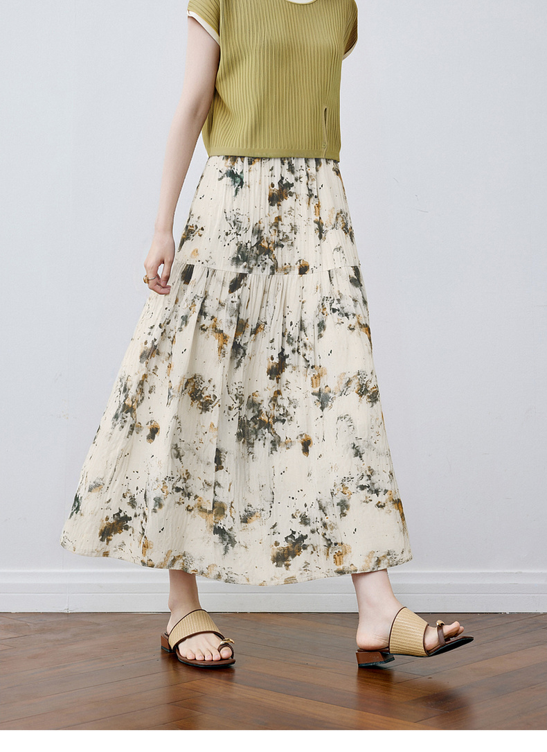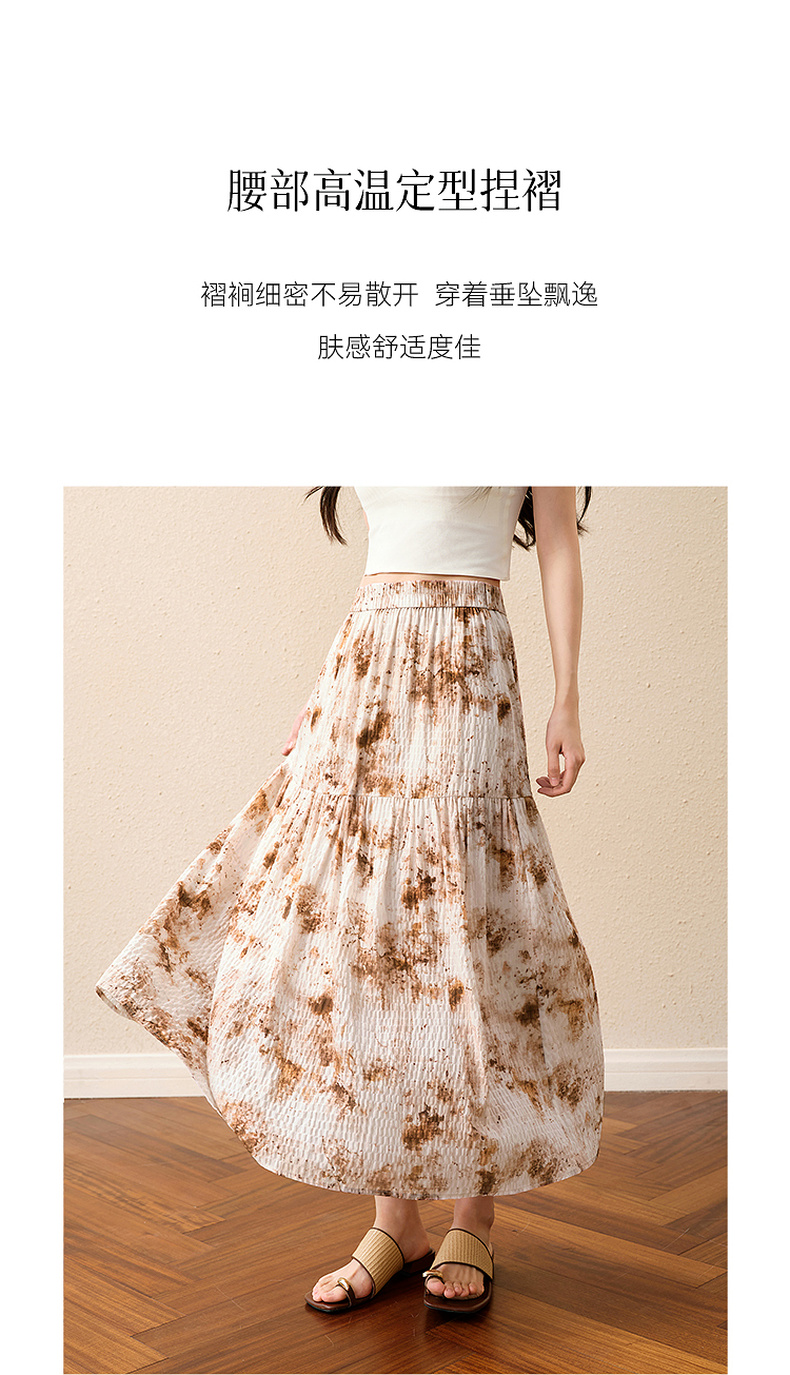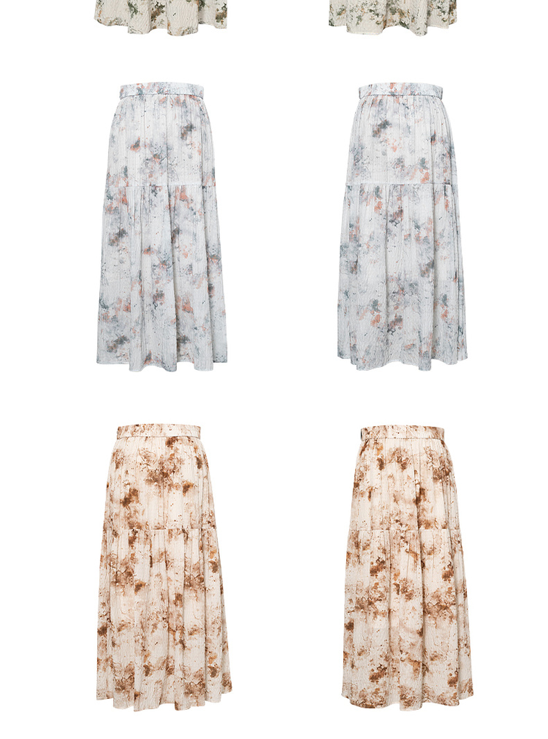 【严选】诗凡黎水墨晕染印花半身裙2025秋新款轻薄显瘦捏褶A字蛋糕半裙女7G7140461