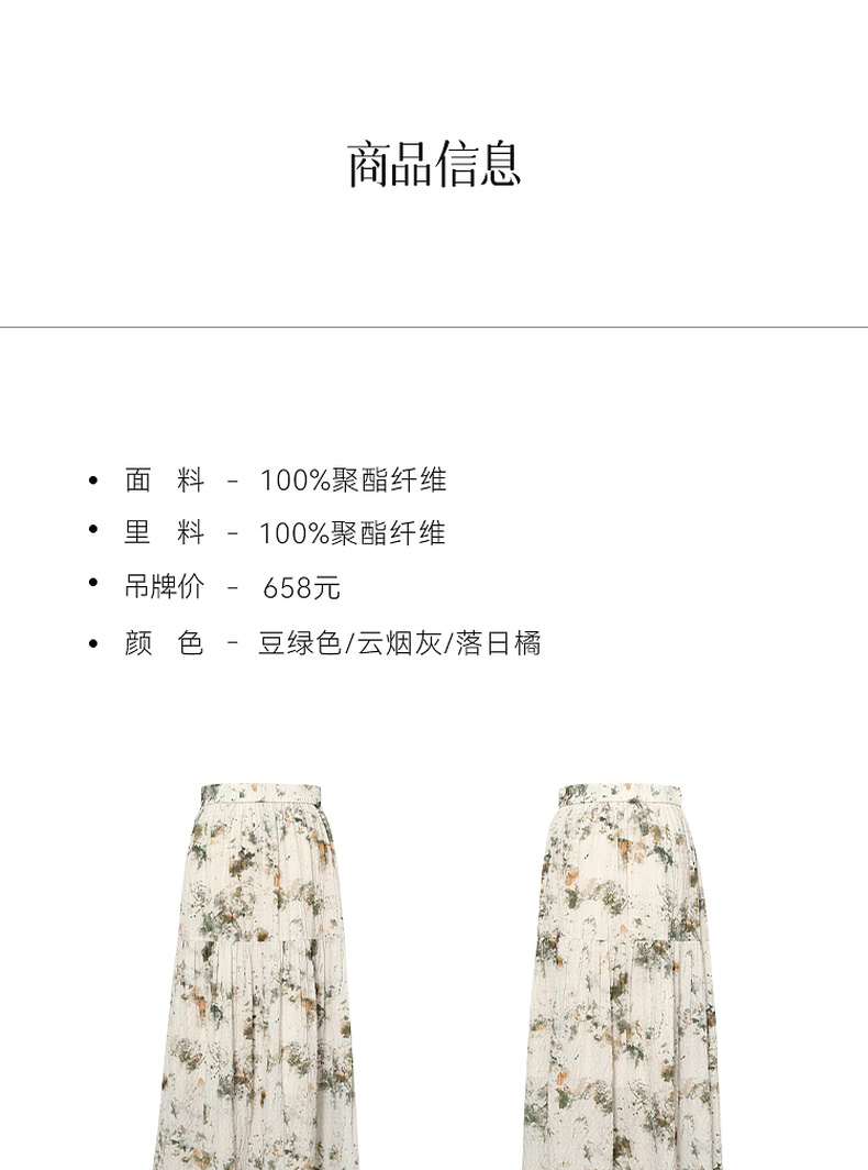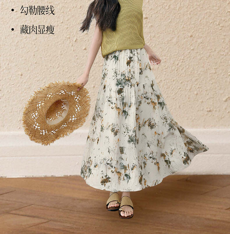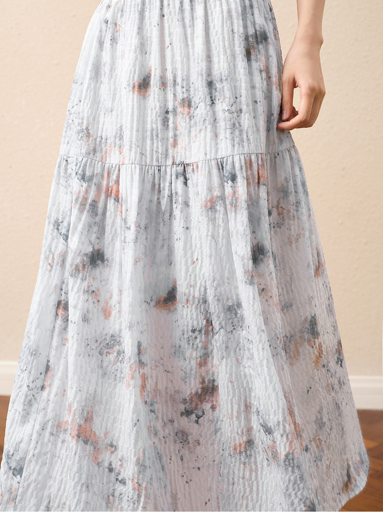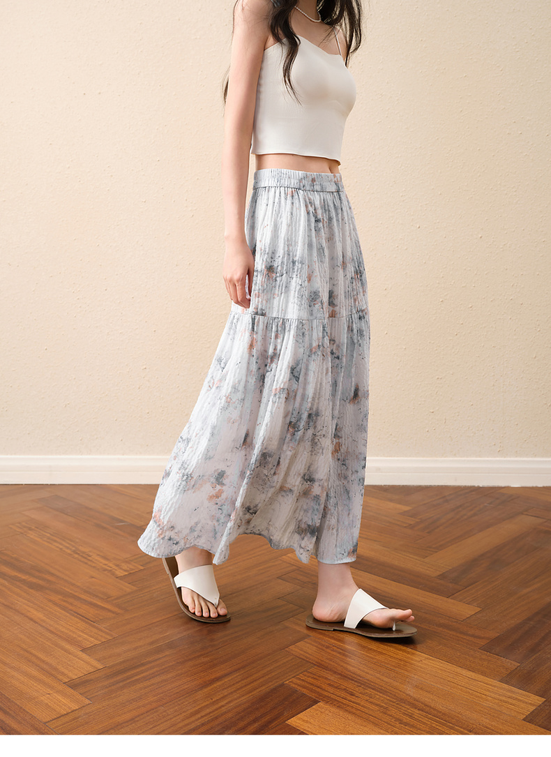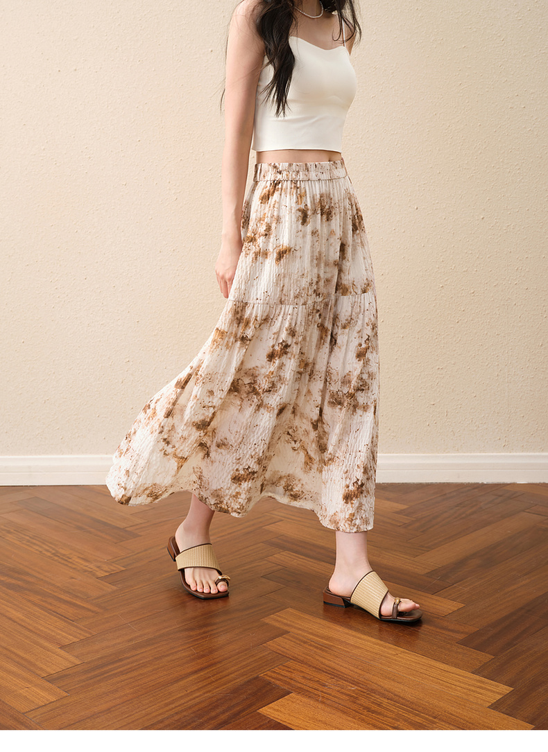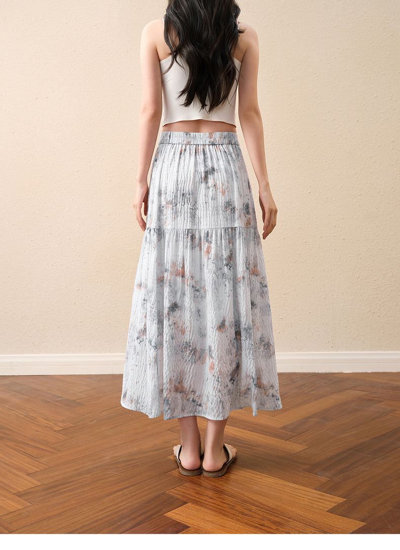 【严选】诗凡黎水墨晕染印花半身裙2025秋新款轻薄显瘦捏褶A字蛋糕半裙女7G7140461