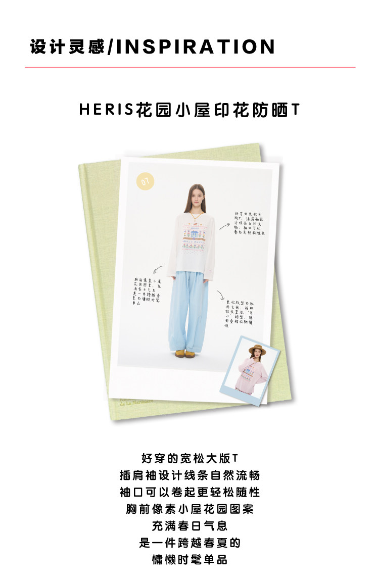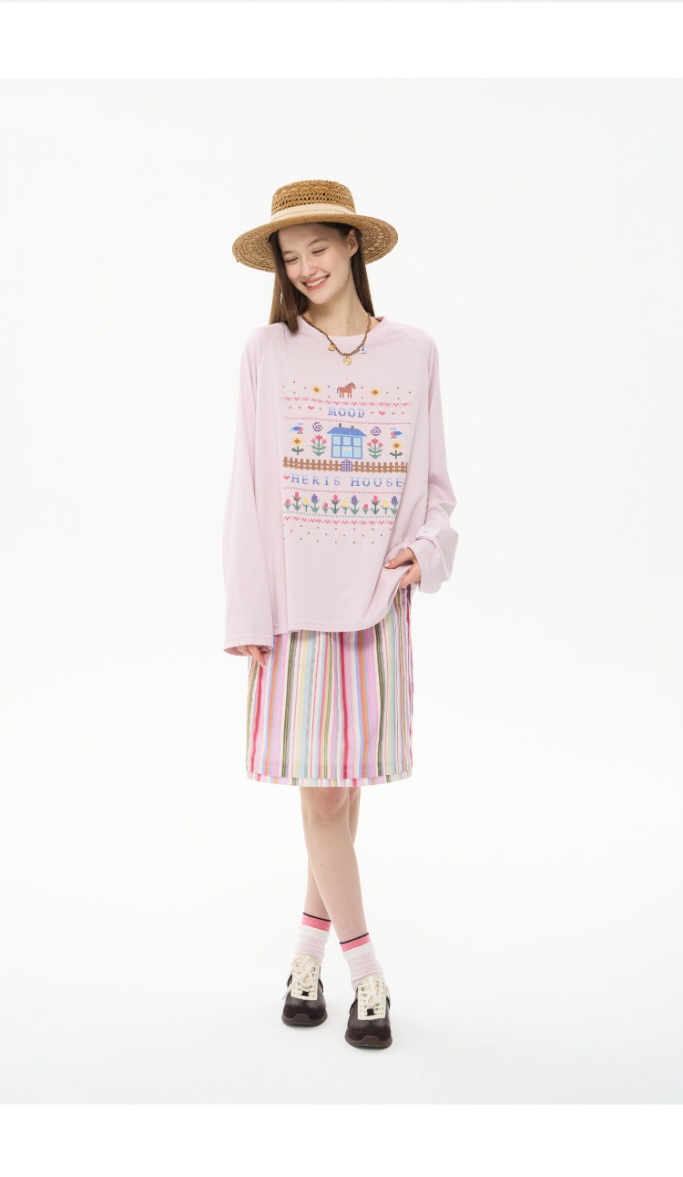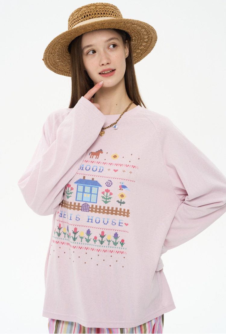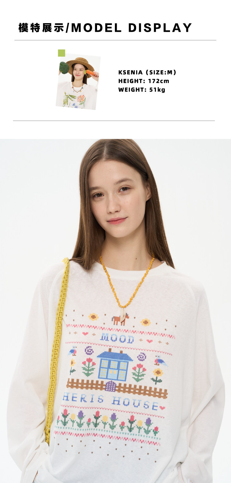heris/H61111/花园小屋印花 薄透雪花棉防晒 宽松大版型针织长袖T