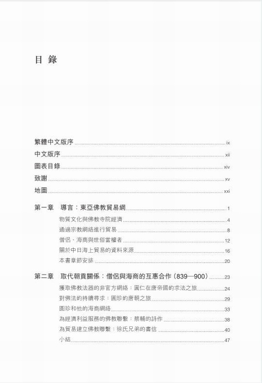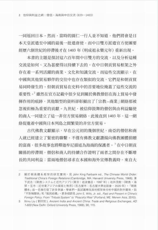 從西元839年最後一次日本遣唐使歸國,到1403年日本足利幕府與明朝正式恢復官方朝貢貿易,中日兩國的官方外交中斷了近六個世紀。但在此期間,隨着海商和佛教僧侶建立起日益密切的聯繫,一個充滿活力的中日海上貿易網絡蓬勃發展。基於對寺院記錄、詩歌、書信、傳世圖像和實物以及考古發現等多類史料的細緻研究,本書描繪了當時東亞海域世界生動多彩的景象,展示了海商與僧侶兩個群體如何利用彼此的資源並密切合作,共同促進貿易網絡與宗教網絡的融合,聯合構建了中日之間「宗教-商業」交流網絡,以及這一網絡如何在朝貢體系的框架之外運作。同時,本書以新穎的手法詮釋佛教記錄,為佛教與商業之間的關係提供了新的解讀。