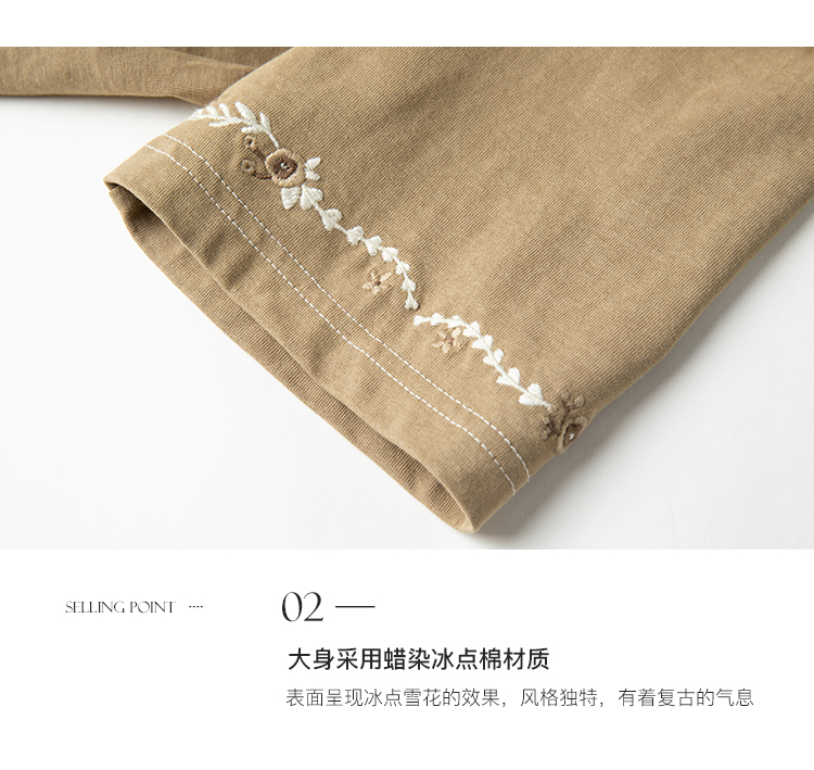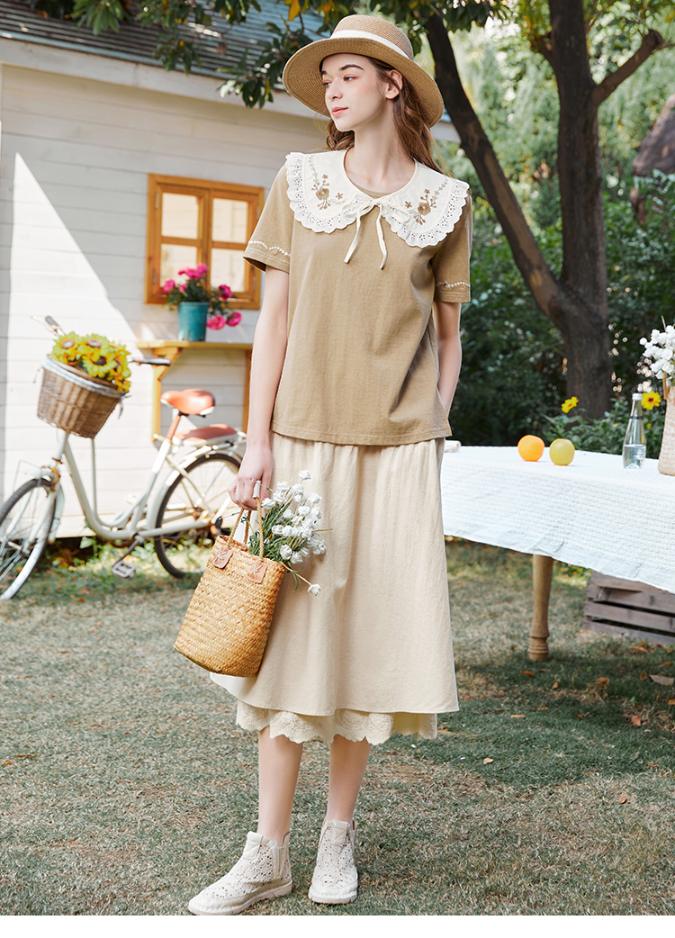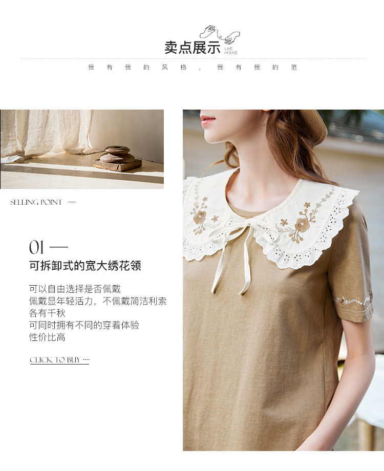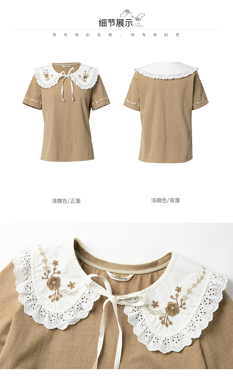 Famecoco范可儿万能T恤女夏季减龄绣花领内搭打底衫纯棉FAB3BB003