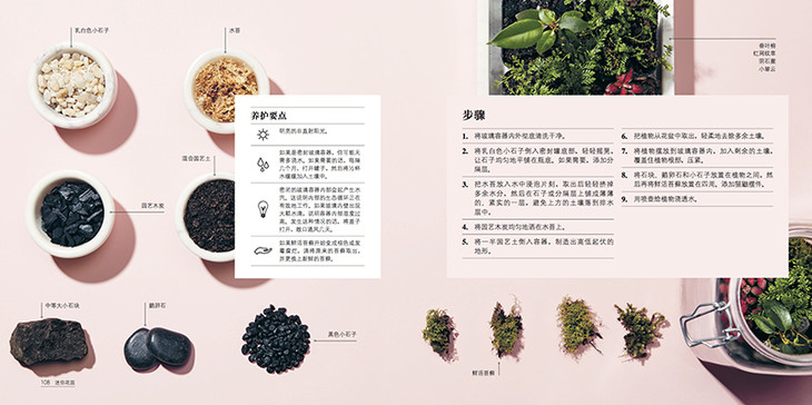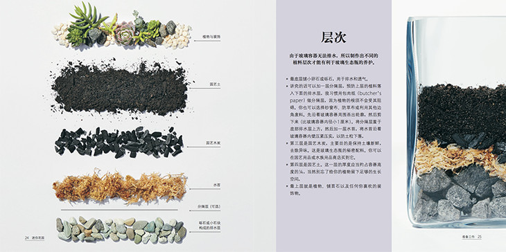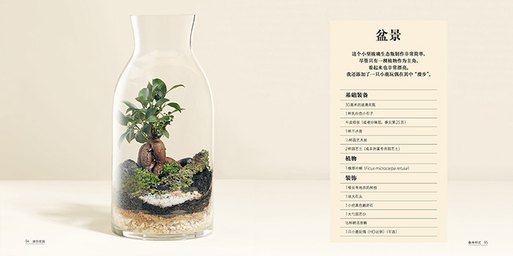 欢迎来到玻璃生态瓶的奇妙世界。这些微型生物群究竟是什么?玻璃生态瓶实际上就是装了泥土、石块和植物的玻璃容器。这些迷你花园模仿着真实世界的景观,为室内空间增添绿意,带来大自然的气息。玻璃生态瓶维护需求低,而且十分简单。“可是我总是把花养死!”我已经听到有人这么说了。别担心,玻璃生态瓶将是你完美的绿植伴侣。我生活在一座大城市中,生活方式也和大多城市居民一样,每天花很多时间盯着电脑屏幕,与大自然接触甚少。家中虽然也有星星点点的几棵植物装点门面,只不过它们常常垂头丧气的,每次度假回来,它们多半已经枯萎。我总说自己是“懒惰的养花人”,常常忘记给我的植物浇水。我曾经对盆栽十分着迷,可不幸的是发生了许多“惨剧”。盆栽需要精心维护,和我“悠闲”的养花方式并不契合。大约7年前,在一家旧货商店闲逛时,我偶然发现了一本1975年出版的关于玻璃生态瓶的旧书。书中全是玻璃生态瓶的照片,那些封闭玻璃容器中的微型生态群,就像一个个迷你花园,令人着迷。这些迷你花园的魅力之处不仅在于它们的颜值,还在于它们自给自足的生态环境。我立刻就被吸引住了!很快,我把每一个能找到的玻璃容器都变成绿意盎然的小世界。我通过网络、二手商店和集市,搜罗各种各样奇形怪状的玻璃器皿,然后利用它们创作迷你花园。我变成了玻璃生态瓶控!它将我所喜爱的设计、自然以及一切“迷你”的东西结合在一起。工作时与植物、自然接触的感觉让我迷恋不已。很快我们家就堆满了各种生态瓶,于是我产生了经营生态瓶生意的念头。不久之后,我的迷你花园就开始出现在墨尔本街头巷尾的商店、咖啡馆和办公室中。现代玻璃生态瓶重新开始流行,而我很幸运,成为这股潮流的一分子。在这本书中,我将介绍如何制作属于你自己的迷你花园。像我一样,你不需要具备高深的园艺技巧,也能成为这方面园艺家。本书将一步步指导你创作美丽的玻璃生态艺术品,不论季节、天气如何,它将常年陪伴着你。我们将学习关于土壤、岩石和苔藓的基础知识,学习使用各种工具进行种植,学习如何选择植物、容器以及装饰物。书中还有16种样式供你参考,你将发现玻璃生态瓶是多么简单而又多样。很快你就能学会并创造属于你自己的迷你花园,这也能作为完美的“绿色”礼物,它会比花束更让人激动。希望你和我一样享受这种微型园艺的快乐。