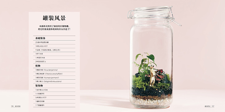 《迷你花园:打造你的玻璃生态瓶》呈现了玻璃生态瓶的基本要素、制作、养护以及16款创意作品,令人跃跃欲试,根据作品实例创造自己的迷你花园