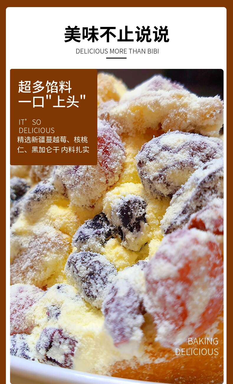 【配料】白麦:小麦粉、鸡蛋、纯牛奶、黄油、木糖醇、奶油奶酪、核桃仁、黑加仑、蔓越莓、奶粉、酵母粉