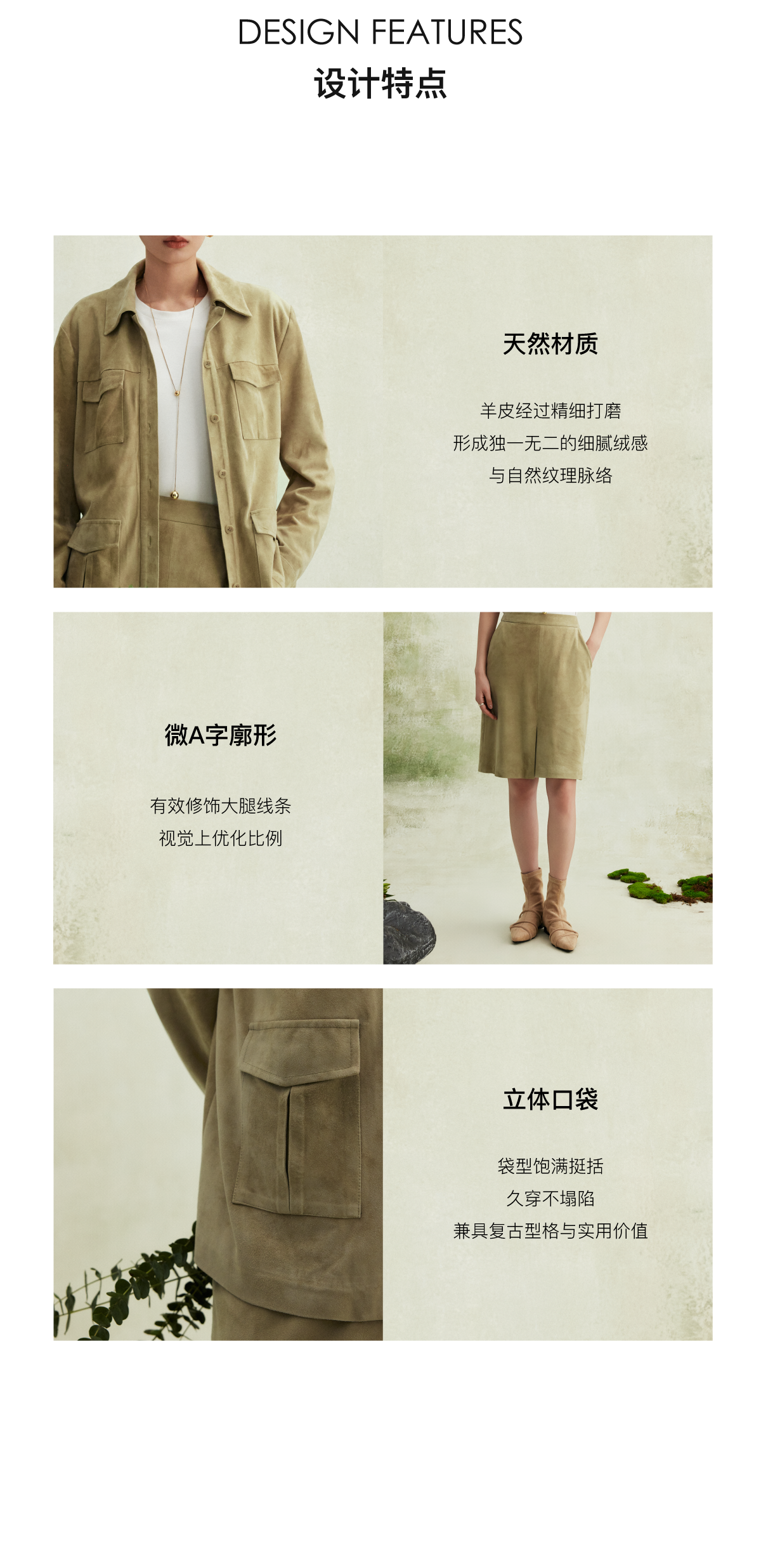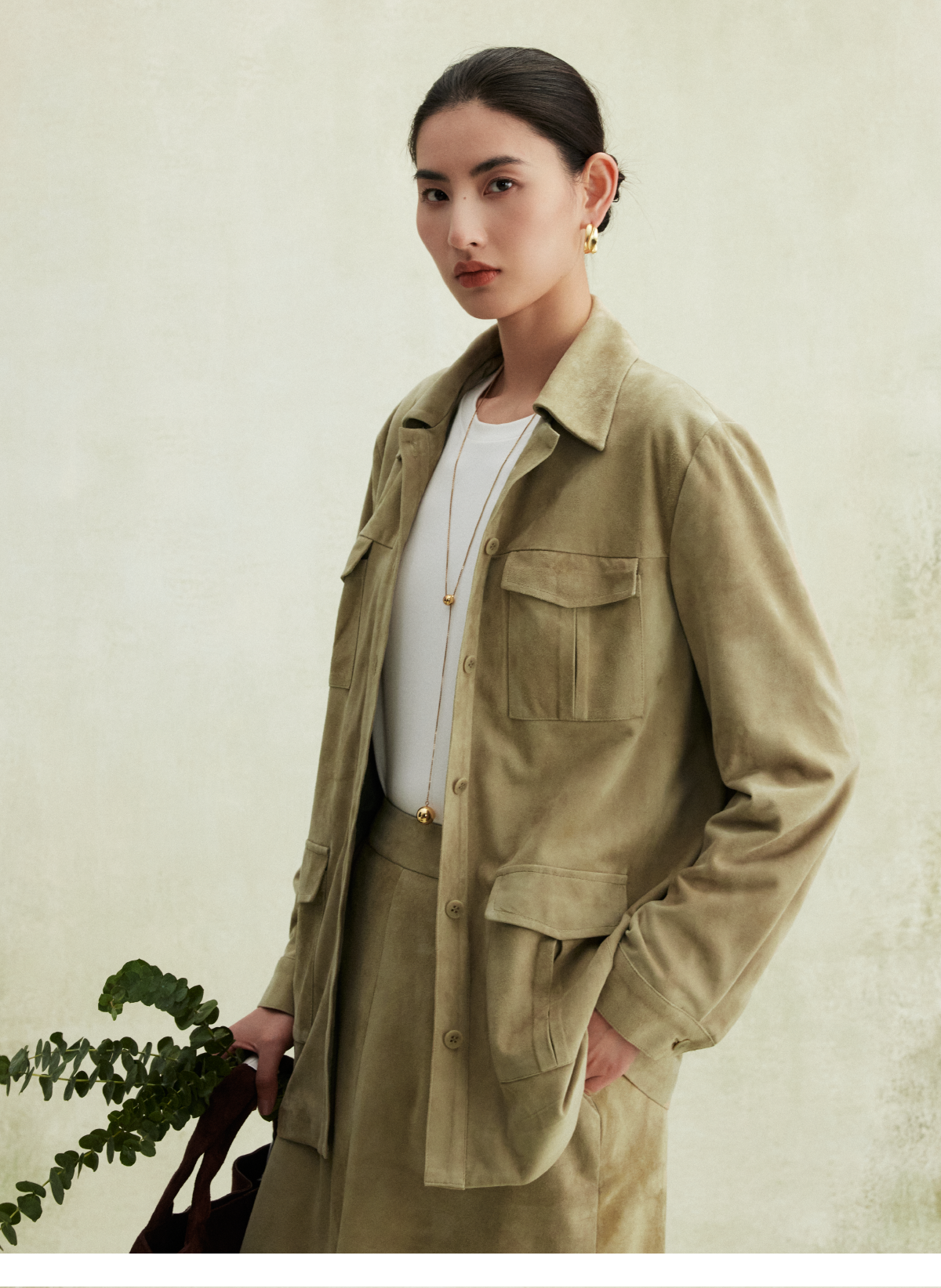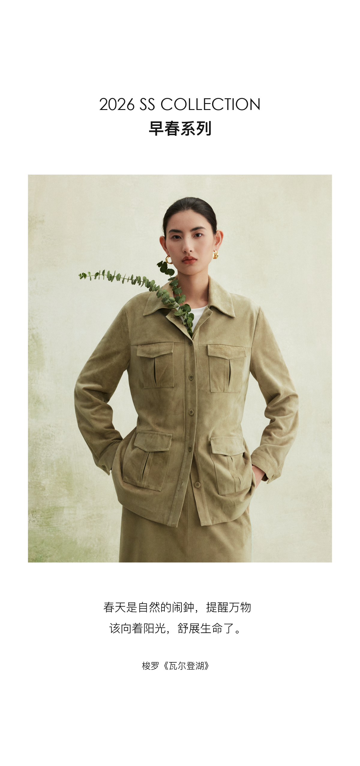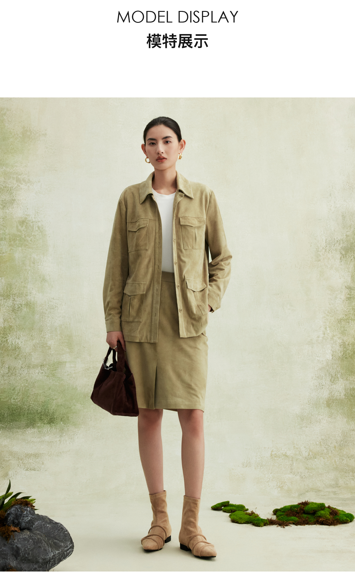 LIYIHAN 2026春新款通勤羊皮外套女杏绿色小众设计感衬衫夹克套装