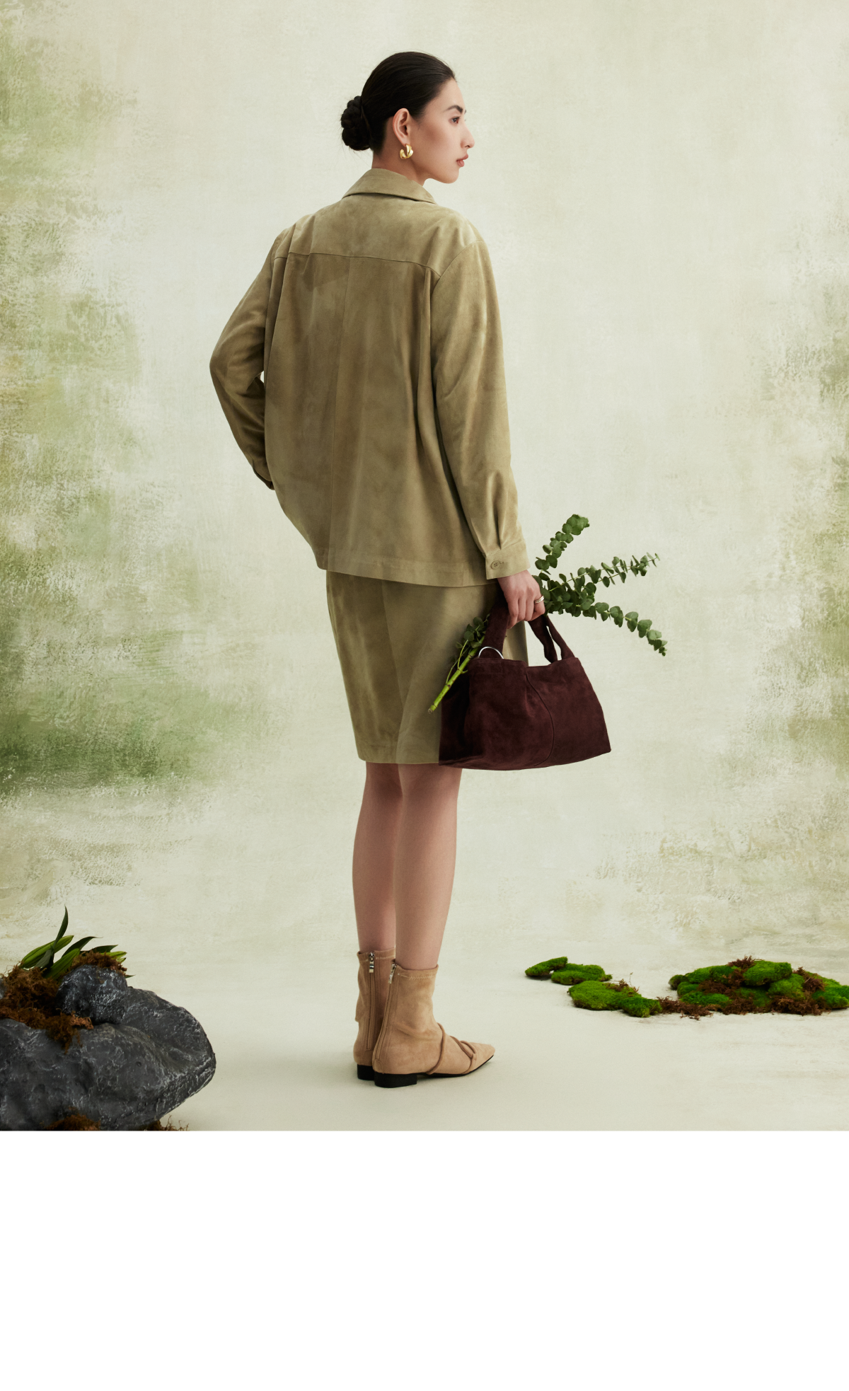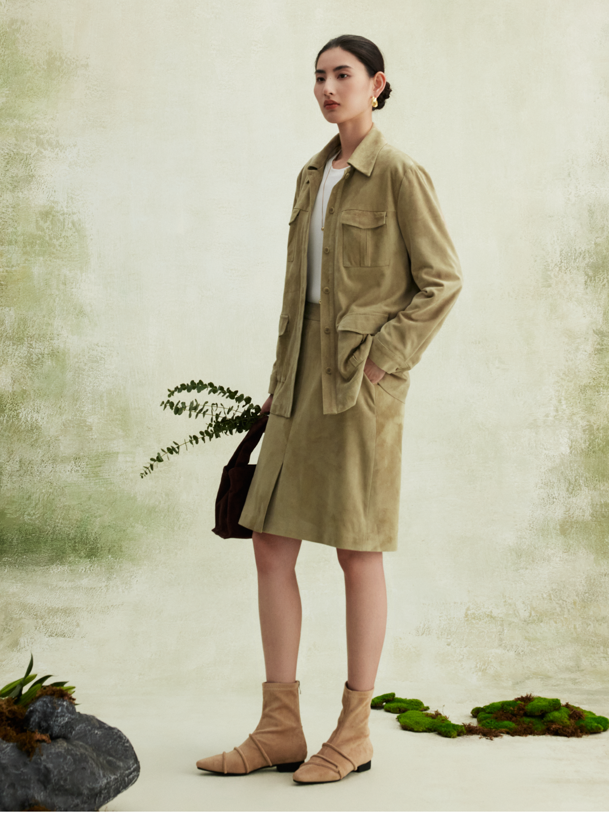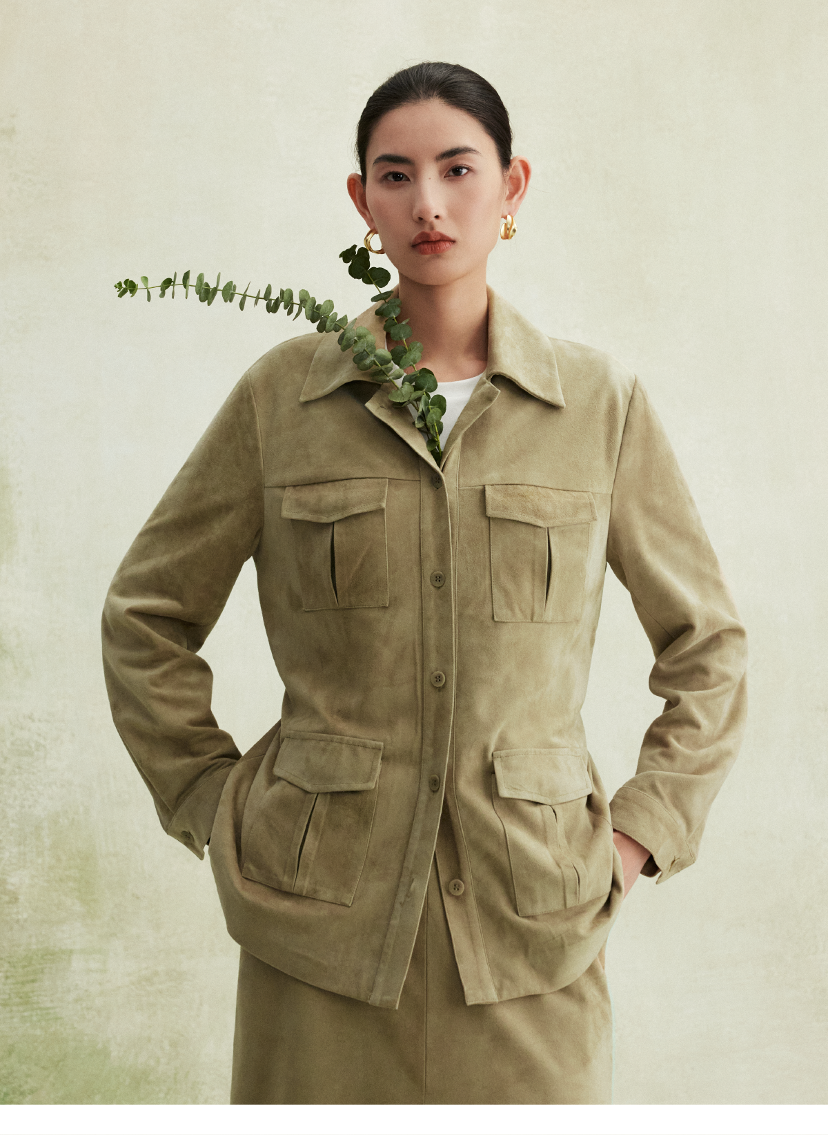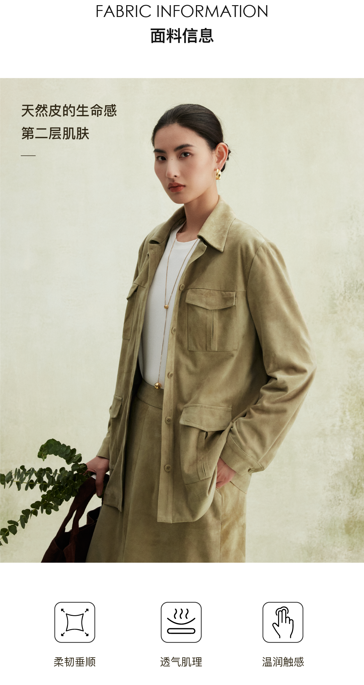 LIYIHAN 2026春新款通勤羊皮外套女杏绿色小众设计感衬衫夹克套装