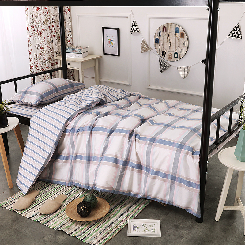 注:此款学院格学生三件套床单尺寸比其它款床单略小一些,为115*215CM(适合90CM宿舍床),被套尺寸155210CM,枕套40*72CM