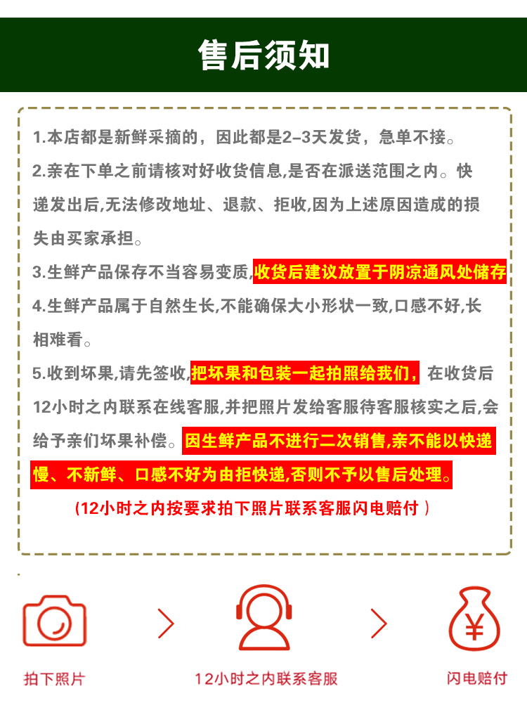 备注: 1. 冬枣因皮薄肉脆,不耐运输,糖度高,脱水快,收到要尽快食用,冷藏3小时后口感更佳 2.南荔枝,北冬枣,庙上冬枣地处运城盆地,背靠黄土高坡,紧临滚滚黄河,日照久,温差大。 售后标准:5个内坏果不售后,超出的按每颗赔付0.2元