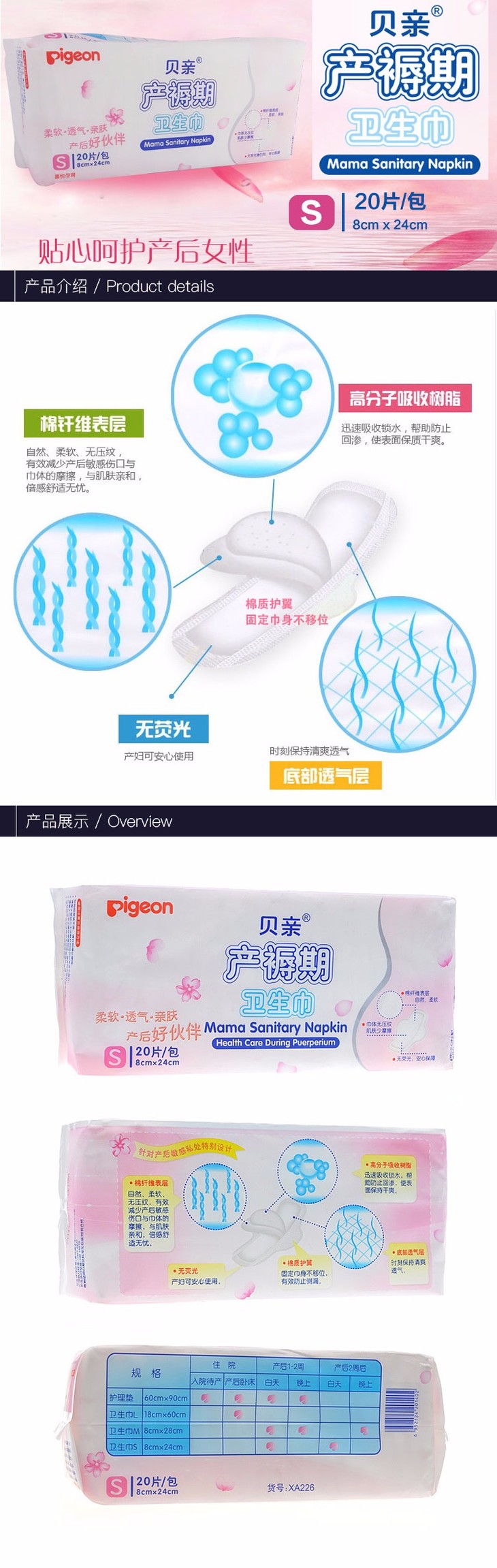 【一般贸易】贝亲产褥期卫生巾S-20片(8*24CM)XA226