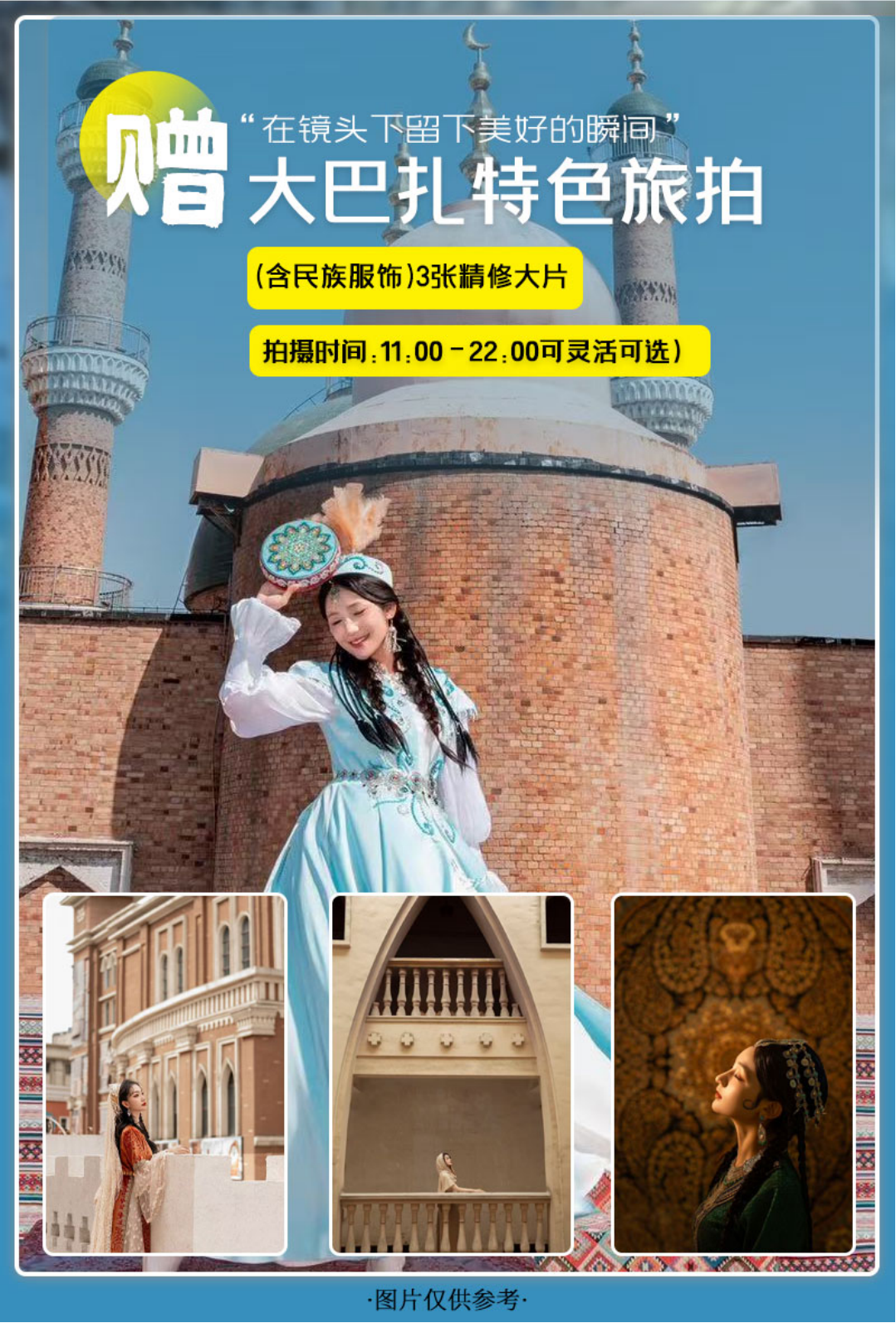 9.大巴扎旅拍3张精修(不含妆造,赠送项目因个人原因不去不退,仅限10.00-22.00预约)